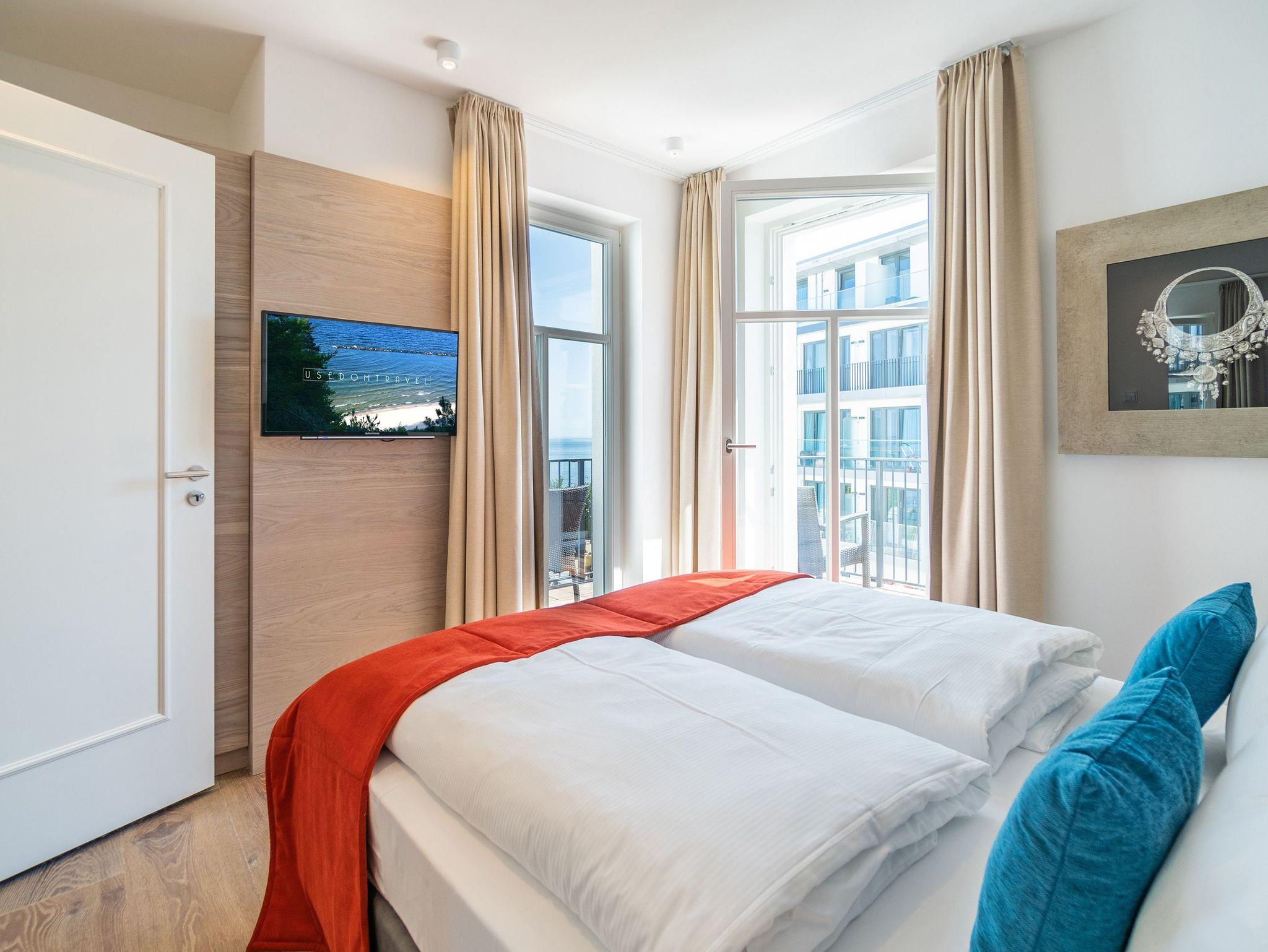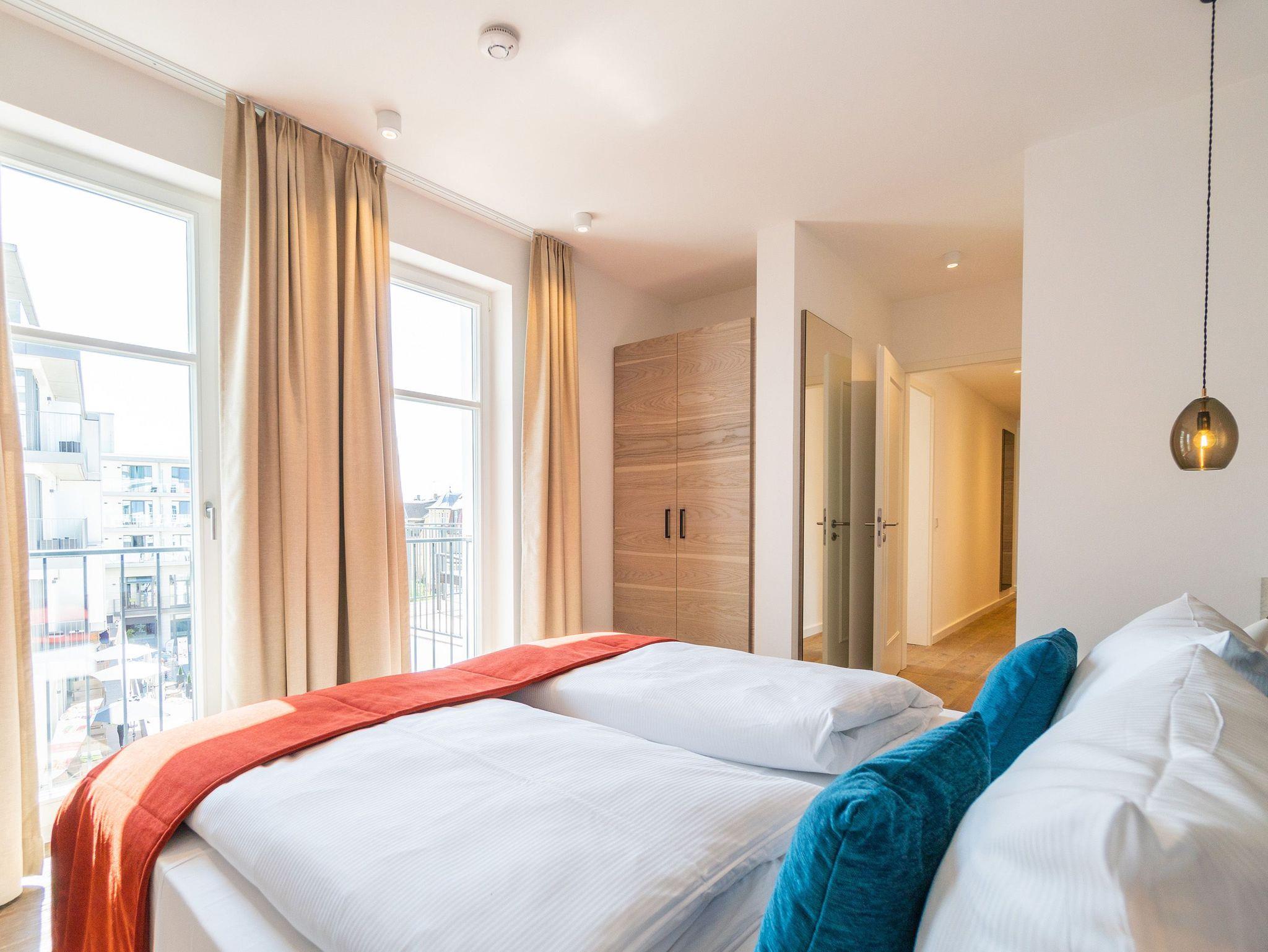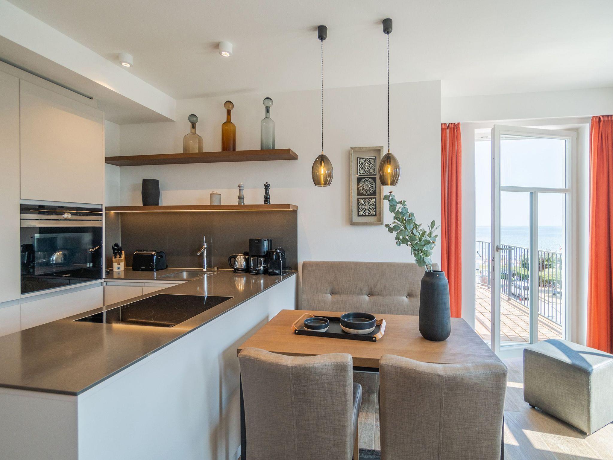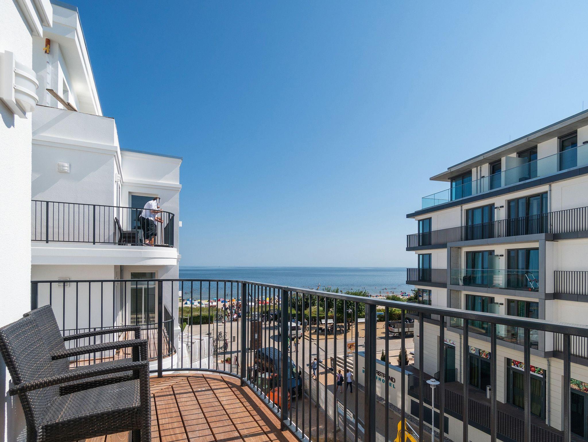 Ob mit der Familie oder mit Freunden ? auf diesen 69 Quadratmetern Urlaubsparadies wird Ihre Auszeit zu einem ganz besonderen Erlebnis. Allein der Blick vom Süd-Ost-Balkon über die endlose Weite der Ostsee ist Erholung pur. Tanken Sie hier schon morgens beim Frühstück Sonne satt. Bis zu vier Personen und ein Kleinkind bis drei Jahre (im Kinderreisebett) werden sich in den drei Räumen dieses stylischen Appartements pudelwohl fühlen. Erlesen und edel ist die Inneneinrichtung ? vom Innenarchitekten konzipiert und arrangiert. Ein geräumiges Wohn-Ess-Zimmer wartet nur darauf, Ihnen alle Annehmlichkeiten zu bieten, die Sie sich wünschen können: Vom Home-Entertainment des großen Flat-TVs und der Bose-Soundanlage, die Sie via Bluetooth mit Ihrem Handy bedienen können, über das bequeme Sofa zum Relaxen, den kuscheligen Gas-Kamin, der Gemütlichkeit auf Knopfdruck zaubert, bis hin zum edlen und schönen Esstisch, an dem Sie gemeinsam viele Muße- und Genussstunden verbringen können. Die Steinwand, die im Wohnzimmer einen absolut trendigen Akzent setzt, verleiht dem Raum durch ihre raue Naturstruktur das gewisse Etwas. Für kulinarische Urlaubsgenüsse sorgt die voll ausgestattete Küche. Kochen und vergnügen Sie sich an der freistehenden Kochinsel. Erlesenes Geschirr rundet die Gaumenfreuden mit optischem Pfiff ab. Wenn der Wunsch nach Rückzug aufkommt, bieten die beiden Schlafzimmer mit bequemen Boxspringdoppelbetten (einmal 1,80 m x 2,00 m und einmal 1,60 m x 2,00 m) die ideale Fläche für entspannende Stunden. Von beiden Schlafzimmern aus können Sie auf die Ostsee hinaus schauen. Von einem Schlafzimmer aus sogar via Balkon. Viel Ablageflächen finden Sie in den Schränken. Zwei Flat-TVs sorgen für digitale Unterhaltung. Das Appartement verfügt gar über zwei Badezimmer, die jeweils mit geräumiger Regendusche, großzügigem Waschtisch und WC ausgestattet sind. Zeigt die Ostsee einmal ihr stürmisch ungemütliches Gesicht, können Sie in der Finnischen Sauna, die zu der Wohnung gehört und direkt in eines der Bäder eingebaut ist, bei wohliger Wärme ausspannen und entspannen. Genießen Sie Ihren Urlaub! Wir kümmern uns um den Rest. So sind bei Ihrer Ankunft die Betten für Sie bezogen und Handtücher liegen bereit. In einem kleinen Hauswirtschaftsraum finden Sie einen Waschtrockner. Das WLAN ist natürlich kostenfrei. In der ultramodernen Parkgarage ist für Ihr Feriendomizil der Pkw-Stellplatz Nr. 22 reserviert.