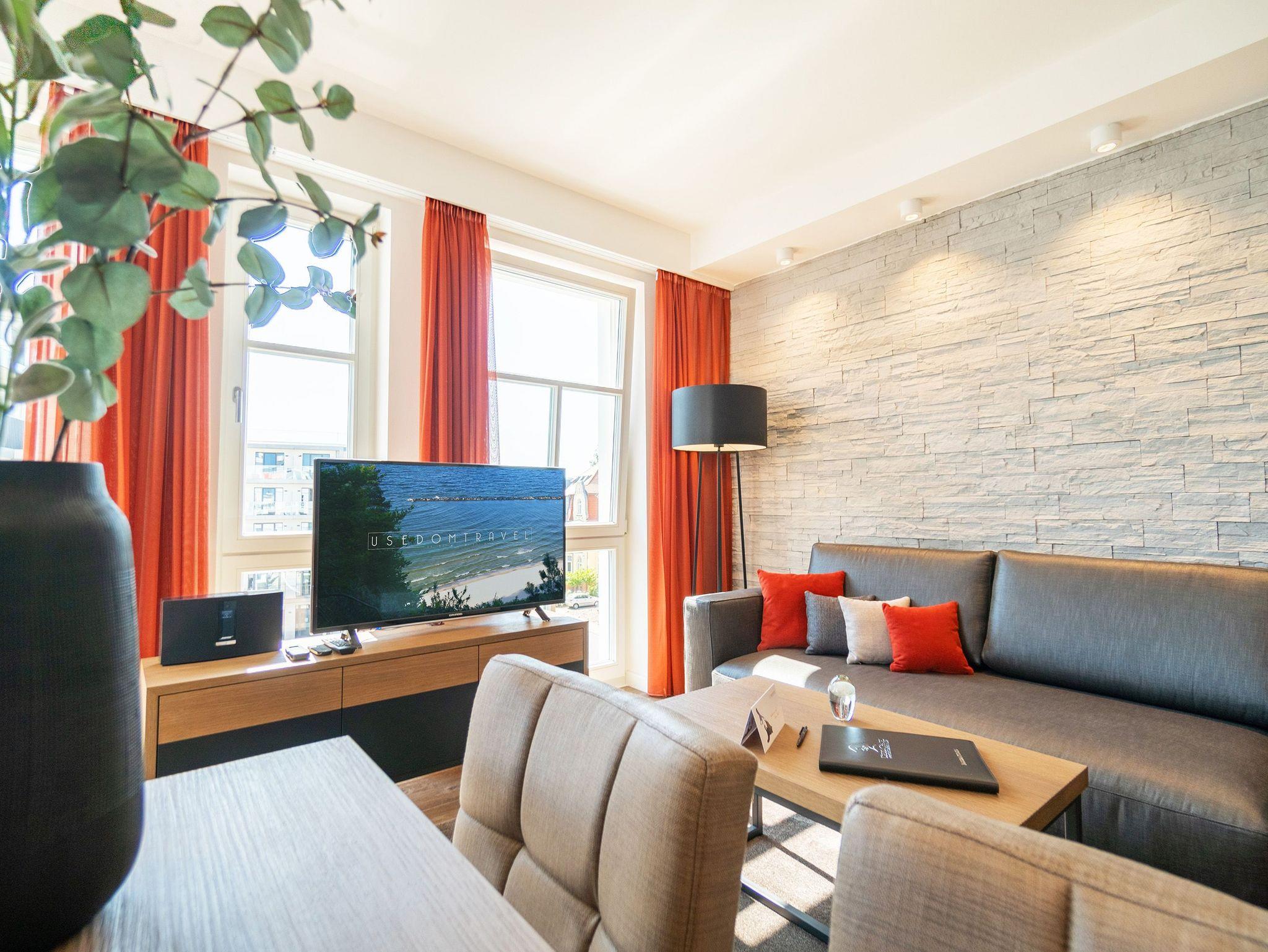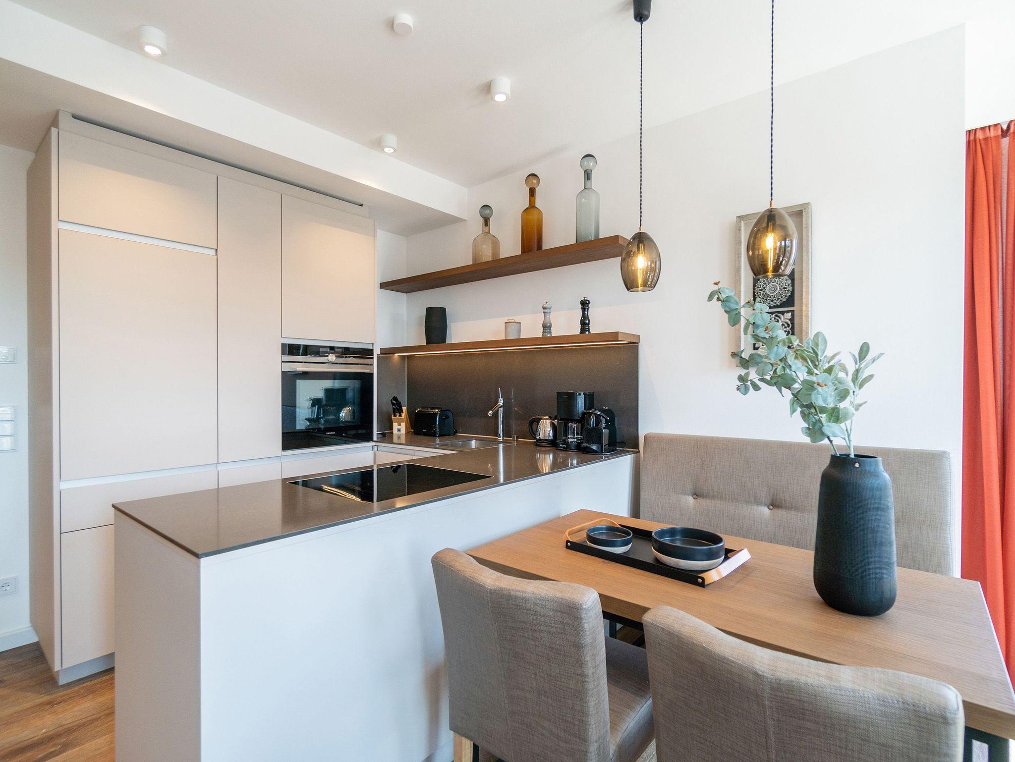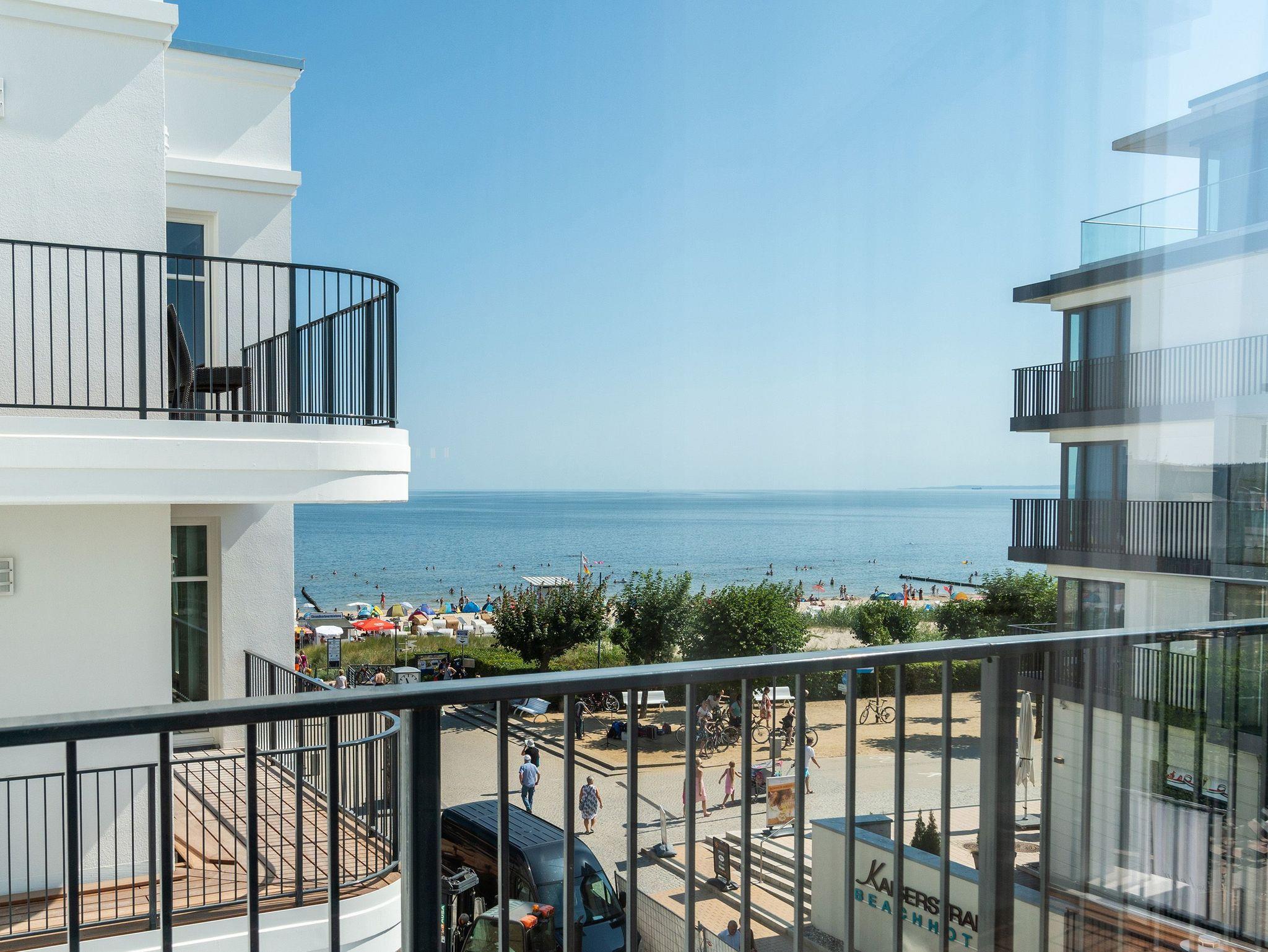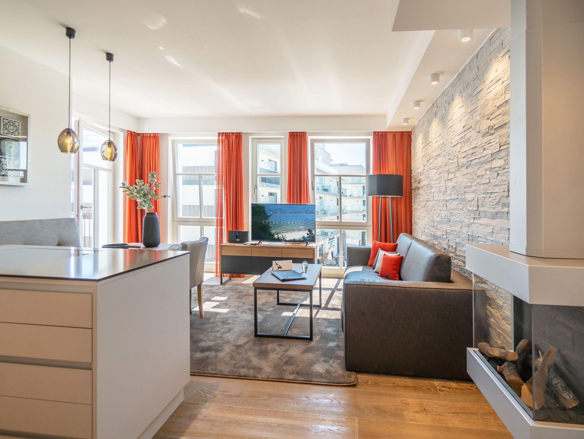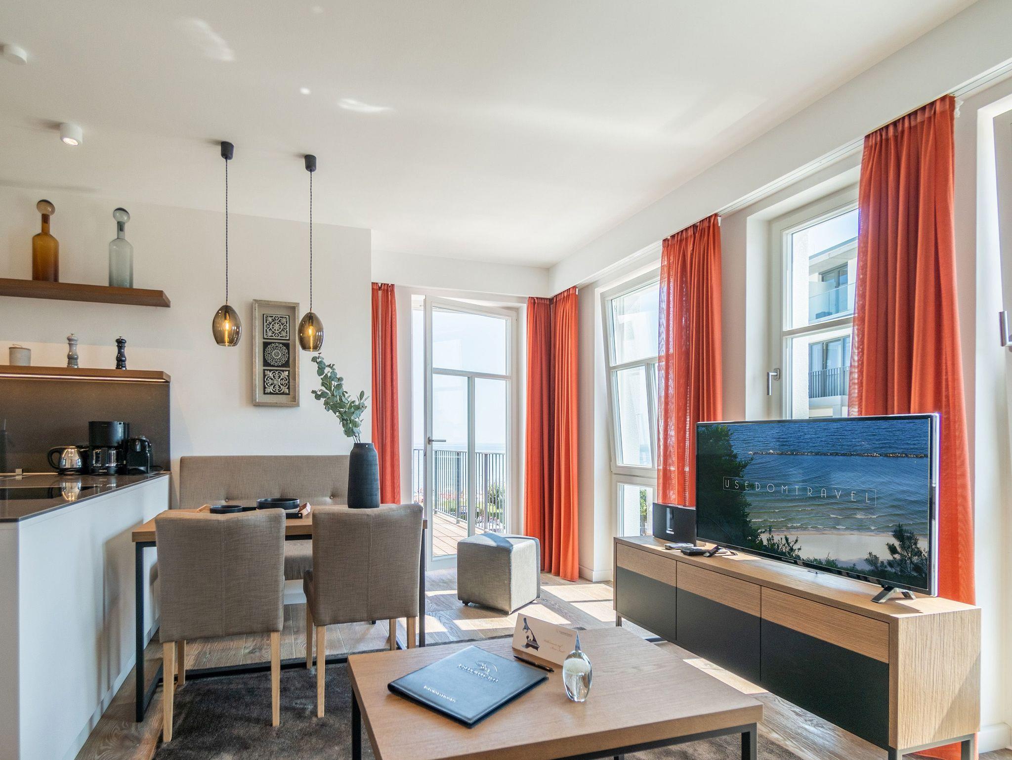 Ob mit der Familie oder mit Freunden ? auf diesen 69 Quadratmetern Urlaubsparadies wird Ihre Auszeit zu einem ganz besonderen Erlebnis. Allein der Blick vom Süd-Ost-Balkon über die endlose Weite der Ostsee ist Erholung pur. Tanken Sie hier schon morgens beim Frühstück Sonne satt. Bis zu vier Personen und ein Kleinkind bis drei Jahre (im Kinderreisebett) werden sich in den drei Räumen dieses stylischen Appartements pudelwohl fühlen. Erlesen und edel ist die Inneneinrichtung ? vom Innenarchitekten konzipiert und arrangiert. Ein geräumiges Wohn-Ess-Zimmer wartet nur darauf, Ihnen alle Annehmlichkeiten zu bieten, die Sie sich wünschen können: Vom Home-Entertainment des großen Flat-TVs und der Bose-Soundanlage, die Sie via Bluetooth mit Ihrem Handy bedienen können, über das bequeme Sofa zum Relaxen, den kuscheligen Gas-Kamin, der Gemütlichkeit auf Knopfdruck zaubert, bis hin zum edlen und schönen Esstisch, an dem Sie gemeinsam viele Muße- und Genussstunden verbringen können. Die Steinwand, die im Wohnzimmer einen absolut trendigen Akzent setzt, verleiht dem Raum durch ihre raue Naturstruktur das gewisse Etwas. Für kulinarische Urlaubsgenüsse sorgt die voll ausgestattete Küche. Kochen und vergnügen Sie sich an der freistehenden Kochinsel. Erlesenes Geschirr rundet die Gaumenfreuden mit optischem Pfiff ab. Wenn der Wunsch nach Rückzug aufkommt, bieten die beiden Schlafzimmer mit bequemen Boxspringdoppelbetten (einmal 1,80 m x 2,00 m und einmal 1,60 m x 2,00 m) die ideale Fläche für entspannende Stunden. Von beiden Schlafzimmern aus können Sie auf die Ostsee hinaus schauen. Von einem Schlafzimmer aus sogar via Balkon. Viel Ablageflächen finden Sie in den Schränken. Zwei Flat-TVs sorgen für digitale Unterhaltung. Das Appartement verfügt gar über zwei Badezimmer, die jeweils mit geräumiger Regendusche, großzügigem Waschtisch und WC ausgestattet sind. Zeigt die Ostsee einmal ihr stürmisch ungemütliches Gesicht, können Sie in der Finnischen Sauna, die zu der Wohnung gehört und direkt in eines der Bäder eingebaut ist, bei wohliger Wärme ausspannen und entspannen. Genießen Sie Ihren Urlaub! Wir kümmern uns um den Rest. So sind bei Ihrer Ankunft die Betten für Sie bezogen und Handtücher liegen bereit. In einem kleinen Hauswirtschaftsraum finden Sie einen Waschtrockner. Das WLAN ist natürlich kostenfrei. In der ultramodernen Parkgarage ist für Ihr Feriendomizil der Pkw-Stellplatz Nr. 22 reserviert.