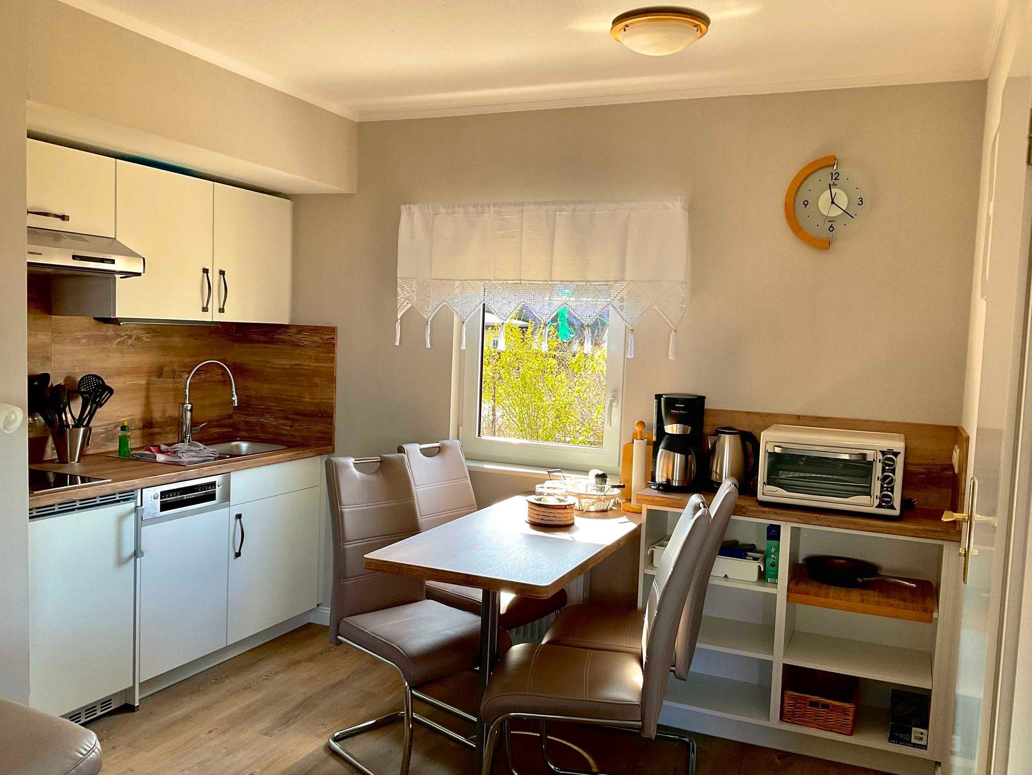 Die offene kleine Küche verfügt über einen Kühlschrank mit Gefriermöglichkeit Cerankochfeld, kleinem Backofen, Spülmaschine, Wasserkocher und Kaffeemaschine.
