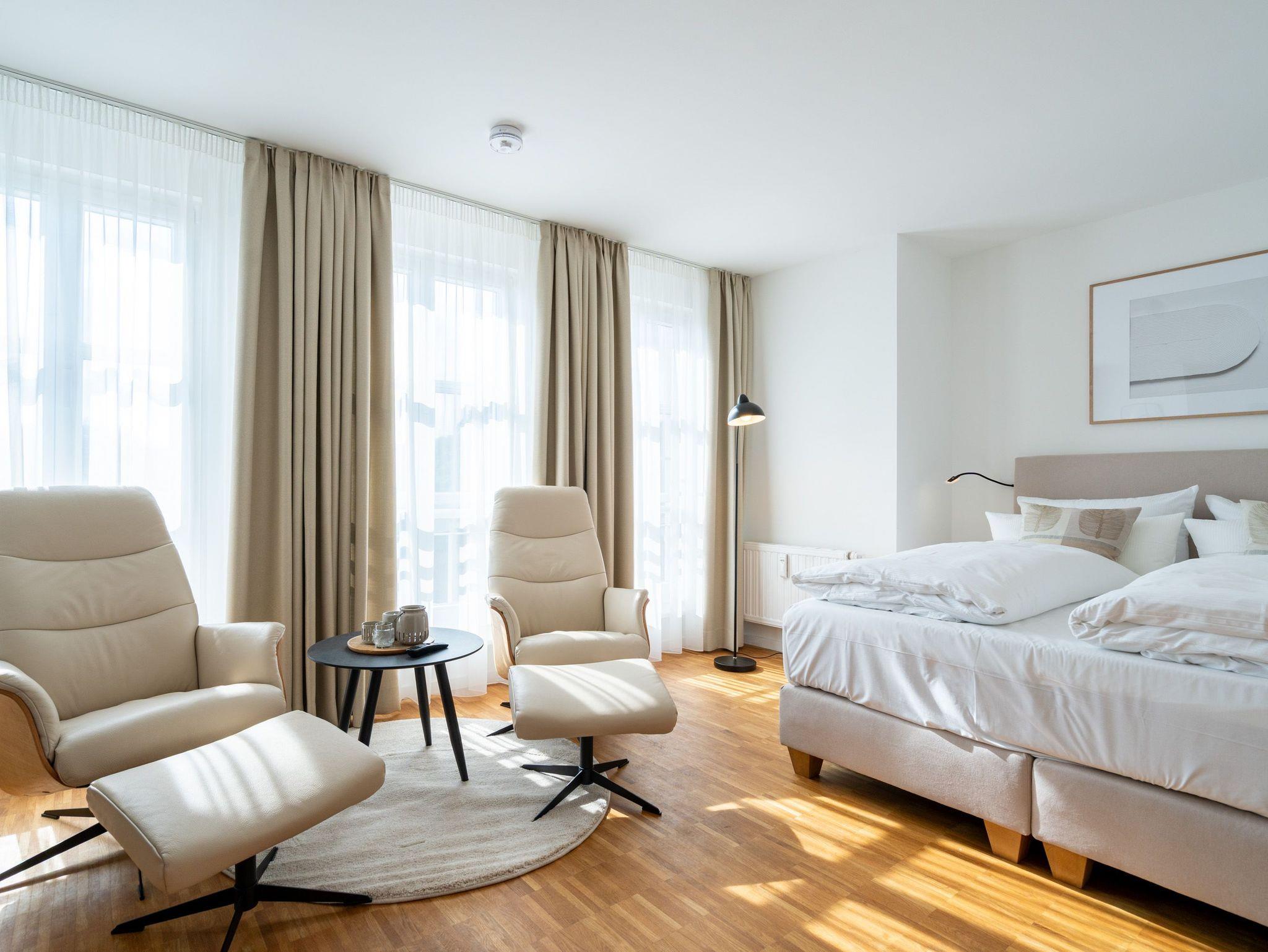 Klein, fein, einfach entspannen ? Ihr 1-Raum-Appartement Nr. 2 zum Wohlfühlen. Willkommen in Ihrem gemütlichen Rückzugsort für zwei! Dieses liebevoll eingerichtete 1-Raum-Appartement (28 m²) im Hochparterre bietet alles, was Sie für einen entspannten Urlaub zu zweit brauchen ? kompakt, stilvoll und durchdacht bis ins Detail. Der offene und helle Wohnbereich empfängt Sie mit einer modernen Küchenzeile, ausgestattet mit 2-Platten-Cerankochfeld, Spülmaschine, Kühlschrank mit Gefrierfach und einer Nespresso-Kapselmaschine ? perfekt für das erste Frühstück oder den kleinen Snack zwischendurch. Am Essplatz für zwei genießen Sie Ihre Mahlzeiten ganz entspannt mit Blick ins Grüne. Zum Entspannen laden zwei bequeme Relaxsessel mit Hockern ein ? perfekt für einen Filmabend am 55-Zoll-Flat-TV oder einfach zum Füßehochlegen. Für erholsame Nächte sorgt das komfortable Boxspringdoppelbett (1,60?m x 2,00?m), ein geräumiger Kleiderschrank bietet Platz für Ihr Urlaubsgepäck. Das kleine Duschbad ist funktional und gepflegt ? mit Waschtisch und WC. Ein PKW-Stellplatz (Nr. 2) steht Ihnen direkt vor dem Haus zur Verfügung, ebenso wie kostenfreies WLAN ? damit Sie auch im Urlaub bestens vernetzt bleiben. Ideal für Paare oder Alleinreisende, die auf Komfort nicht verzichten wollen ? willkommen in Ihrer kleinen Auszeit!