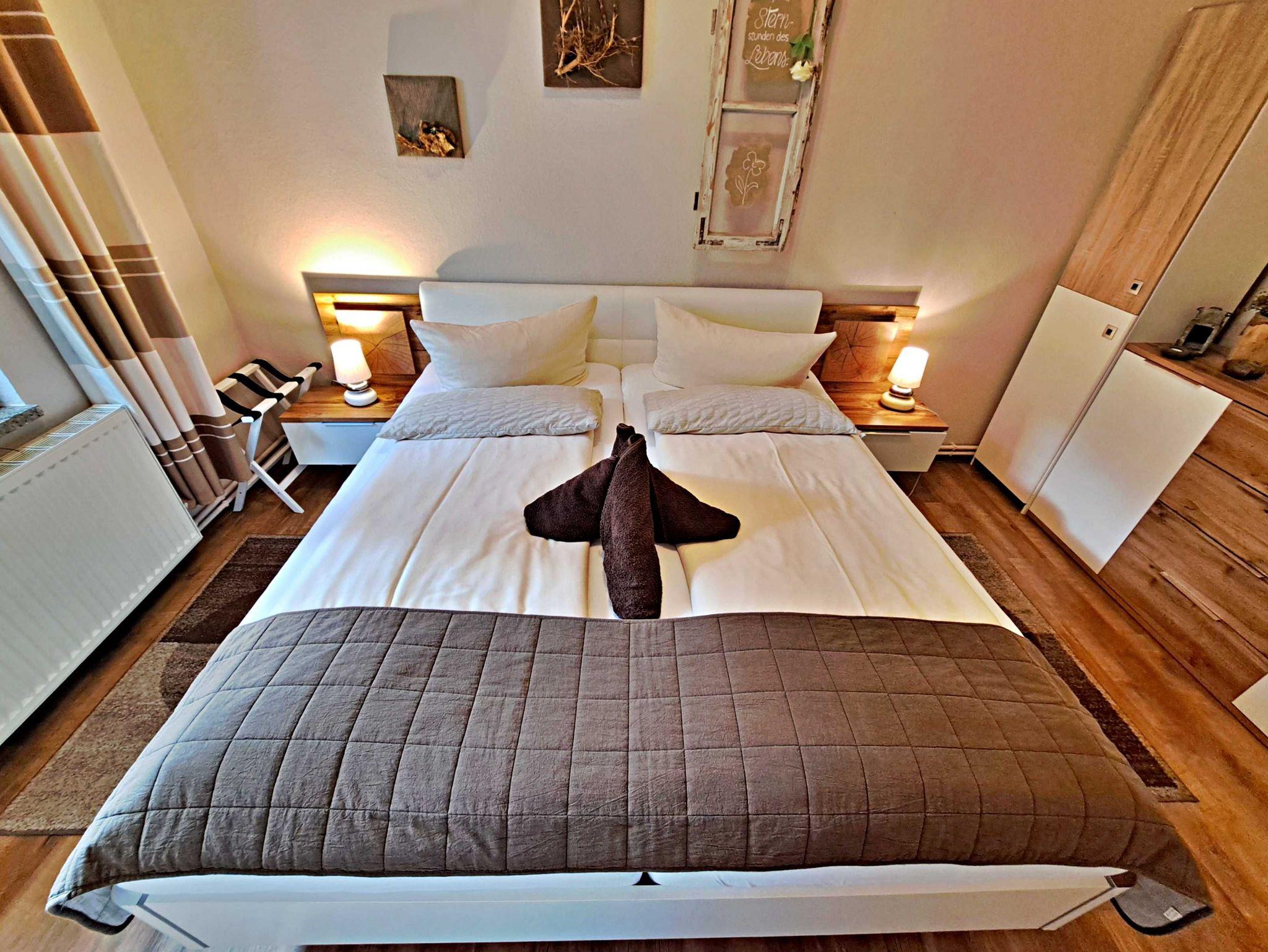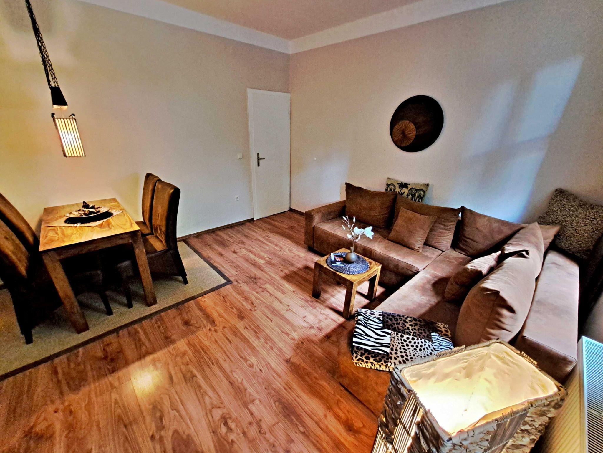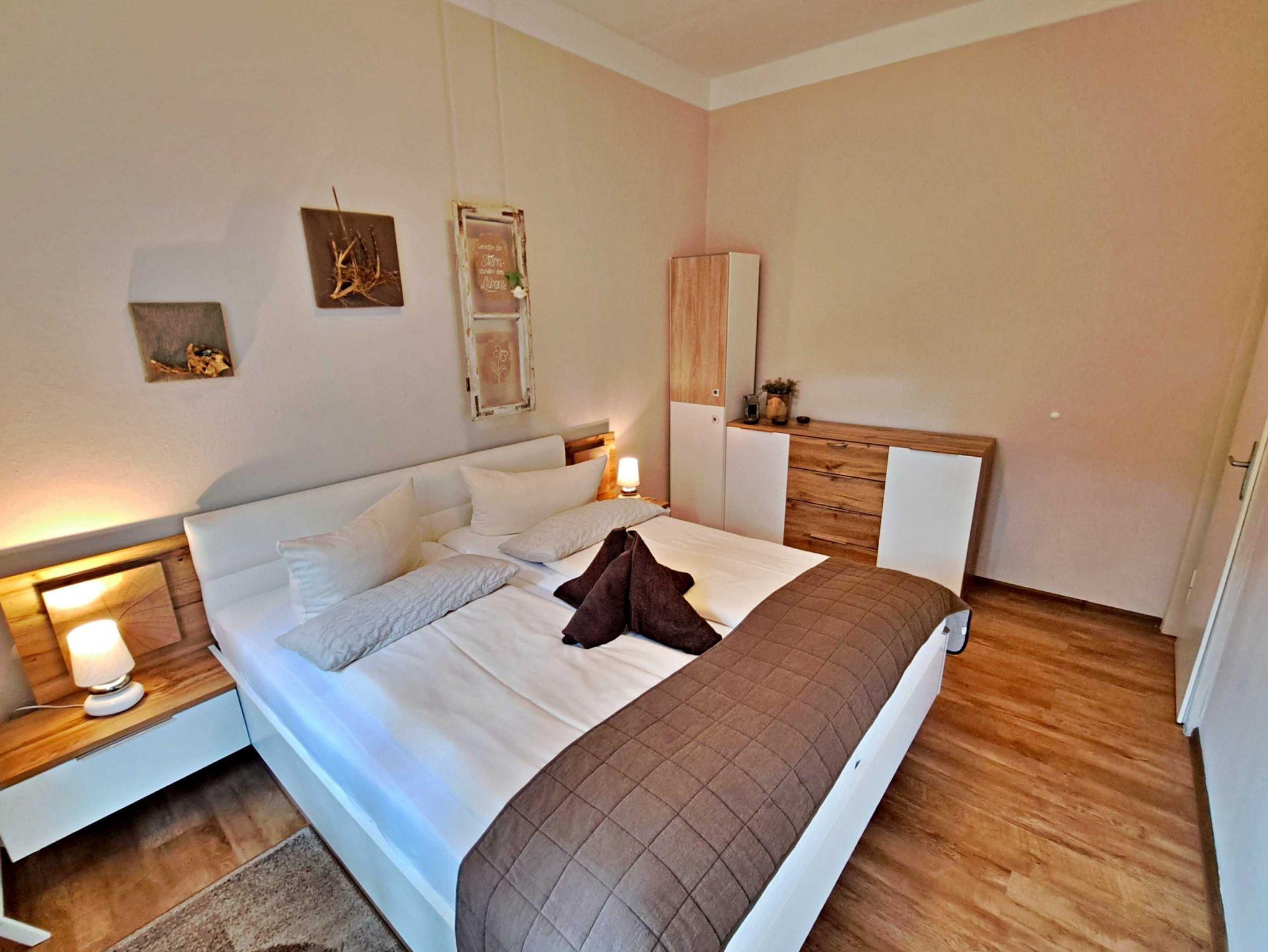 Herzlich willkommen in unserer charmanten 60 qm großen Ferienwohnung im Erdgeschoss! Hier erwartet Sie ein einladendes Wohnzimmer, das mit einer bequemen Sofa-Landschaft (Aufbettung für 1 Person) und Flachbild-TV ausgestattet ist - ideal für entspannte Stunden. Für gesellige Mahlzeiten steht Ihnen ein Esstisch mit vier Stühlen zur Verfügung. Das separate Schlafzimmer lädt mit einem gemütlichen Doppelbett zum Träumen ein. In der praktischen Pantryküche finden Sie alles, was Sie für die Zubereitung kleiner Gerichte benötigen, darunter ein 2-Platten-Ceranherd, Kühlschrank und ein kleiner Backofen. Das Tageslicht-Bad mit Dusche und WC sowie einem Fön rundet das Angebot ab und sorgt für zusätzlichen Komfort. Für Ihre Unterhaltung und Verbindung zur Außenwelt steht Ihnen unser kostenloses W-LAN während Ihres gesamten Aufenthalts zur Verfügung. Ihr Auto findet direkt am Haus einen sicheren Parkplatz.
