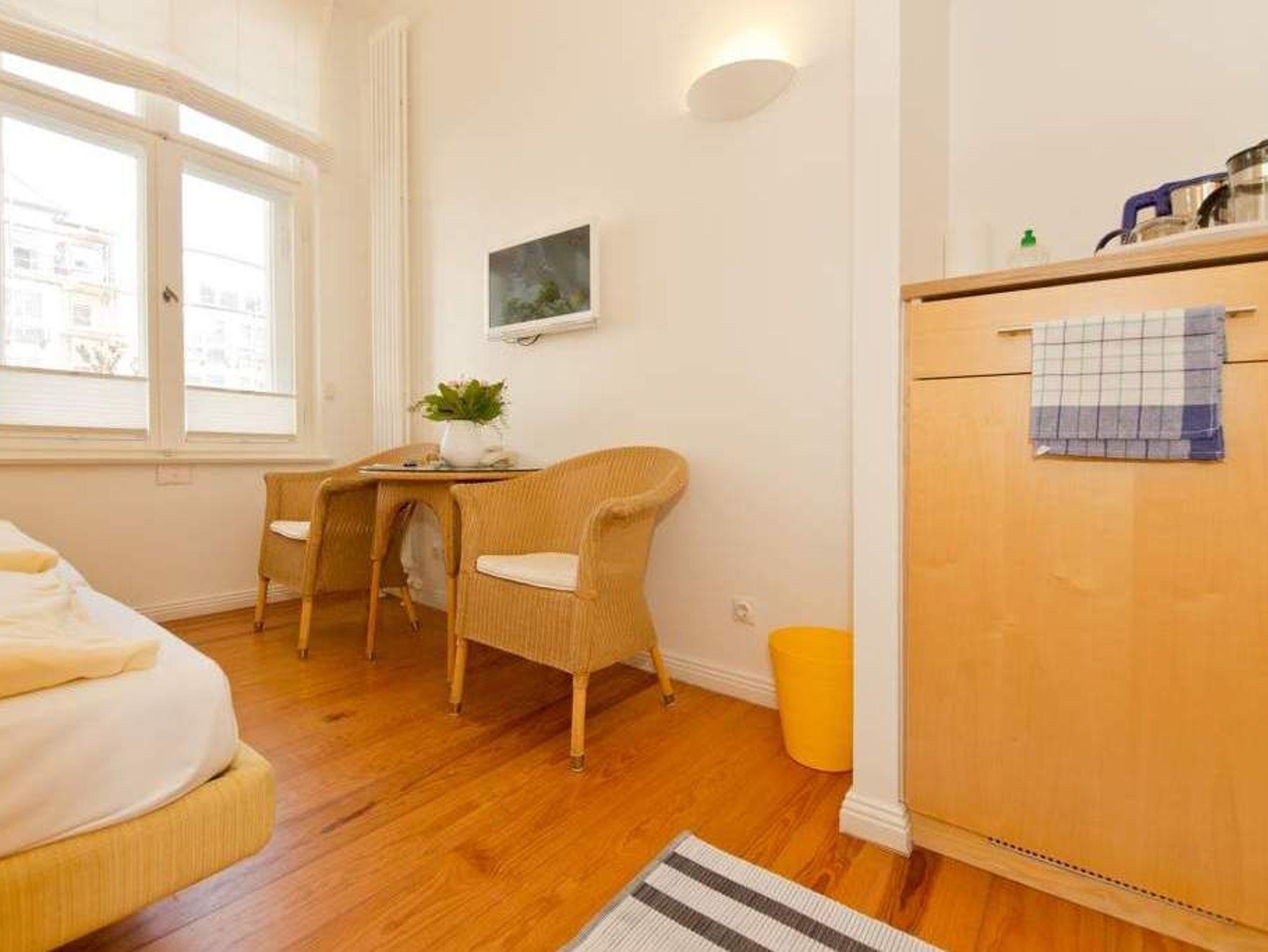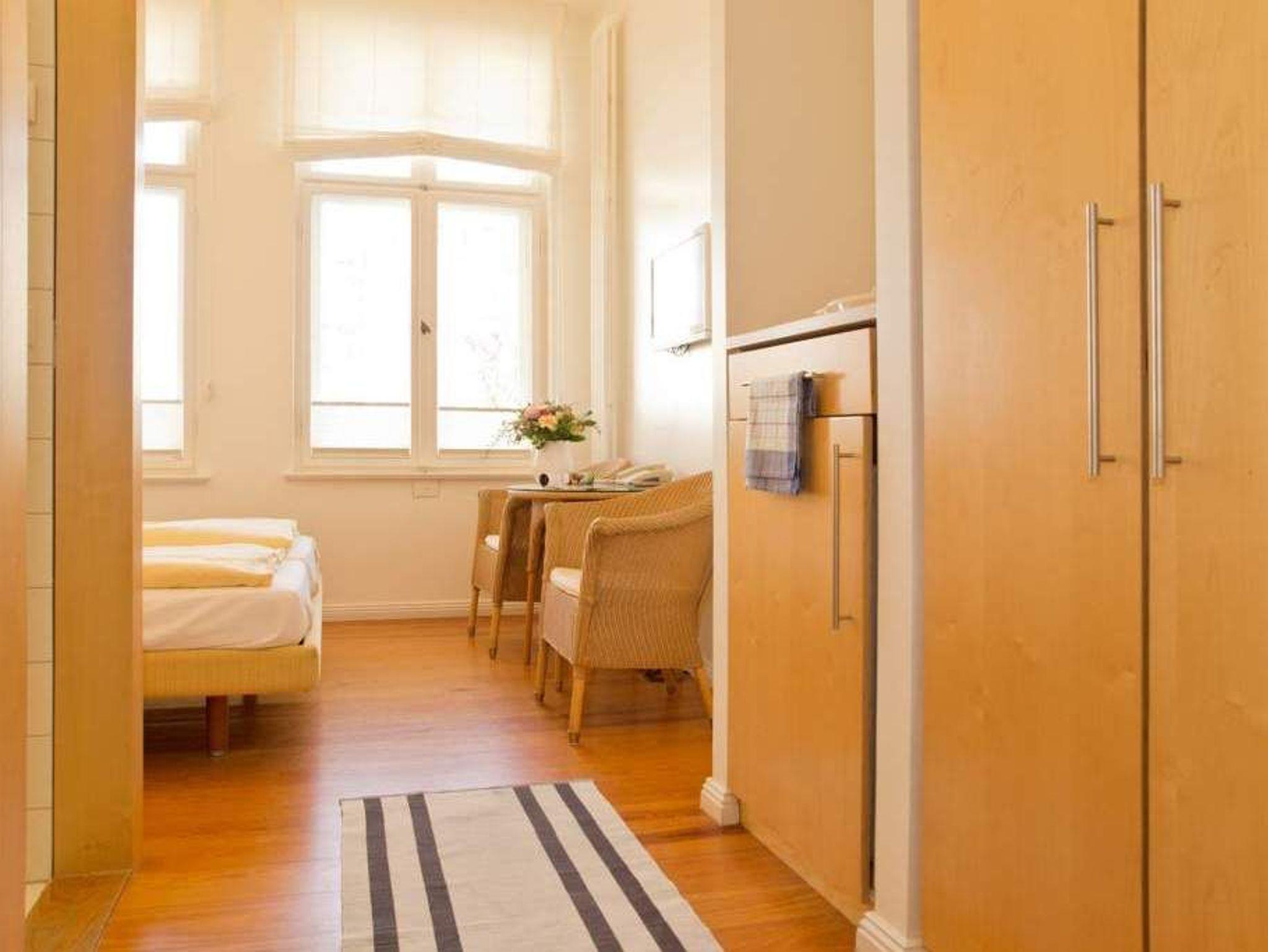Diese kleinen, im Erdgeschoß gelegenen Zimmer eignen sich wunderbar für einen Kurzurlaub oder können bei Bedarf, zum Beispiel für die Schwiegermutter oder für größere Kinder, zu einer der anderen Wohnungen dazu gemietet werden. Sie verfügen über ein komplettes Bad mit Dusche und WC, zwei Betten, einen Einbauschrank, in dem ein integrierter Kühlschrank für kalte Getränke sorgt. Eine kleine Frühstücksgrundausstattung ( Tassen, Teller u. Besteck) sind vorhanden. Wer keinen Wert auf eine eigene Kochmöglichkeit legt, sondern sowieso lieber essen geht, findet hier eine günstige Alternative.