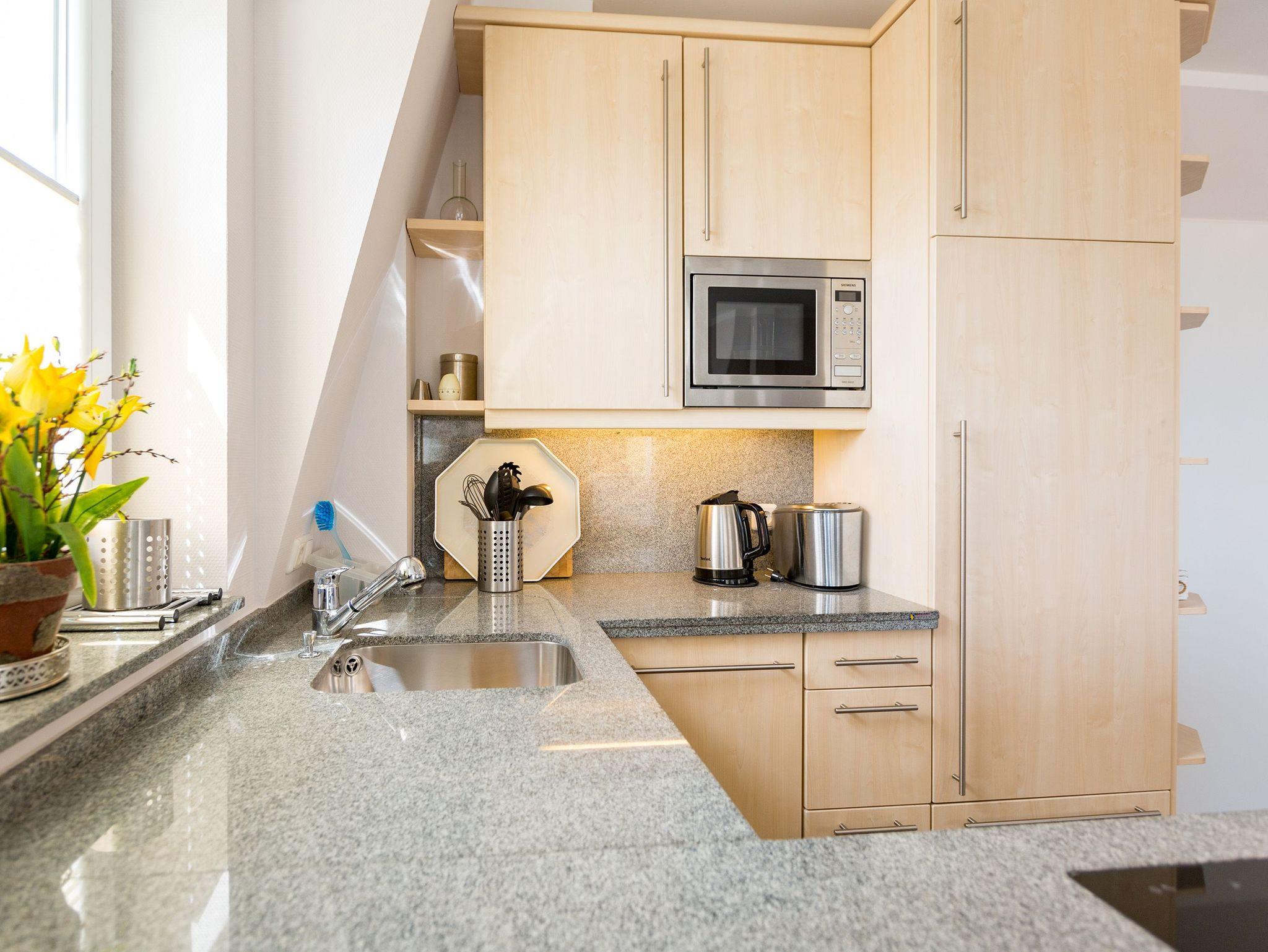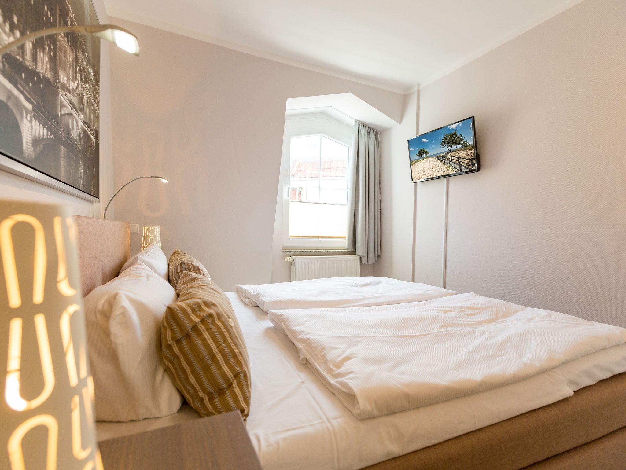 Diese schön gestaltete 2-Raum-Ferienwohnung empfängt Sie in der 3. Etage der Dünenresidenz und bietet Platz für 2 Personen und 1 Kleinkind bis 3 Jahre. Die stilvolle, moderne Möblierung und die geschmackvollen Dekorationen sorgen für einen schönen Urlaub. Der helle, freundliche Wohnbereich mit bequemer Sitzgruppe (Flat-TV, DVD) wird ergänzt durch und eine offene, komplett ausgestattete Küche und den schönen Essplatz im Glaserker. Von hier bietet sich Ihnen ein schöner Blick auf den Schloonsee und auf die Ostsee. Das Schlafzimmer mit Boxspringbett (1,80 m x 2,00m) bietet erholsamen Schlafkomfort. Ein modernes Wohlfühlbad mit WC und Dusche und ein Abstellraum für Ihre Koffer stehen ebenfalls zur Verfügung. Auf dem Südbalkon mit Blick auf Bansin genießt man die Abendsonne, der zweite seitliche Balkon bietet einen schönen Blick auf die Ostsee. Auf Wunsch stellen wir für unsere kleinen Gäste ein Kinderreisebett (ohne zusätzliche Matratze [&] Bettzeug) und einen Kinderhochstuhl (gegen einen Aufpreis) zur Verfügung. Für Ihren Komfort sind die Betten bei der Anreise bezogen und Handtücher liegen bereit.
