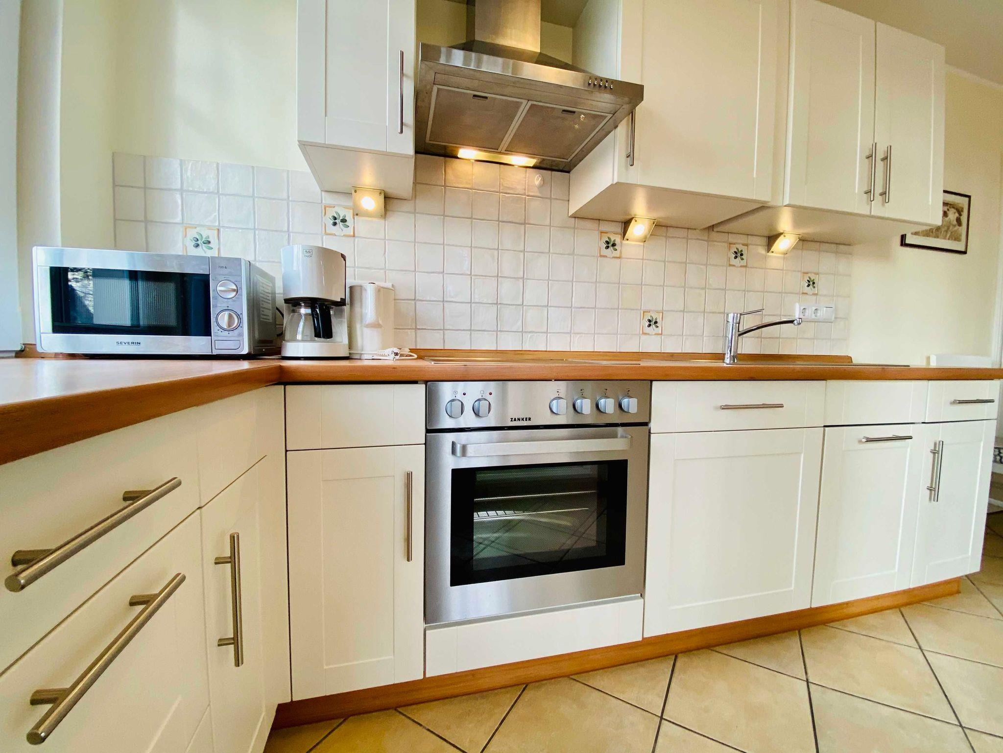 Sie hat einen großen lichtdurchfluteten Wohn-Esszimmer mit Couchecke, Esstisch und ist mit einem Kaminofen für die Gemütlichkeit ausgestattet. Die Komplettküche rundet das ganze ab.