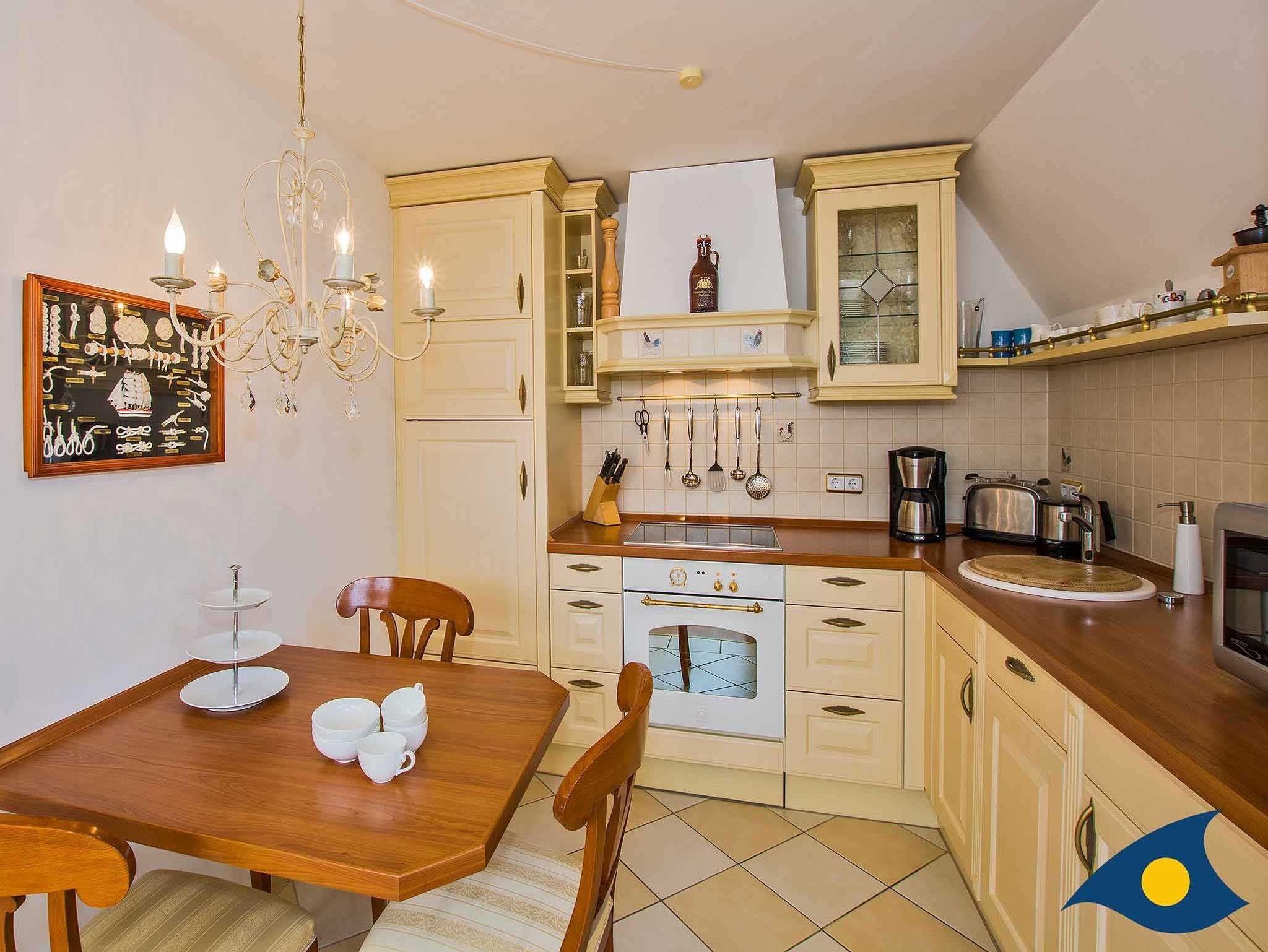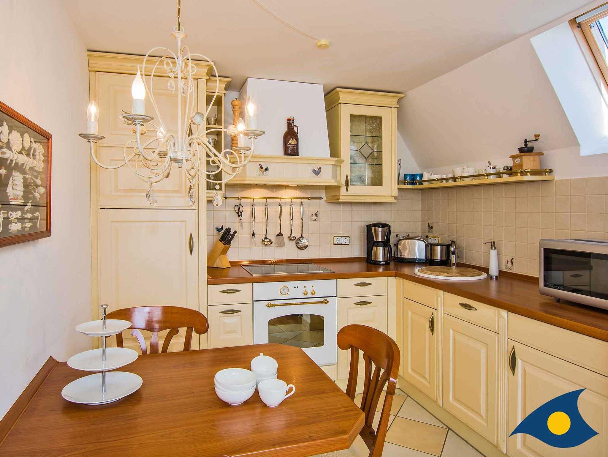 Zu den Annehmlichkeiten gehören, neben dem atmosphärischen Strandkorb in der Wohndiele und der liebevoll eingerichteten Küche, zusätzlich die unten aufgeführten Details: Großzügige Dachterrasse (Südlage) mit Meerblick, Sitzgelegenheiten und Sonnenliegen, zusätzlicher Balkon (Westlage) mit Blick auf den idyllischen Schloonsee