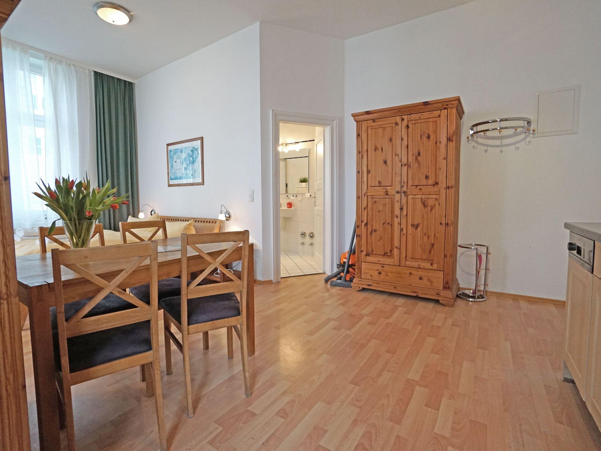 Vom kombinierten Wohn- Schlafbereich (Doppelbett 160x200 cm) gelangt man auf den Balkon und ins Badezimmer (Duschbad).
