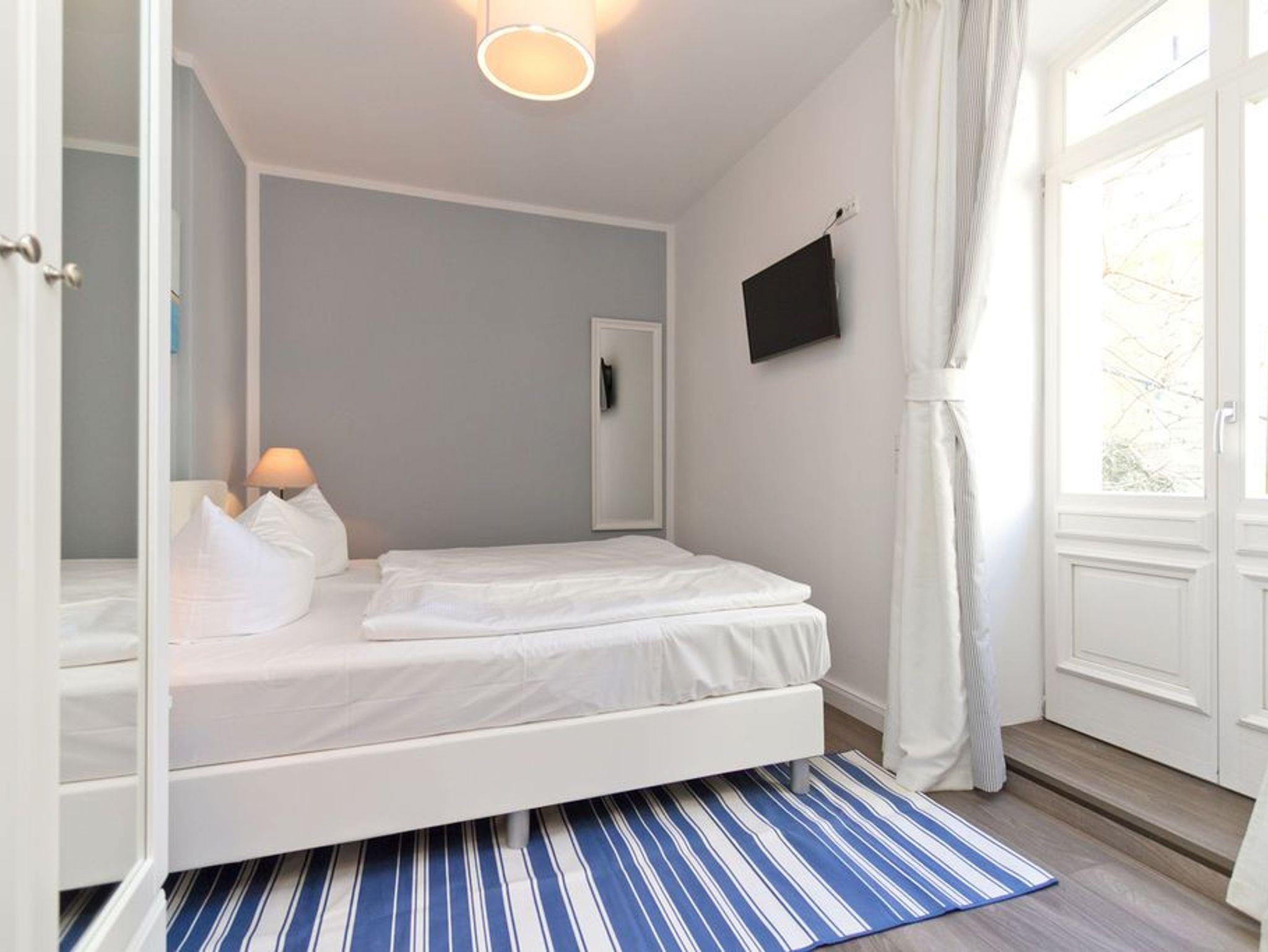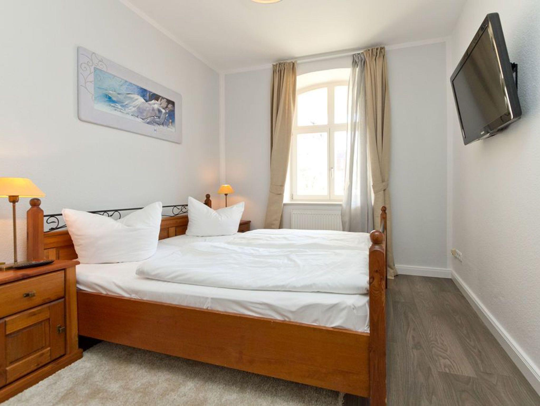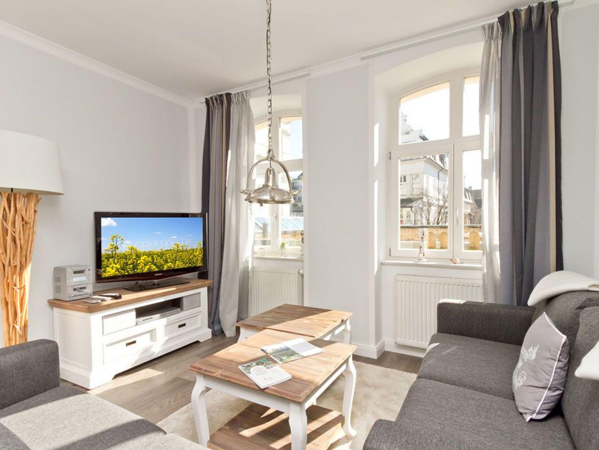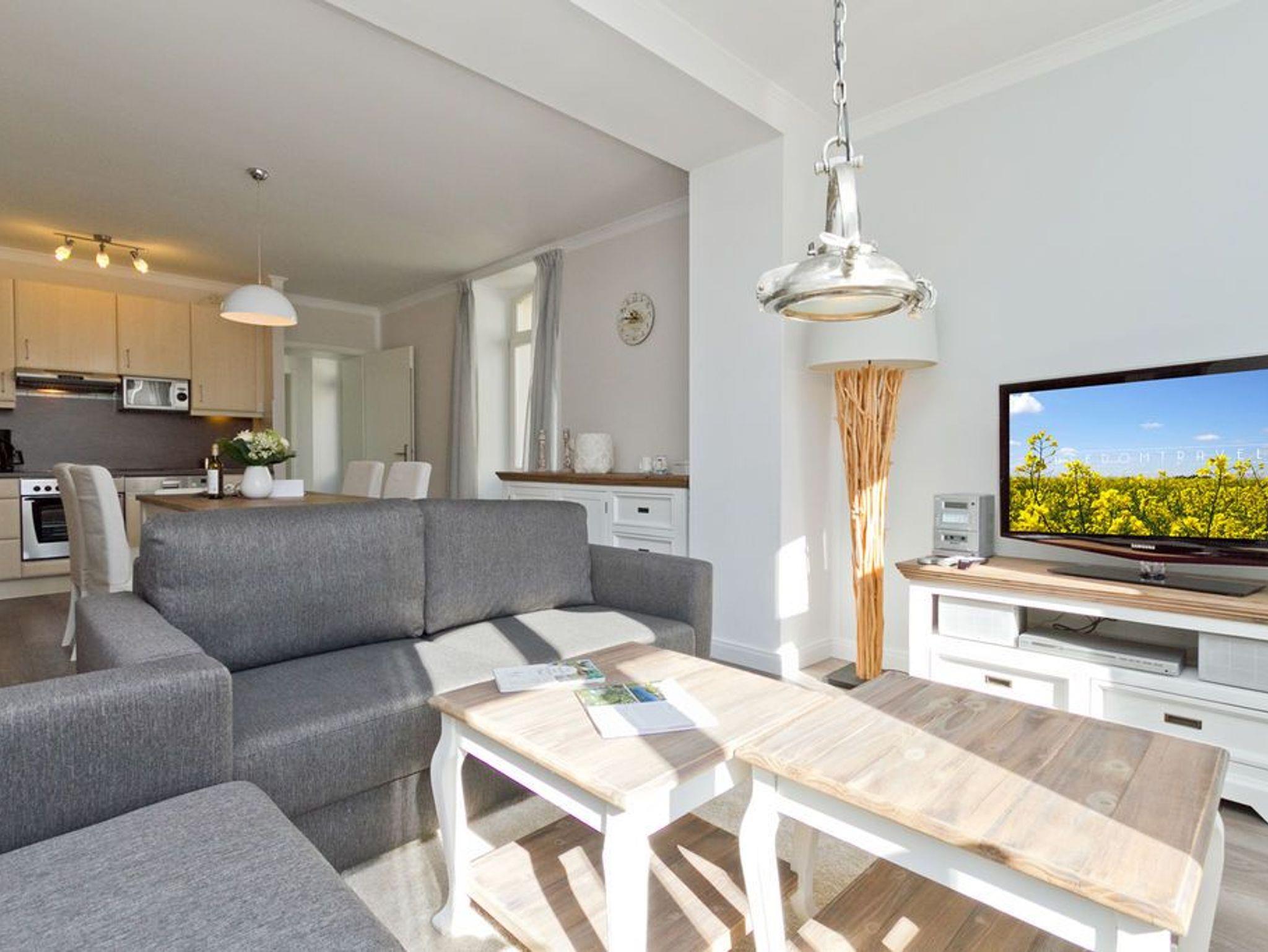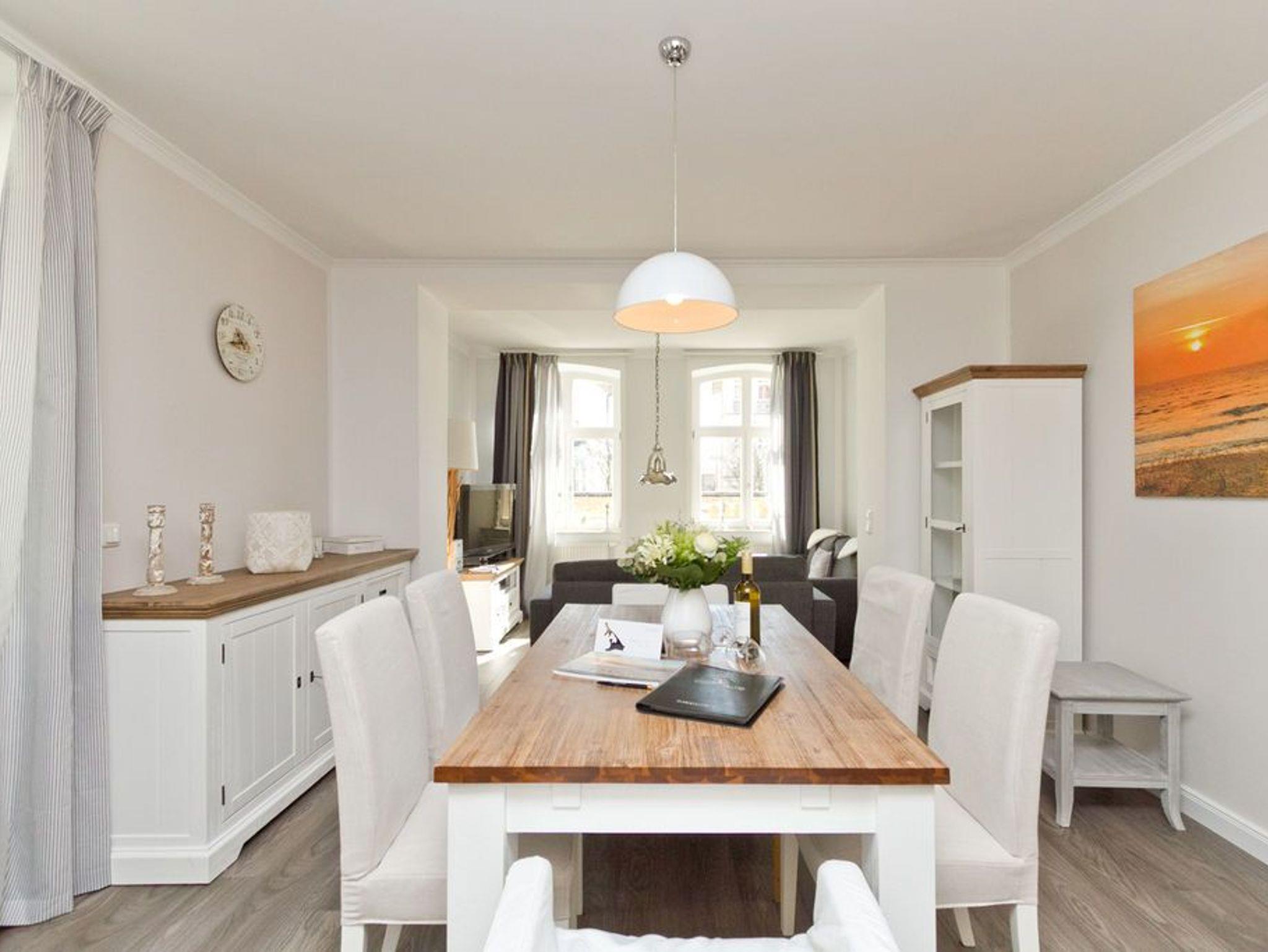 Die helle, freundliche 3-Raum-Ferienwohnung im Erdgeschoss der Villa ist 2016 frisch renoviert - modern eingerichtet und sehr geschmackvoll dekoriert und bietet Platz für 4 bis 6 Personen. Sie verfügt über ein Wohnzimmer mit Schlafcouch und Flat-TV, eine komplett ausgestattete Küchenzeile (Ceranfeld, Backofen) mit Essbereich, zwei Schlafzimmer mit Boxspring-Doppelbetten, zwei Duschbäder und eine großzügige Terrasse. Die vollständige Einrichtung lässt keine Wünsche offen. Auch die beiden Schlafzimmer sind je mit einem Flat-TV ausgestattet. Für die 5. und 6. Person besteht die Möglichkeit der Aufbettung auf der Schlafcouch im Wohnzimmer. Auf Wunsch stellen wir für unsere kleinen Gäste ein Kinderreisebett (ohne zusätzliche Matratze [&] Bettzeug) und einen Kinderhochstuhl zur Verfügung. Die Betten sind bei Anreise bezogen und Handtücher liegen bereit. Ein PKW-Stellplatz steht auf dem Parkdeck zur Verfügung.