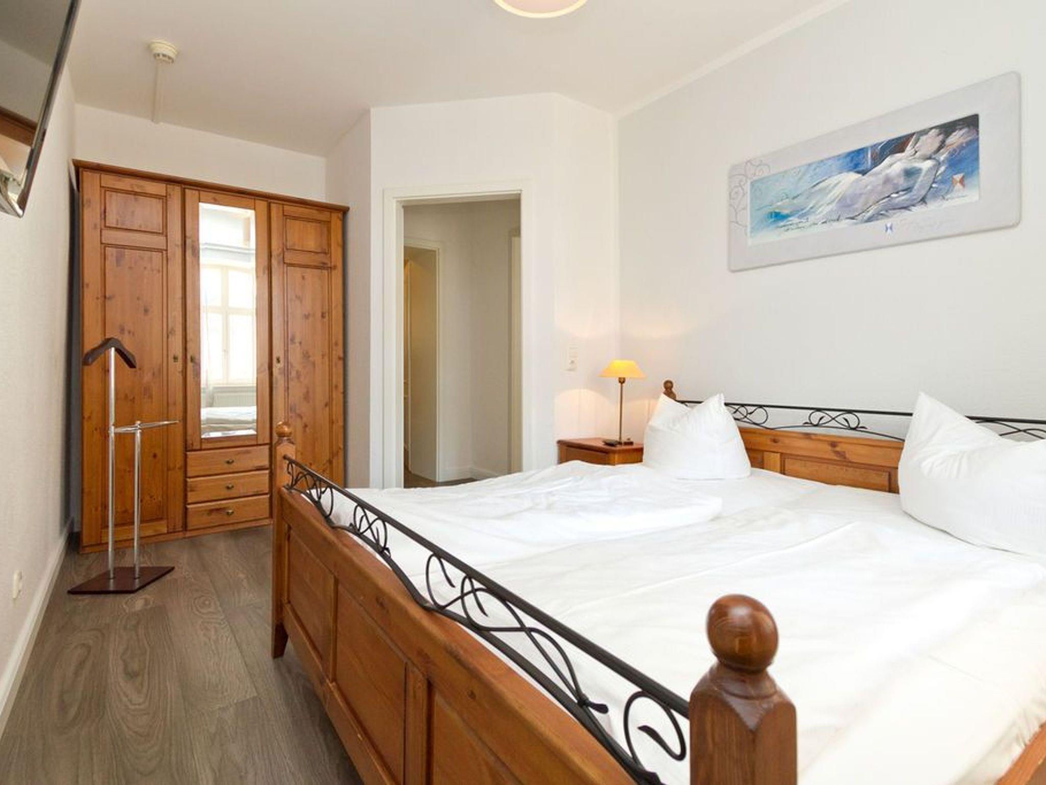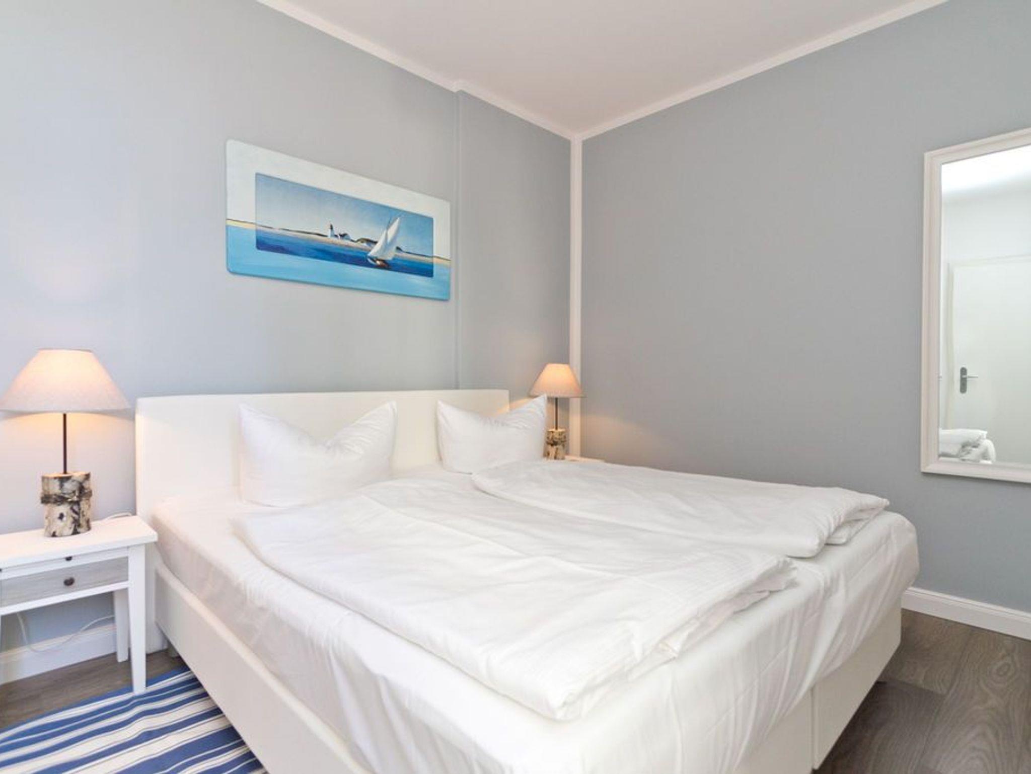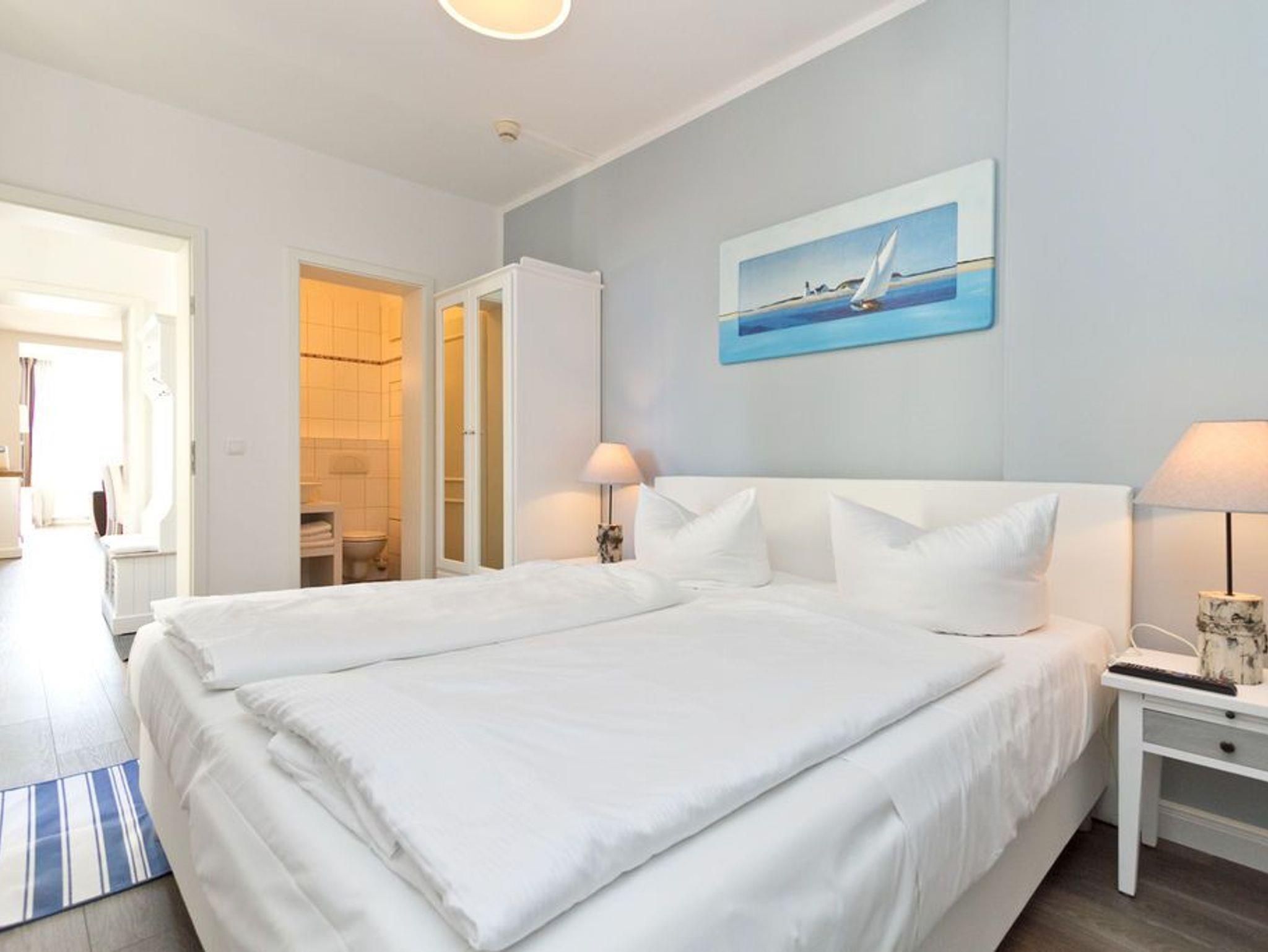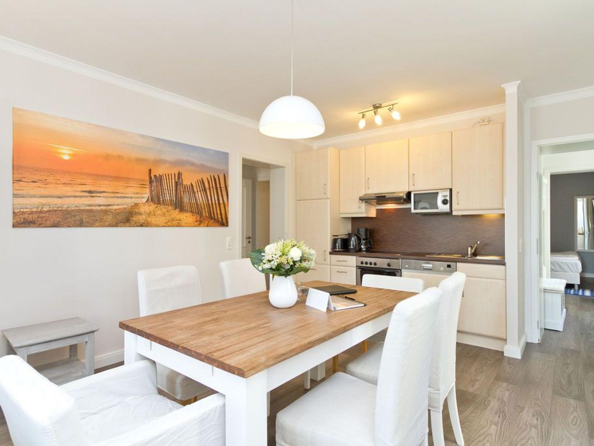 Die helle, freundliche 3-Raum-Ferienwohnung im Erdgeschoss der Villa ist 2016 frisch renoviert - modern eingerichtet und sehr geschmackvoll dekoriert und bietet Platz für 4 bis 6 Personen. Sie verfügt über ein Wohnzimmer mit Schlafcouch und Flat-TV, eine komplett ausgestattete Küchenzeile (Ceranfeld, Backofen) mit Essbereich, zwei Schlafzimmer mit Boxspring-Doppelbetten, zwei Duschbäder und eine großzügige Terrasse. Die vollständige Einrichtung lässt keine Wünsche offen. Auch die beiden Schlafzimmer sind je mit einem Flat-TV ausgestattet. Für die 5. und 6. Person besteht die Möglichkeit der Aufbettung auf der Schlafcouch im Wohnzimmer. Auf Wunsch stellen wir für unsere kleinen Gäste ein Kinderreisebett (ohne zusätzliche Matratze [&] Bettzeug) und einen Kinderhochstuhl zur Verfügung. Die Betten sind bei Anreise bezogen und Handtücher liegen bereit. Ein PKW-Stellplatz steht auf dem Parkdeck zur Verfügung. Die Villa Frisia bietet Ihnen ein strandnahes Feriendomizil in stilvoller, exklusiver Atmosphäre. Es erwarten Sie moderne, ansprechend möblierte und sehr komfortabel ausgestattete Appartements mit vielen Extras. Zu jeder Wohnung gehört ein Pkw-Stellplatz. Ein Fahrradkeller befindet sich direkt am Objekt. Waschmaschine [&] Trockner im Haus sind gegen Gebühr nutzbar. Das WLAN-Netz im Haus steht kostenfrei zur Verfügung.