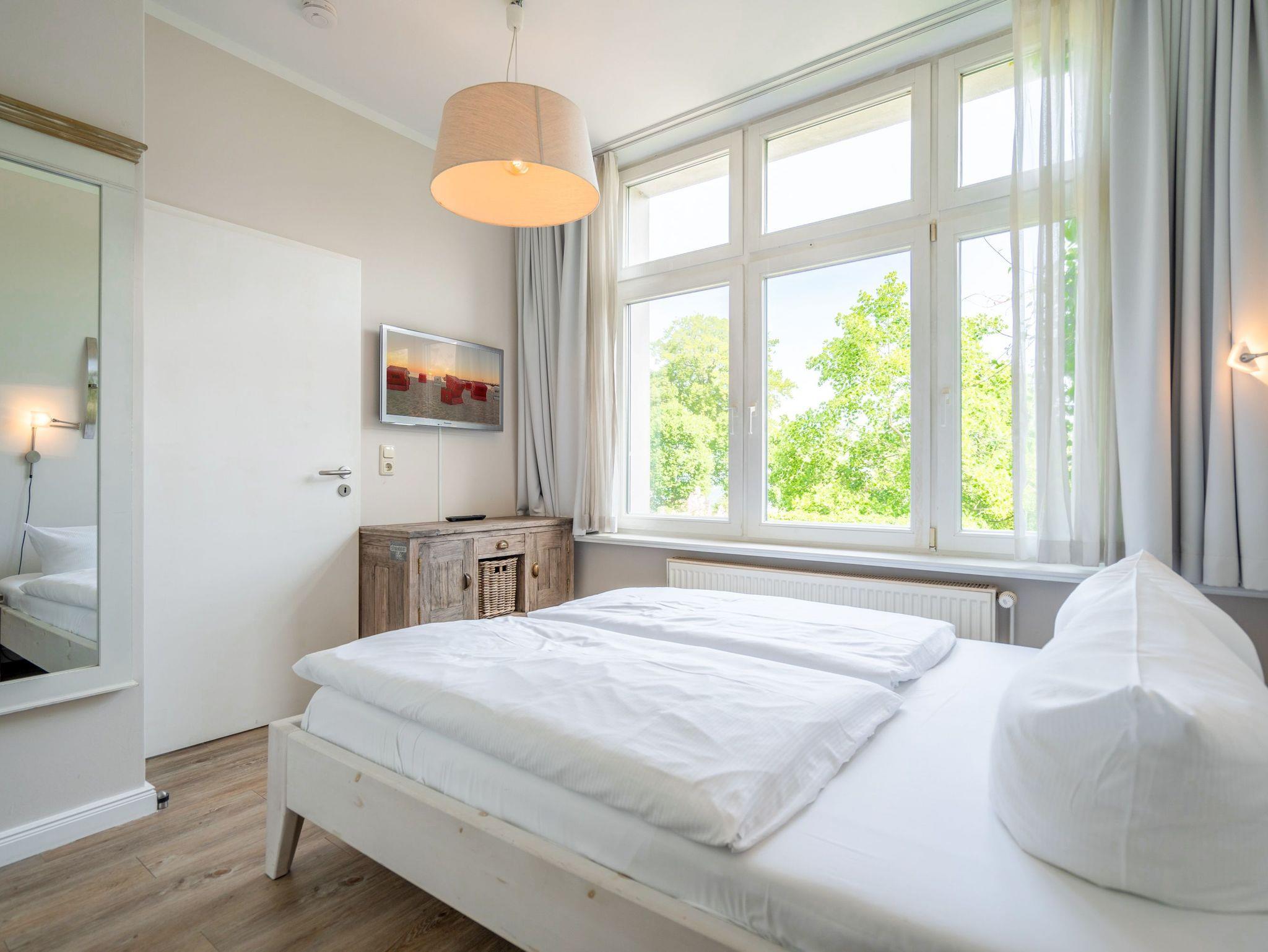 Hell und gemütlich empfängt Sie dieses 45qm große Ferienappartement für 2 bis 3 Personen (inklusive Kleinkind) im schönen Seebad Bansin. Genießen Sie den wundervollen Meerblick von Ihrem 2-Zimmer-Appartement in Hochparterre. Ob vom Landhaus-Sofa (Aufbettungsmöglichkeit für 3. Person) aus, von der Essecke oder gleich morgens beim Blick aus dem Schlafzimmerfenster - die Ostsee ist für Sie zum Greifen nahe! Machen Sie es sich vor dem Flat-TV mit DVD-Player bequem oder lauschen Sie einfach dem Rauschen der Wellen. Die offene Küche ist unter anderem ausgestattet mit einem Kühlschrank, Backofen, Mikrowelle und Waschmaschine. Die sonnige Süd-West-Terrasse (16qm) mit Gartenmöbeln und Strandkorb bietet zusätzlichen Platz zum Relaxen und Entspannen. Erholsamen Schlaf verspricht das bequeme Doppelbett im Schlafzimmer. Auf Wunsch stellen wir für unsere kleinen Gäste ein Kinderreisebett (ohne zusätzliche Matratze [&] Bettbezug) und einen Kinderhochstuhl (gegen Aufpreis) zur Verfügung. Für Ihre Urlaubskleidung ist ausreichend Schrankraum vorhanden. Ein Flat-TV rundet Ihre Ruhezone ab. Damit Sie maximalen Komfort genießen können, sind die Betten bei Ihrer Anreise bereits bezogen und Handtücher liegen für Sie bereit. Ein Duschbad mit Waschtisch und WC (Zugang durchs Schlafzimmer) gehört ebenso zu diesem Urlaubsdomizil wie kostenfreies WLAN. Ein Pkw-Stellplatz steht für Sie in der Doppelparkgarage (Auto Maße: max. Höhe 1,50m / max. Länge 5m) hinter dem Haus zur Verfügung. Bitte folgen Sie der genauen Parkanleitung. Vor der Wohnungstür besteht leider keine Haltemöglichkeit zum Be- und Entladen.