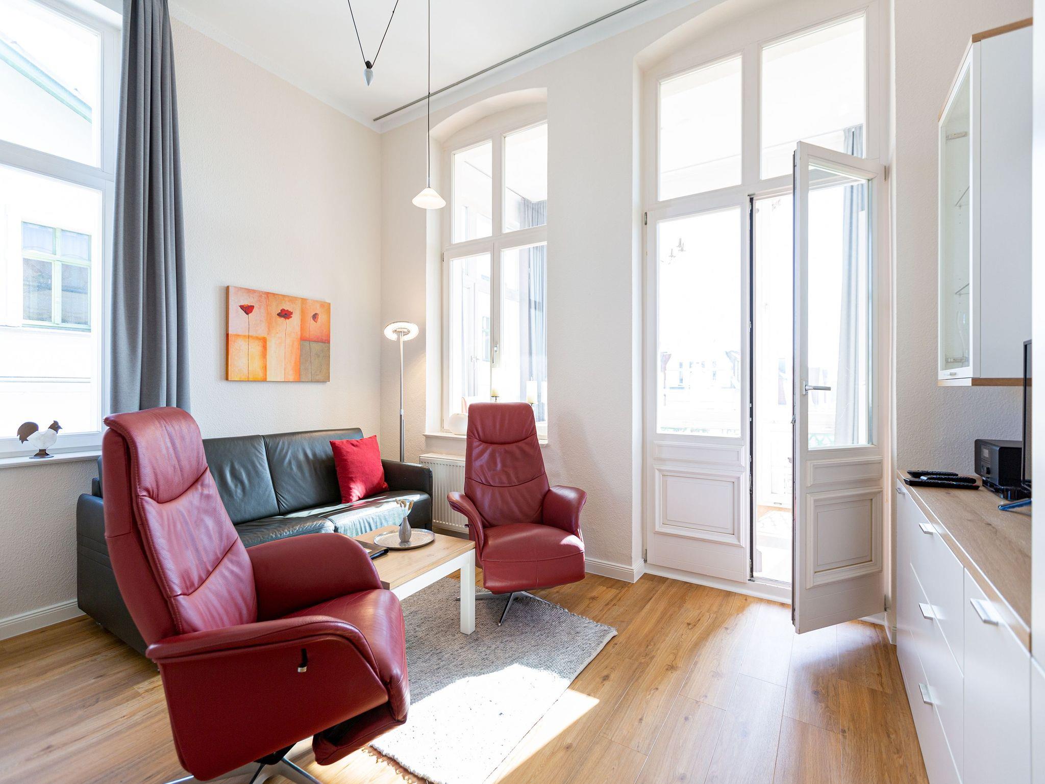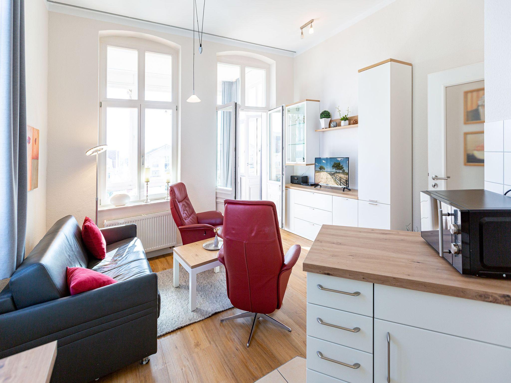 Diese helle lichtdurchflutete Ferienwohnung ( für max. 2 Personen [&] 2 Kinder bis 15 Jahre) überzeugt von der ersten Minute an. Liebevoll dekoriert und stilvoll möbliert verbringen Sie hier erholsame Urlaubstage. Im Wohnbereich finden Sie eine komplett ausgestattete Küchenzeile mit allen Annehmlichkeiten sowie eine verglaste Veranda mit Essplatz und Blick auf die Villen der Seestraße. Das Schlafzimmer mit Doppelbett bietet 2 Personen Platz für eine erholsame Nacht. Auf Ihrem Balkon genießen Sie die Morgensonne oder die gesunde Ostseeluft. Für die 3. und 4. Person besteht die Möglichkeit der Aufbettung auf der Schlafcouch im Wohnzimmer. Für Ihren Komfort steht die Erstausstattung Wäsche für Sie bereit.
