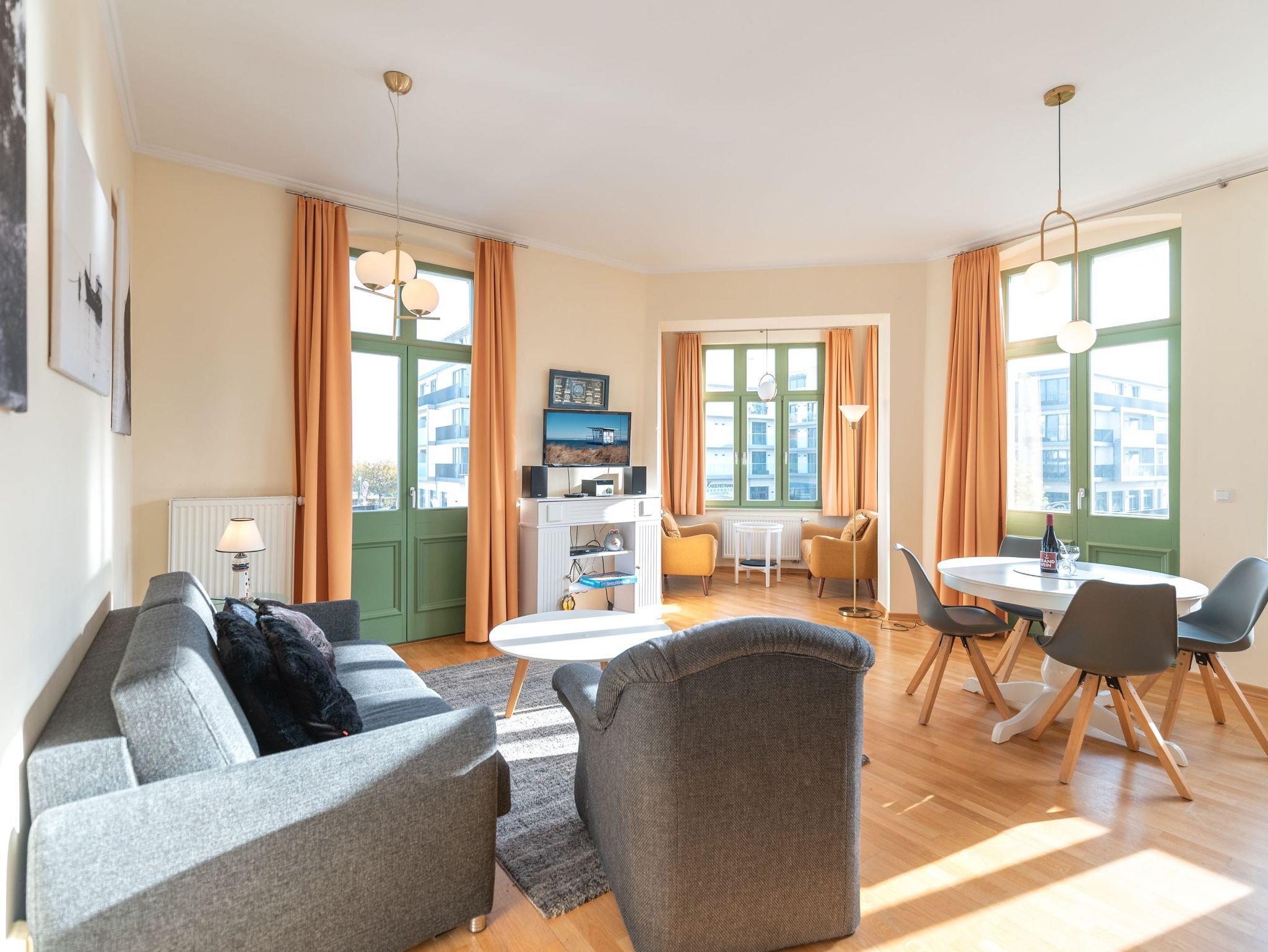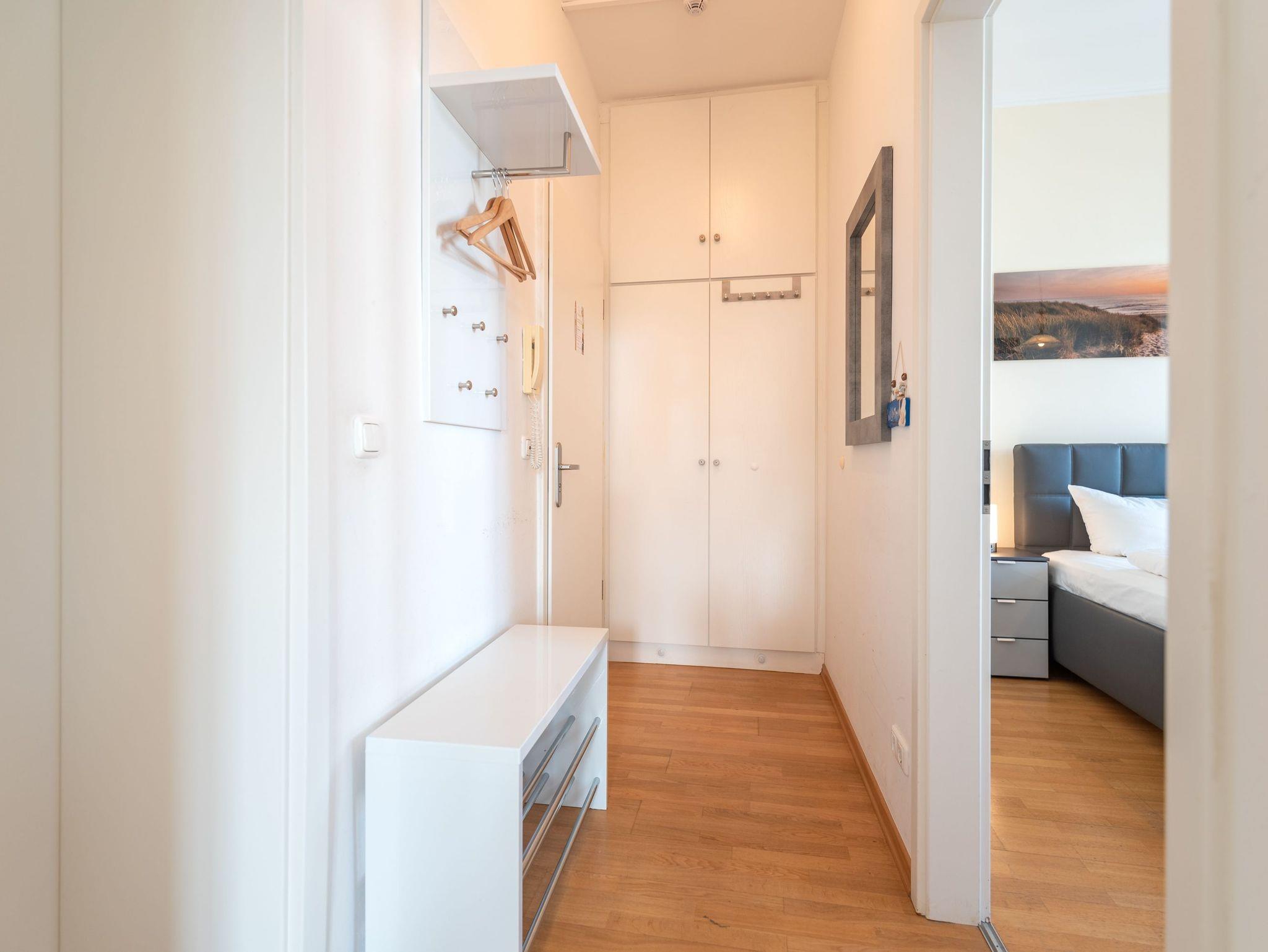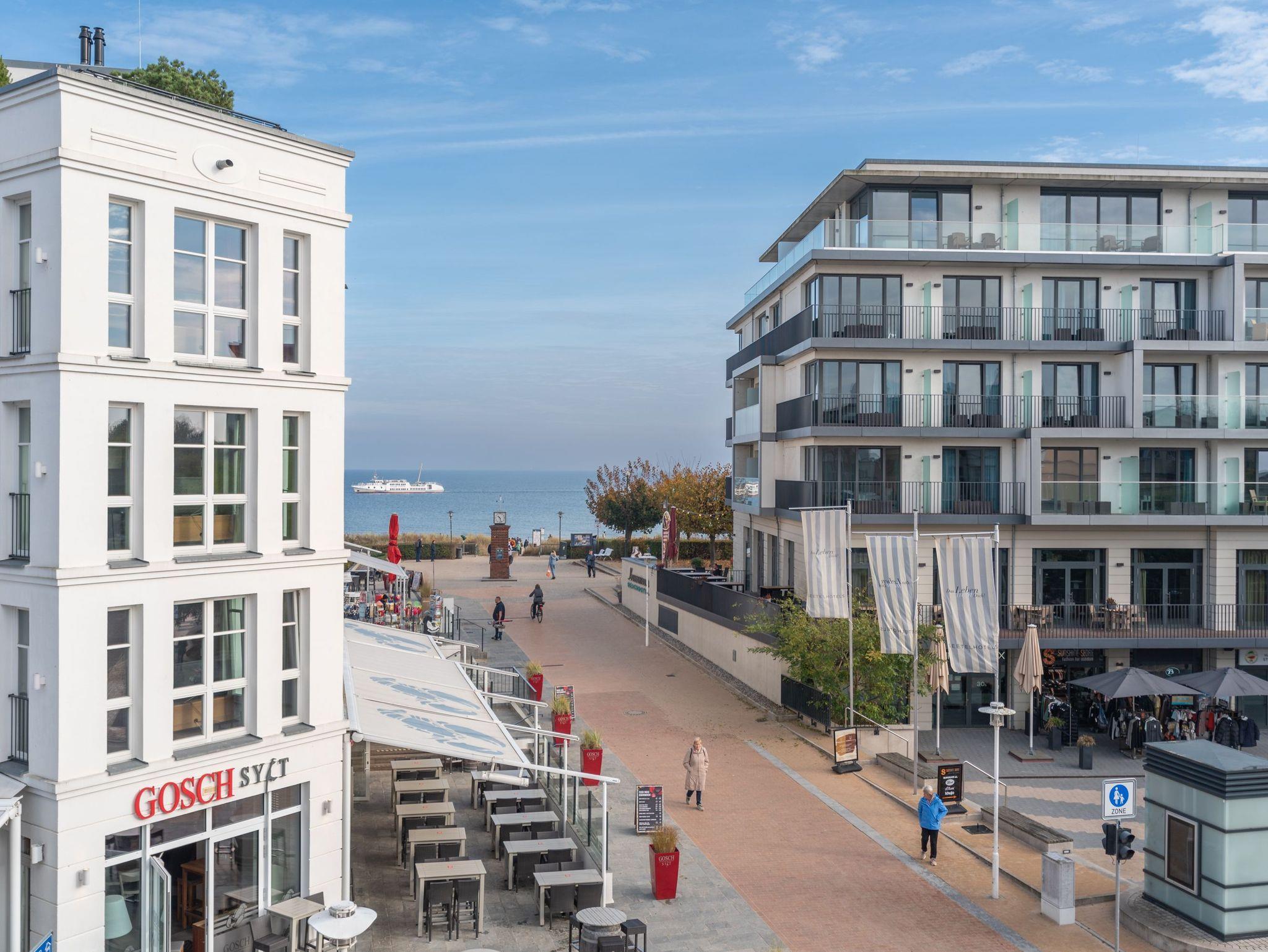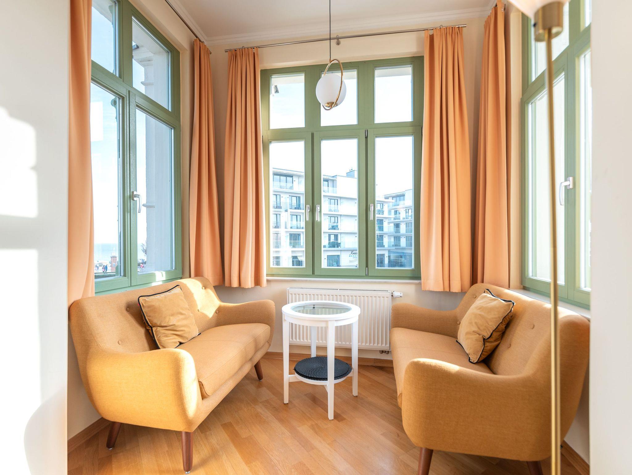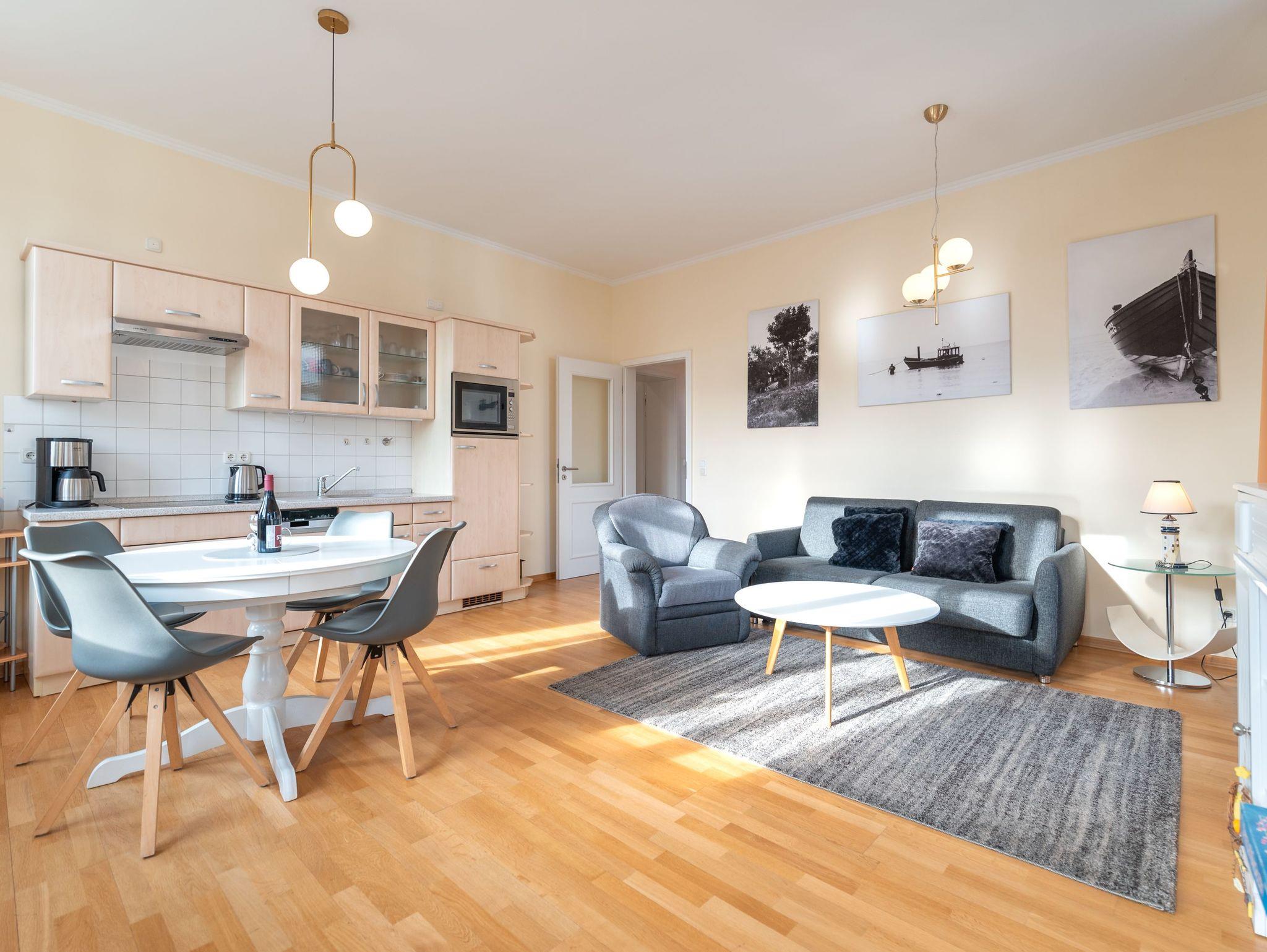 Das gemütliche Wohnzimmer mit offenem Erker ? mit Meerblick aus der 2. Reihe ? bietet eine bequeme Schlafcouch für die 3. und 4. Person sowie Zugang zu zwei Balkonen. Diese geben einen tollen, seitlichen Blick auf die Ostsee frei ? perfekt, um die Meeresbrise zu genießen. Die vollständig ausgestattete Küchenzeile mit Essbereich lädt zu gemeinsamen Mahlzeiten ein. Das Schlafzimmer verfügt über ein komfortables Doppelbett, während das moderne Duschbad mit WC zusätzlichen Komfort bietet.