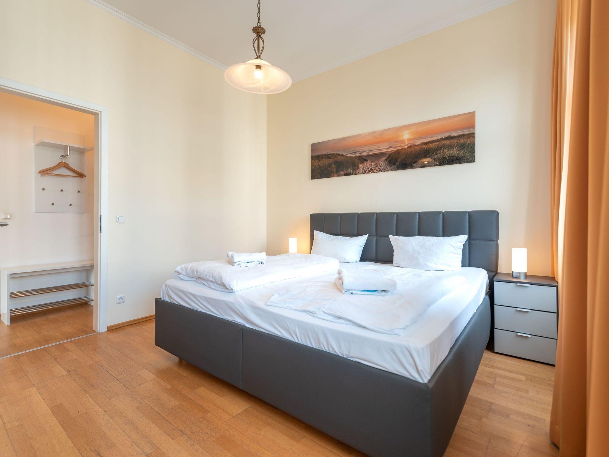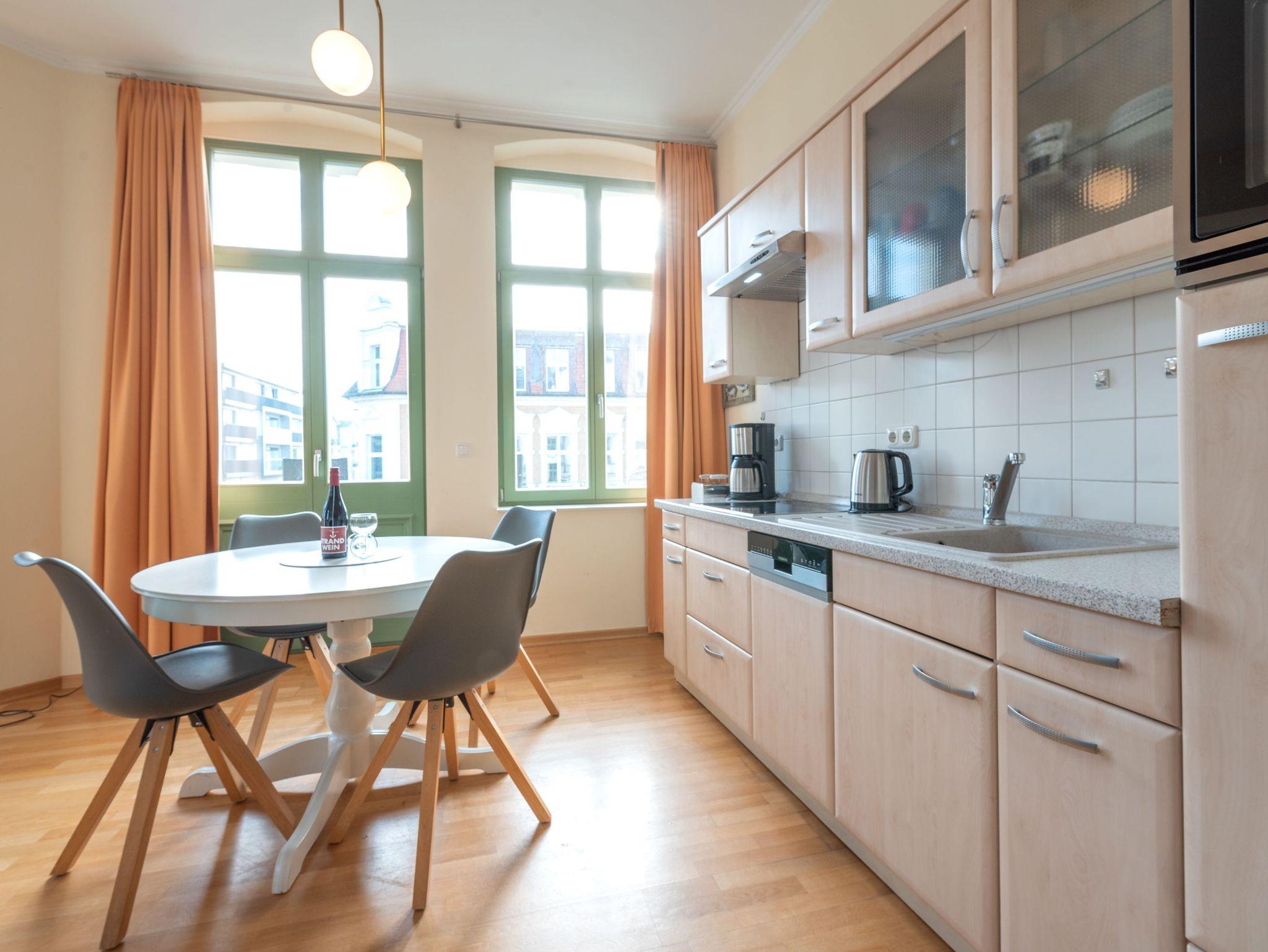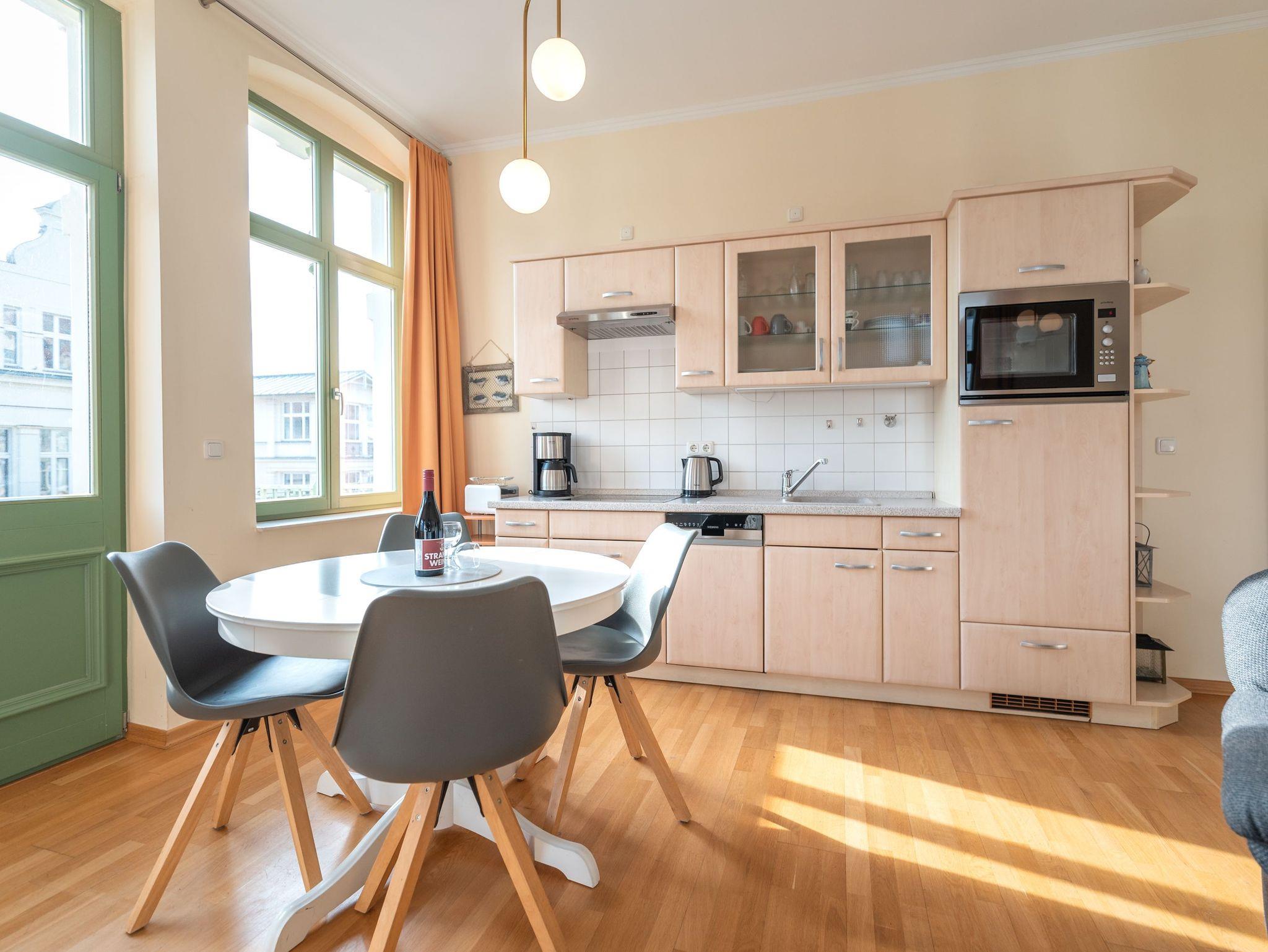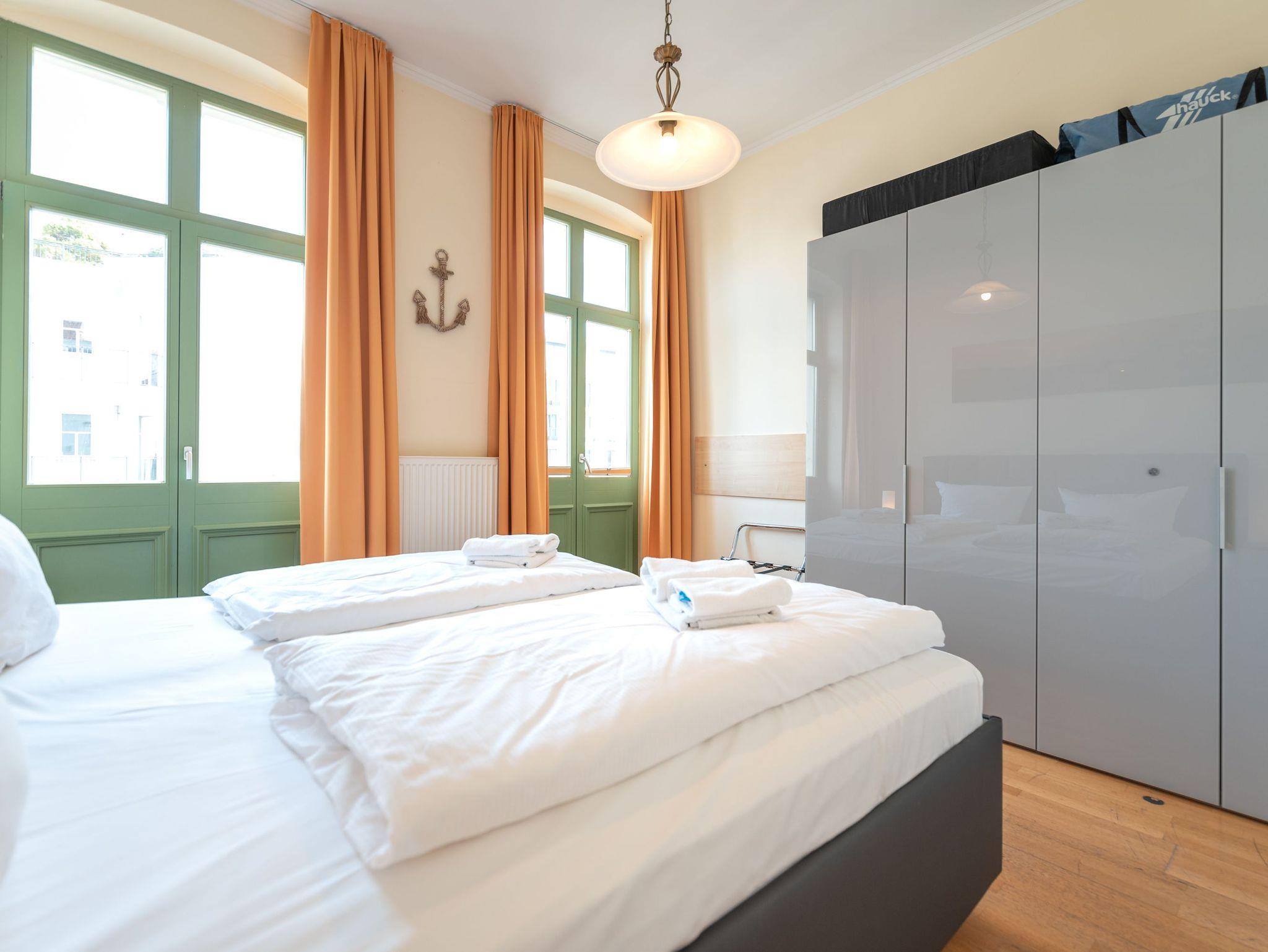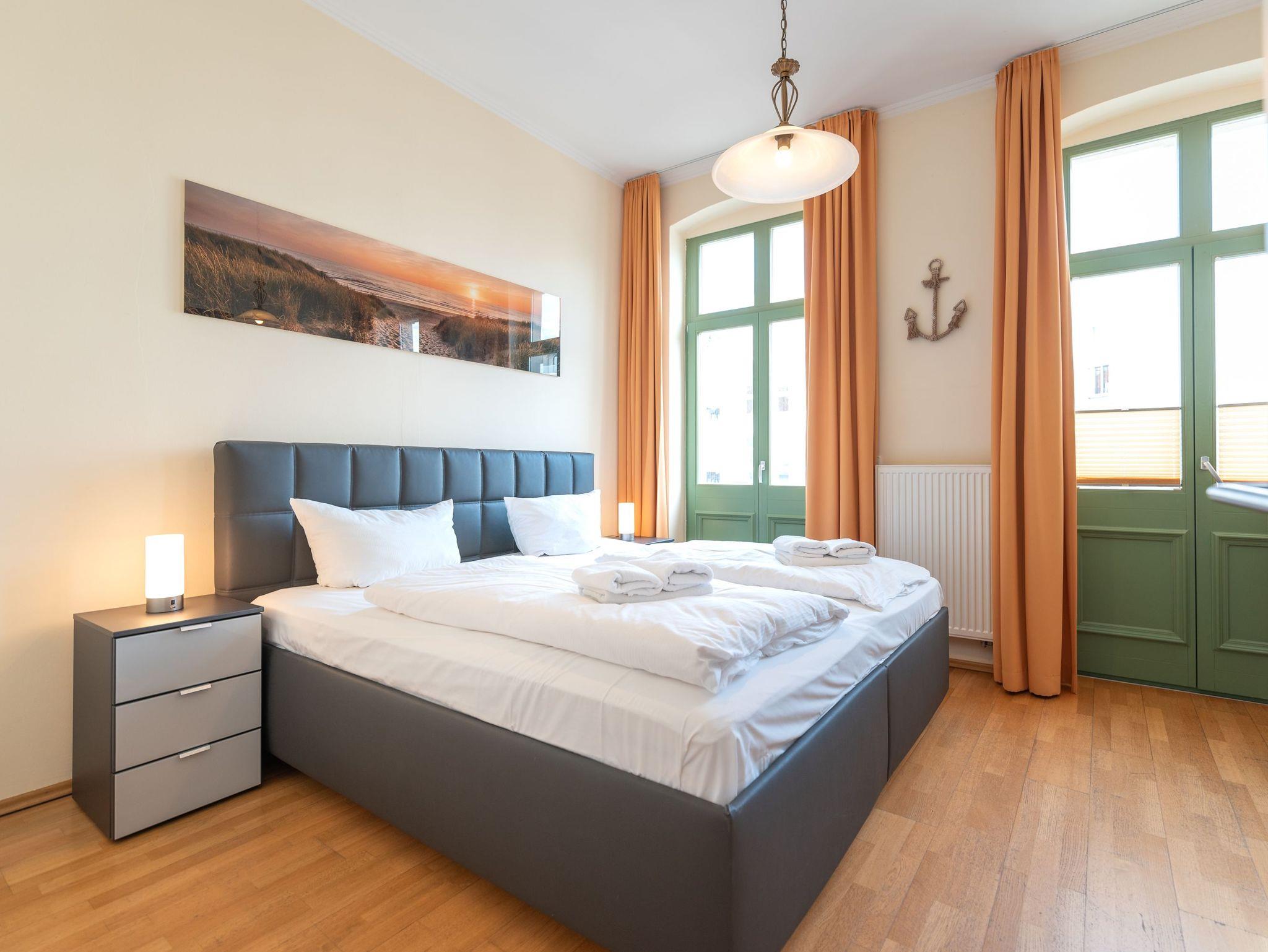 Das gemütliche Wohnzimmer mit offenem Erker ? mit Meerblick aus der 2. Reihe ? bietet eine bequeme Schlafcouch für die 3. und 4. Person sowie Zugang zu zwei Balkonen. Diese geben einen tollen, seitlichen Blick auf die Ostsee frei ? perfekt, um die Meeresbrise zu genießen. Die vollständig ausgestattete Küchenzeile mit Essbereich lädt zu gemeinsamen Mahlzeiten ein. Das Schlafzimmer verfügt über ein komfortables Doppelbett, während das moderne Duschbad mit WC zusätzlichen Komfort bietet.