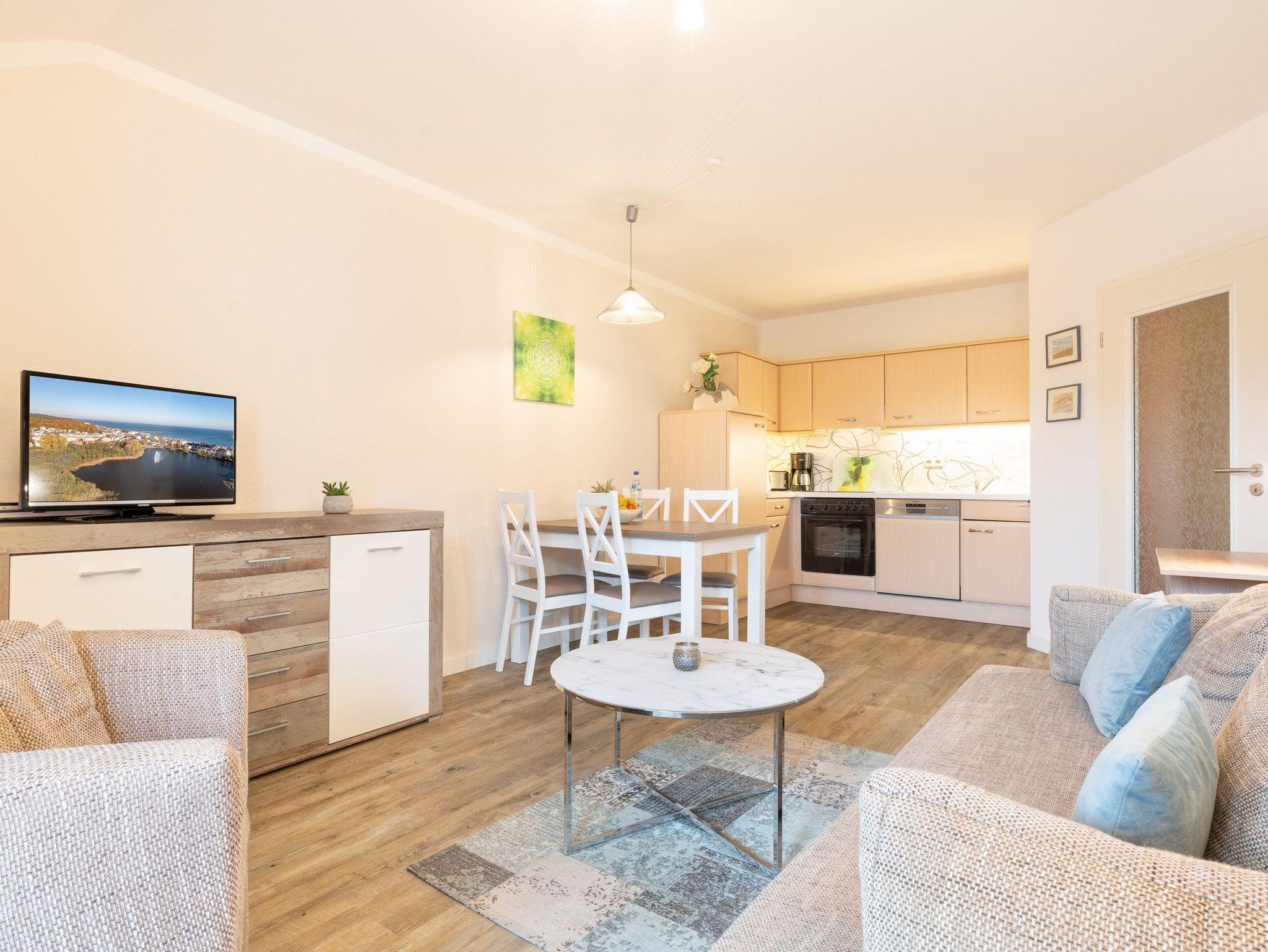 Im Obergeschoss des Hauses begrüßen wir Sie, Dank der freundlichen Farbgebung, in wohliger Atmosphäre auf 54 Quadratmetern zur schönsten Zeit des Jahres ? Ihrer Urlaubszeit. Der modern gestaltete Wohn- und Essbereich lädt dank bequemer Couch und Sessel sowie Esstisch mit Sitzgelegenheit für bis zu vier Personen zum gemütlichen Beisammensein ein. Die gut ausgestattete Küche (Geschirrspüler, Kühlschrank m. Gefrierfach, Wasserkocher, Toaster, Kaffeemaschine, Kochfeld) lässt das Kochherz höher schlagen, so können Sie sich auch im Urlaub jederzeit eine Ihrer Lieblingsspeisen im Nu zubereiten. Lassen Sie den Abend entspannt im Anschluss vor dem Flat-TV ausklingen.