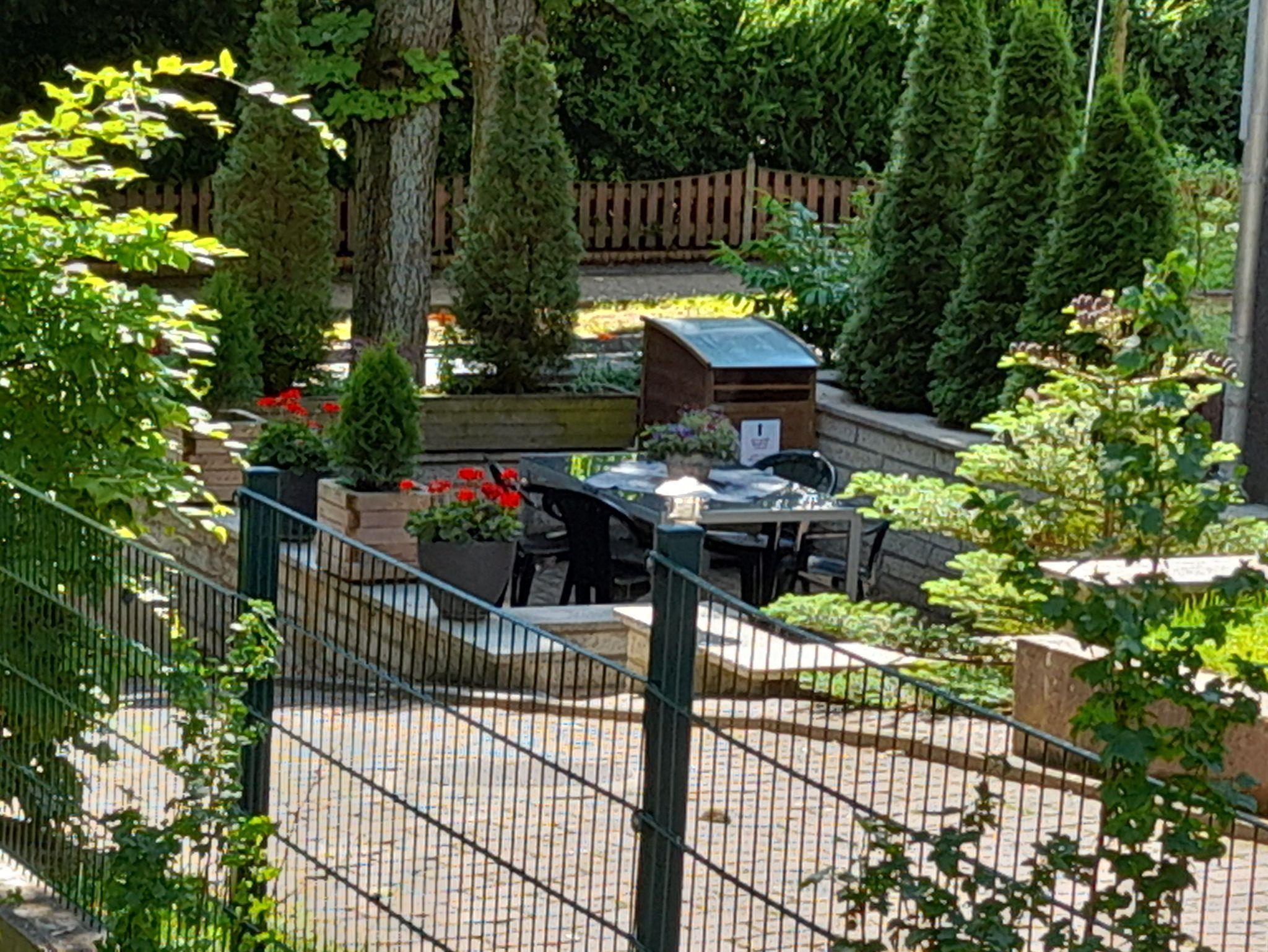 Die Ferienwohnung Kastanienblick befindet sich im Souterrain des Hauses und verfügt über einen separaten Eingang. Vor der Wohnung gibt es in den Sommermonaten eine möblierte Terrasse. Die kleine Pantryküche befindet sich im Eingangsbereich der Wohnung. Für den Abwasch gibt es einen separaten Raum. Sie ist ausgestattet mit eine, 2-Platten-Kocher, Kühlschrank, Mikrowelle, Kaffeemaschine, Eierkocher und Wasserkocher. Besteck und Geschirr ist auch ausreichend vorhanden. Es gibt KEINEN Backofen!