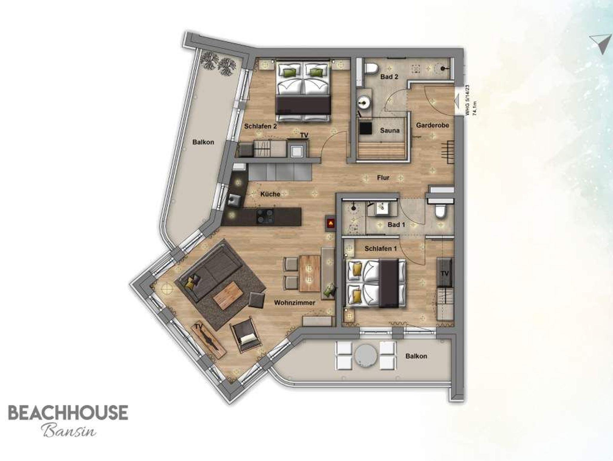 Im 3. Obergeschoss des Beachhouses werden Meerblick-Urlaubsträume wahr. Auf 69 Quadratmetern lichten Wohndesigns können bis zu vier Personen und ein Kleinkind bis drei Jahre (im Kinderreisebett) ihren Ostseeurlaubsträumen mit viel Komfort frönen. Das Meer, das sich hier schon morgens auf einem der zwei Balkone mit glitzerndem Sonnenaufgang in den Blick legt, ist nur ein paar Meter entfernt. Meeresrauschen ist hier also garantiert. Einmal tief durchatmen, den Kopf frei bekommen, abschalten und wohlfühlen ? in diesem Appartement gelingt das schon beim Eintreten in das lichtdurchflutete Wohnzimmer. Stilvoll und harmonisch eingerichtet fällt das Entspannen auf der bequemen Couch oder dem nordischen Design-Schaukelstuhl aus Leder nicht schwer. Ein großer Flat-TV und eine Hi-Fi-Anlage mit bluetooth sorgen für Unterhaltung. Blickfang an kühlen Tagen ist auf alle Fälle der Gas-Kamin aus Glas. Wenn sie ihn während des Essens am schönen Essplatz anmachen, zaubert er per Knopfdruck eine romantische Dinner-Atmosphäre. Zum Wohn-Essbereich hin geöffnet ist die mit hochwertigen Geräten und edlem Geschirr vollausgestattete Küche. Die nach drei Seiten frei zugängliche Kochinsel ist ein ideale Raumteiler. So können alle beim Kochen, Braten und Schmausen zusammen sein. In der Küche steht ebenfalls ein Wasch-Trockner zu Ihrer Verfügung. Vom Wohnzimmer aus haben Sie Zugang zu gleich zwei Balkonen. Ein kleinerer (8 Quadratmeter groß) hat freien Blick auf die Ostsee. Vom zweiten Balkon (9 Quadratmeter groß) aus können Sie den ganz Tag die Sonne hoch über den Dächern der Bansiner Bädervillen genießen. Denn er ist zum Süd-Westen hin ausgerichtet. Von beiden Schlafzimmern aus haben Sie ebenfalls Zugang zu jeweils einem der beiden Balkone. Beide Zimmer haben auch einen Flat-TV. Genießen Sie hier die Ruhe und gönnen Sie sich eine erholsame Nacht in den komfortablen Boxspringdoppelbetten (1,60 m x 2,00 m und 1,80 m x 2,00 m). Die Wohnung verfügt zudem über zwei Bäder mit Regendusche, Waschtisch und WC. Im Masterbad erwartet Sie sogar noch eine Finnische Sauna. Kommen Sie bei muscheligen Temperaturen ordentlich ins Schwitzen. Denn die kleine Wellnessoase steht Ihnen kostenfrei zur Verfügung. Ebenso wie das WLAN. Für Ihren Rundum-Komfort haben wir bei der Anreise die Betten bereits bezogen und Handtücher bereit gelegt. In der hochmodernen Tiefgarage ist der Stellplatz Nr. 23 für Ihre Wohnung reserviert.