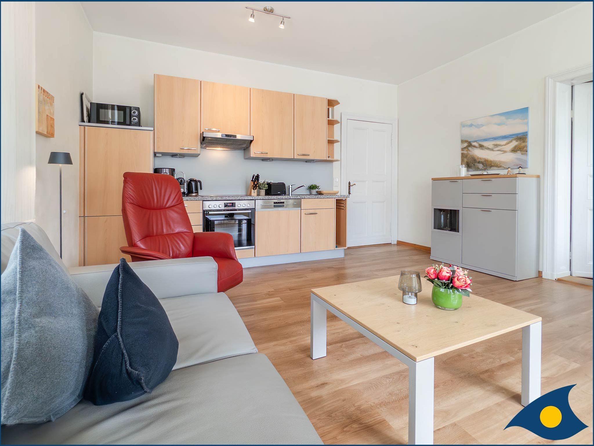 Der Wohnraum bildet den Mittelpunkt des Appartements. Hier starten Sie den Tag mit einem gemeinsamen Frühstück, planen die Ausflüge in das idyllische Hinterland, an den Strand oder den Sehenswürdigkeiten der Insel oder treffen sich zu einem gemütlichen Fernsehabend.