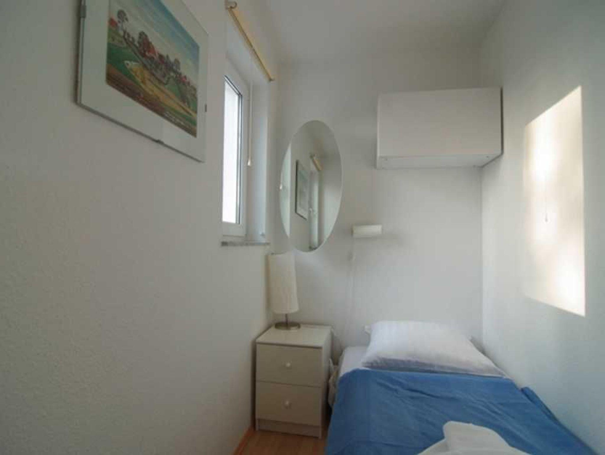 Dieses moderne und komfortable Appartement verfügt über einen Wohnraum mit integrierter, sehr gut ausgestatteter Küchenzeile, ein Schlafzimmer mit Doppelbett, das auch zu Einzelbetten umfunktioniert werden kann und ein zweites Schlafzimmer mit einem Einzelbett. Die Wohnung ist ideal für kleine Familien. Bücher, Spiele und ein CD-Player stehen für Sie bereit. Vom Glaserker im Wohnzimmer reicht der Blick bis hinüber zum Meer.