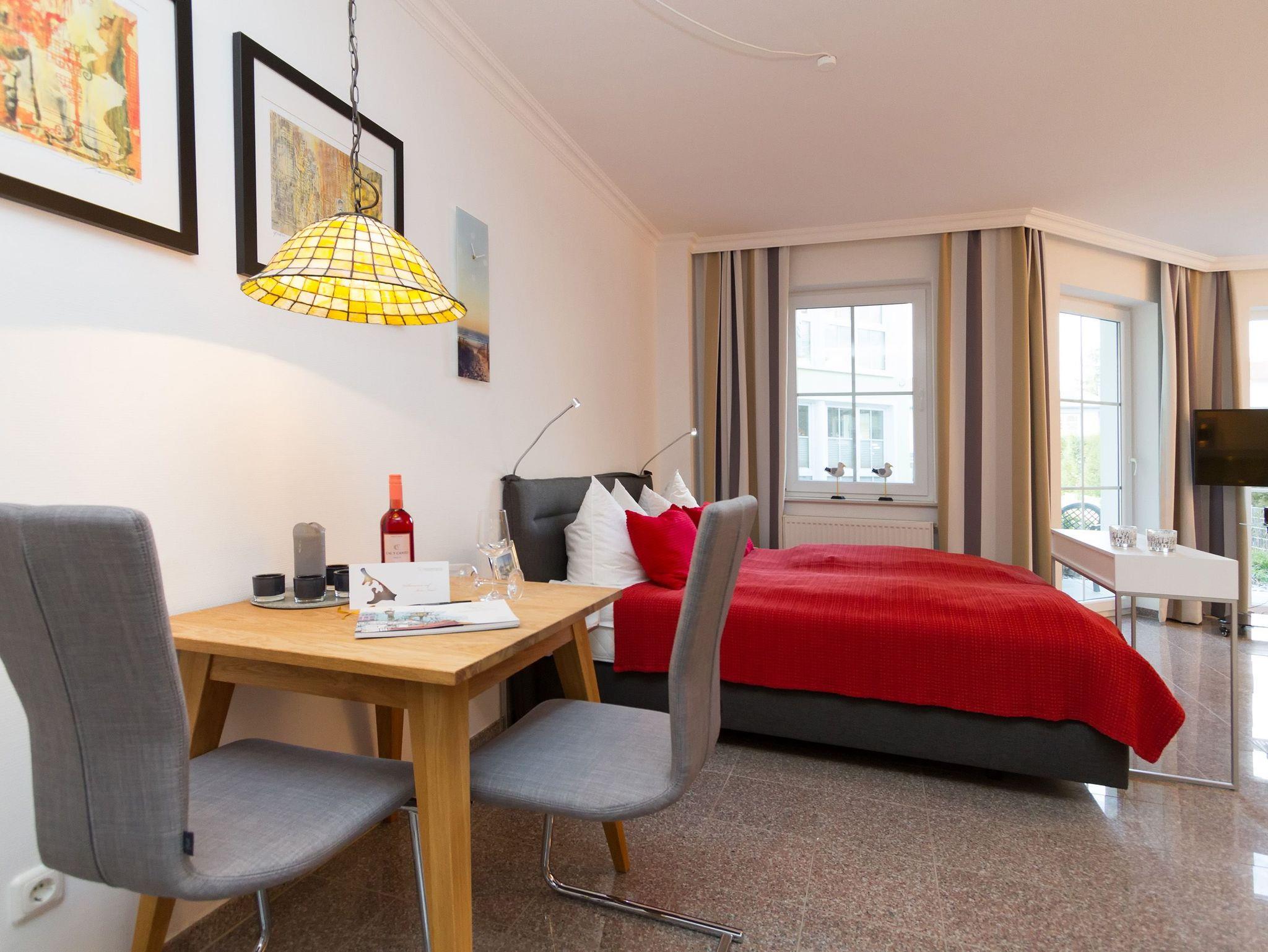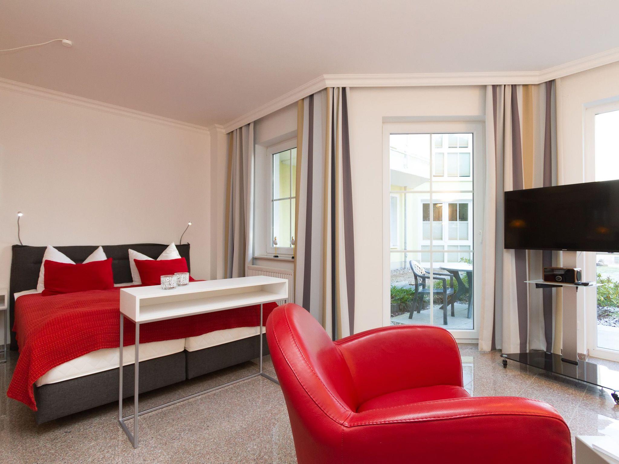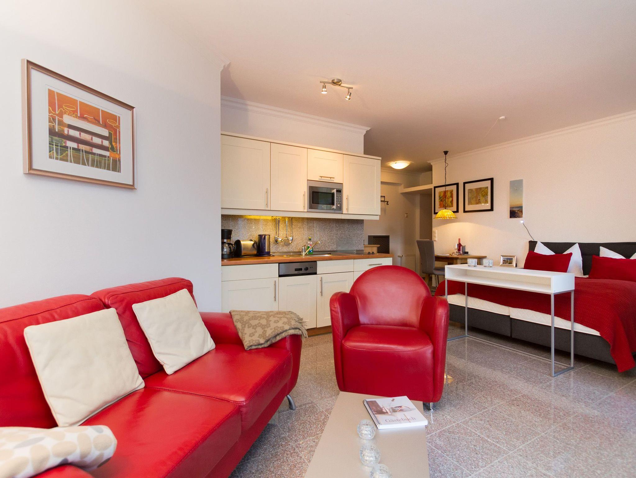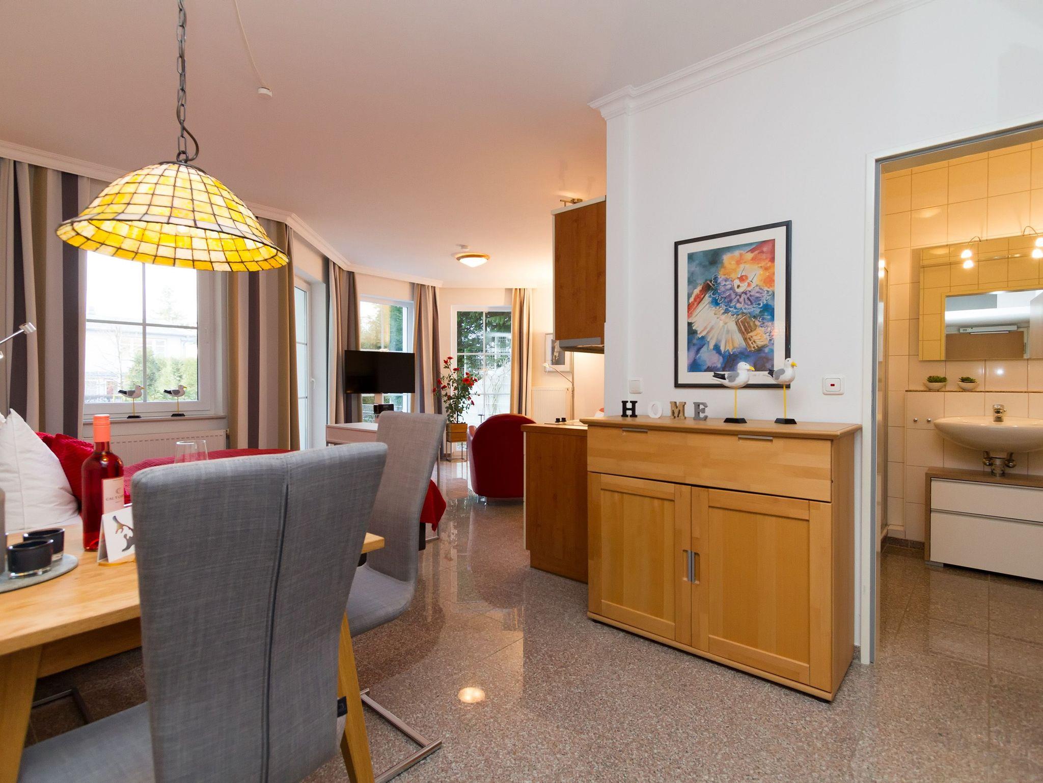 Im Erdgeschoss der Dünenresidenz in Bansin, direkt an der Promenade erwartet Sie ein komfortables und stilvolles Urlaubsdomizil mit einer wunderschönen und windgeschützten Terrasse zur Südseite. Das Ein-Zimmer-Appartement bietet mit seinen 40 Quadratmetern Platz für zwei Personen, ein Kleinkind (bis drei Jahre im Kinderreisebett) und den geliebten vierbeinigen Freund. Denn hier darf sich auch das liebe Haustier einmal so richtig entspannen. Der geräumige und offene Wohn-Schlafbereich mit Granitboden ist in hellen und warmen Rot-Weiß-Tönen gehalten. Eine bequeme Ledersitzgruppe lädt zum Relaxen ein. Der Flat-TV sorgt für Unterhaltung. Spaß macht das Boxspringdoppelbett (1,60 m x 2,00 m) nicht nur beim Schlafen. Kommt der Hunger, finden Sie in der an Geräten und Geschirr voll ausgestatteten und zum Wohnzimmer ebenfalls offenen Küche alles, was Sie für das Zubereiten köstlicher Mahlzeiten benötigen. Das Badezimmer verfügt über eine Dusche. Für Ihre vollkommene Auszeit sind die Betten bezogen und Handtücher liegen bereit. Zu dieser Wohnung gehört ein Pkw-Stellplatz vor dem Haus, Nummer 61. In den Monaten April bis Juni und September bis November haben Sie zudem freien und kostenlosen Zugang zum Wellnessbereiches des nur 200 Meter entfernten Kaiser Spa Hotel Zur Post.