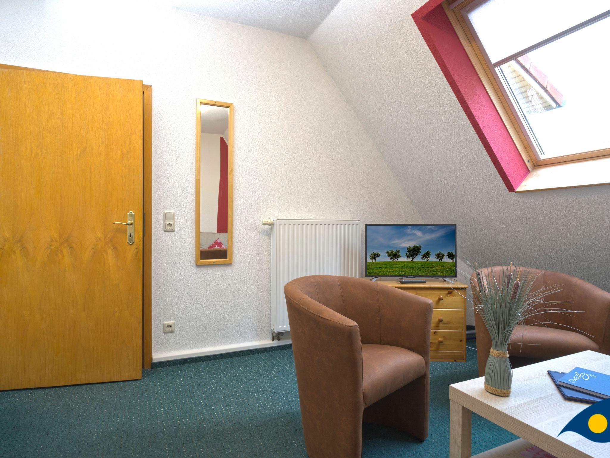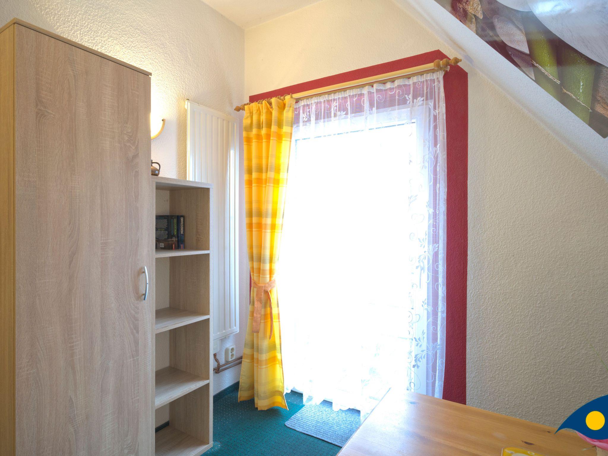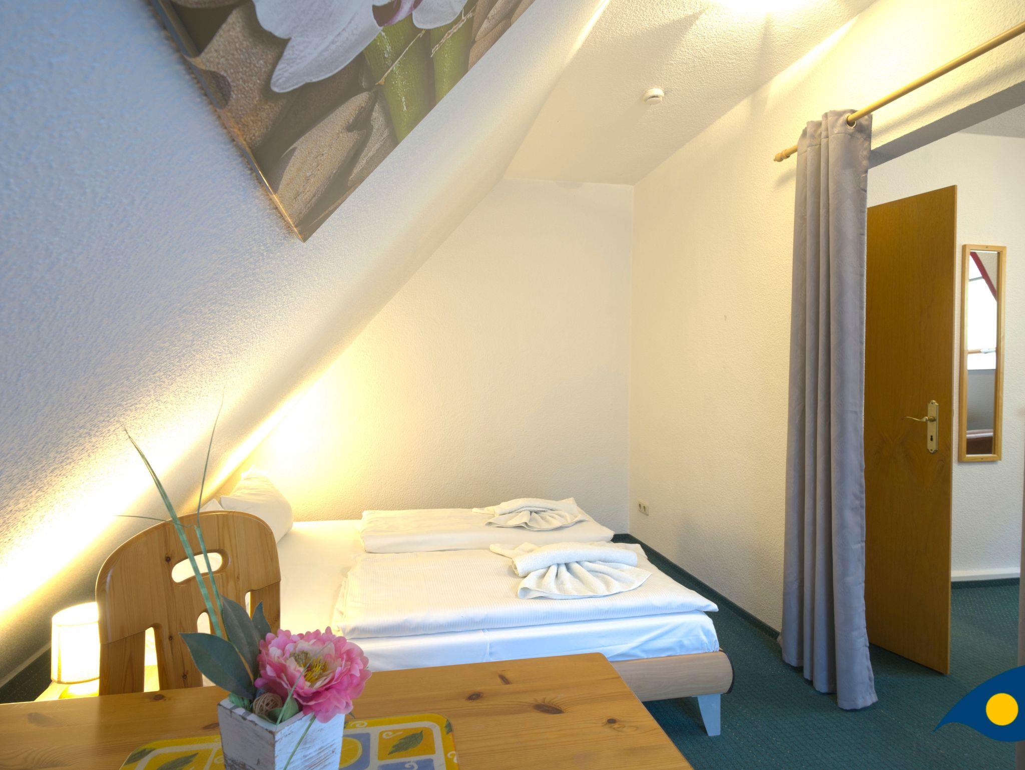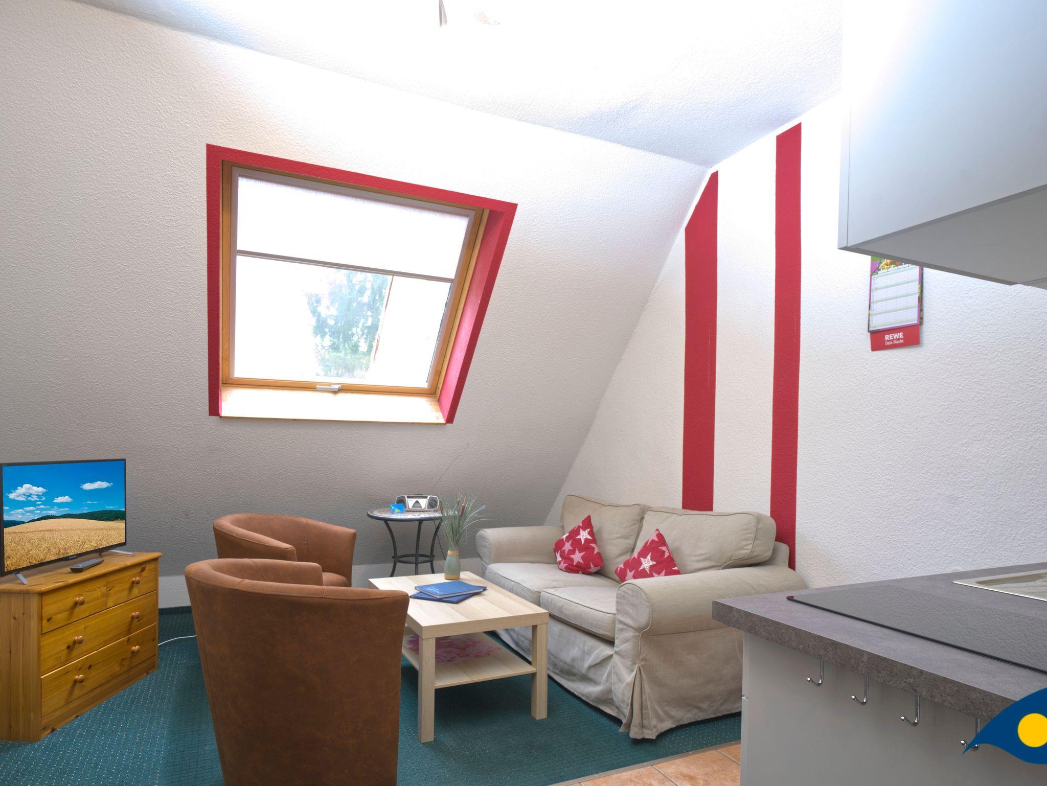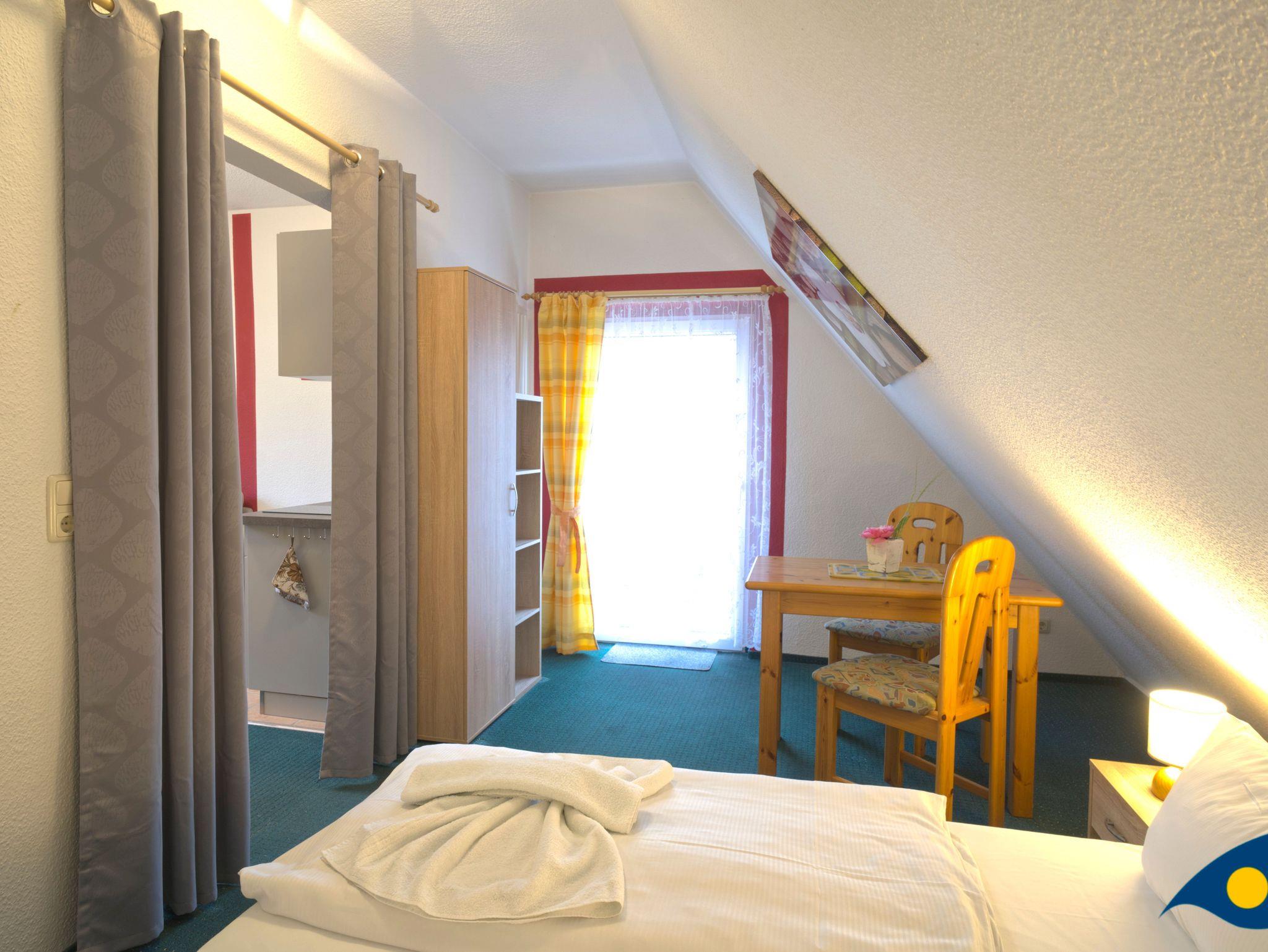 Diese 2-Zimmer-Ferienwohnung bietet Ihnen auf 36 qm Wohnfläche Gemütlichkeit unterm Dach im Haus der Ferienwohnungen „Kirchstraße“. Hier verbringen 2 Personen einen erholsamen Urlaub. Neben dem Wohnzimmer mit der kleinen Essecke steht Ihnen ein Schlafzimmer mit einem bequemen Doppelbett und genügend Stauraum für Ihre Urlaubsgarderobe zur Verfügung. Die kleine Pantryküche ist im Wohnraum integriert. Der Balkon lädt zum Sonnenbaden oder einem Frühstück unterm freien Himmel ein. Das Badezimmer mit WC und Dusche ist mit einem Fenster ausgestattet. Das Appartement hat einen offen gestalteten Grundriss. Auf eine Tür zwischen dem Wohn- und Schlafraum wurde verzichtet, dadurch wirkt das Appartement noch großzügiger.