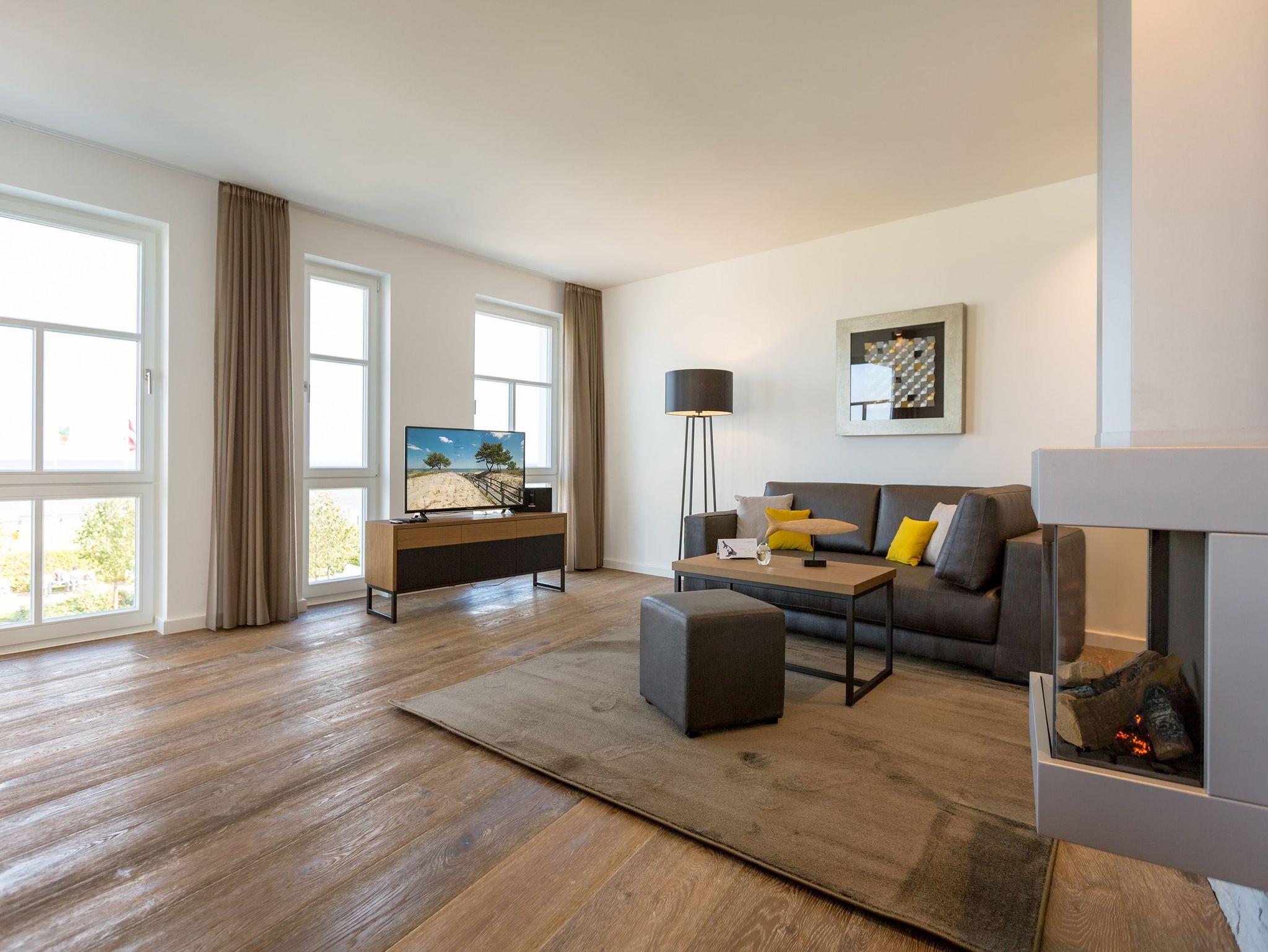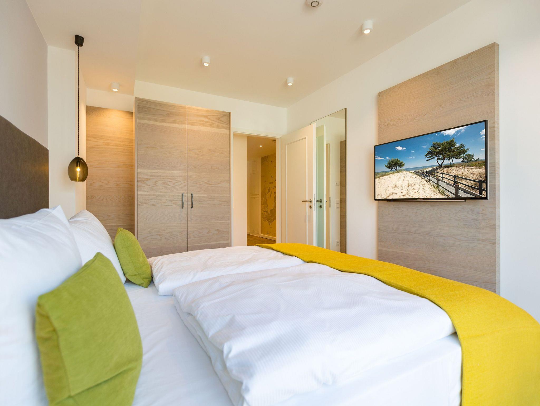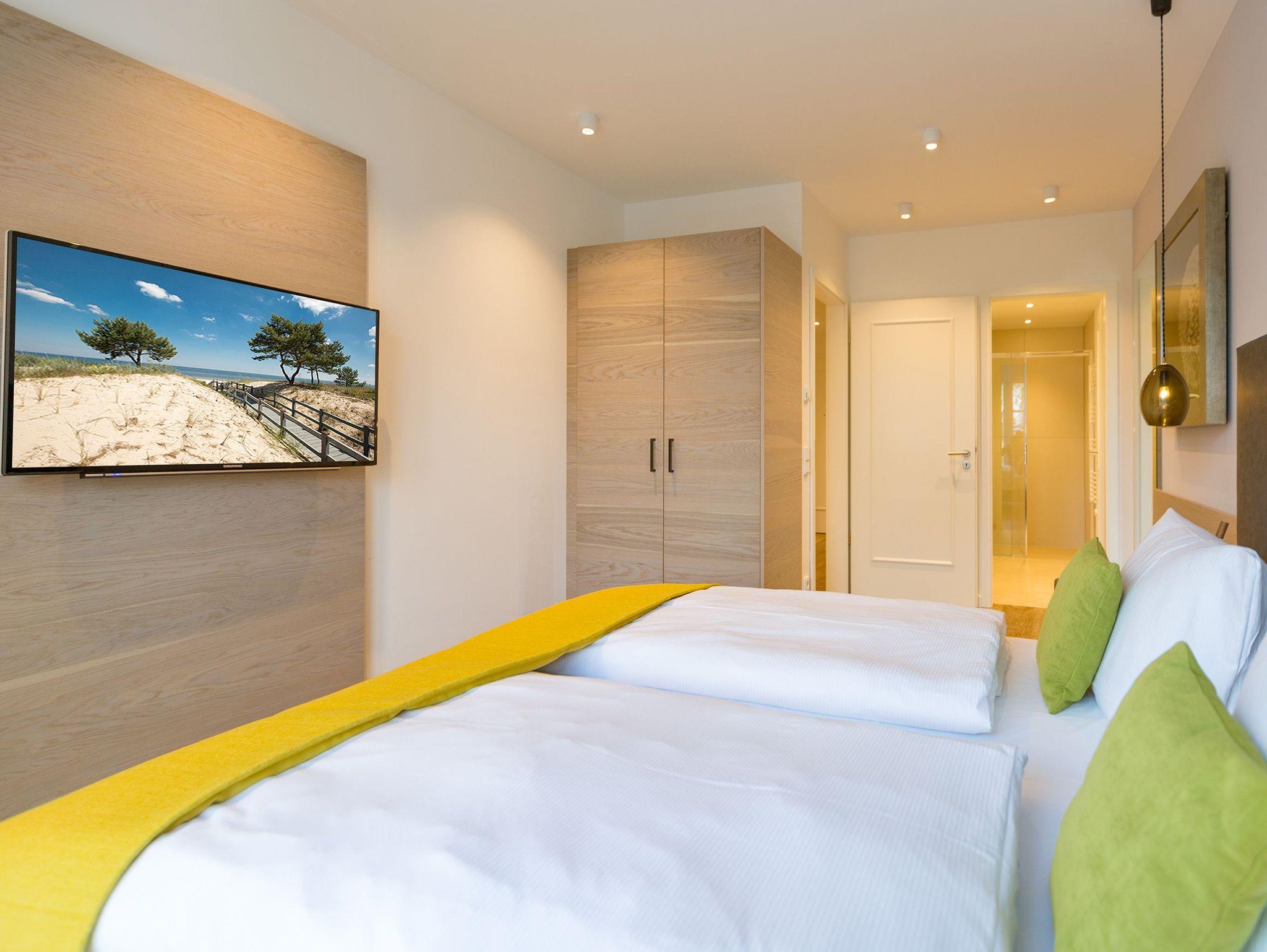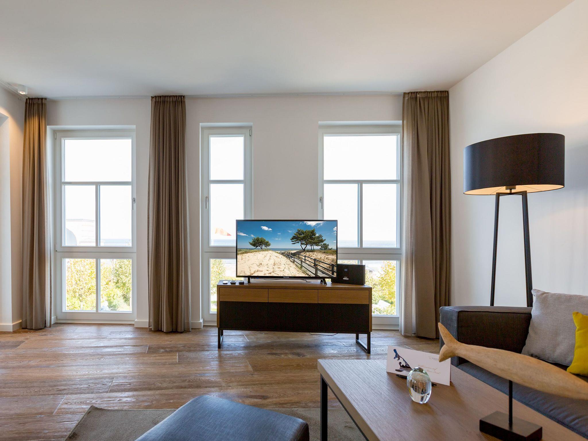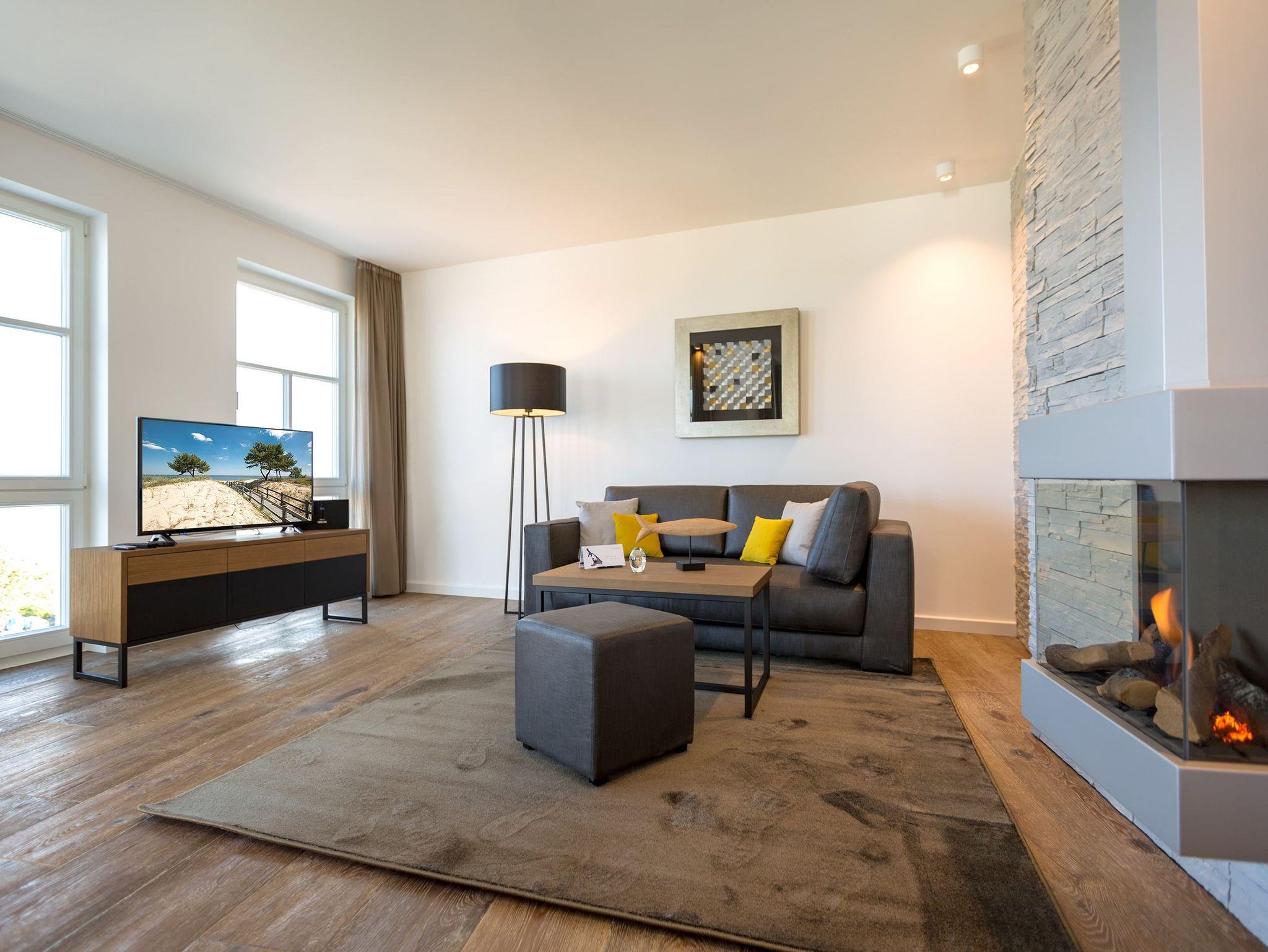 Alles aus einem Guss ? in diesem wunderschönen Drei-Zimmer-Feriendomizil stimmt einfach alles. Panorama-Meerblick, stylisches Wohndesign und Wohnkomfort für bis zu vier Personen, ein Kleinkind bis drei Jahre (im Kinderreisebett) und das geliebte Haustier bietet dieses Appartement im 1. Stock auf 81 Quadratmetern. Hier können und brauchen Sie sich am Blick über das weite Blau der Ostsee gar nicht satt sehen. Ob morgens, wenn die Sonne aus dem Meer aufsteigt und die Wasseroberfläche glitzert als lägen tausende Diamanten darauf oder abends, wenn der Himmel über dem Horizont sich in den zartesten Rosatönen färbt ? in diesem Appartement wird Ihr Urlaub zu einem ganz besonderen Auszeiterlebnis. Denn neben dem Meerblick-Balkon (14 Quadratmeter groß), auf dem Sie auch wunderbar sitzen können, hat es eine erlesene Einrichtung zu bieten. Naturmaterialien wie Holz und Stein, ein harmonisches Farbkonzept und aufeinander abgestimmte Möbel sorgen für eine entspannte Atmosphäre. Der Gas-Kamin schafft an kühlen Tagen kuschelige Flammenspiele. Der große Flat-TV und die bluetooth-Hi-Fi-Anlage gegenüber der gemütlichen Sofa-Sitzgruppe bieten Home-Entertainment vom Feinsten. Viel Raum und Platz haben Sie in dem großen und offenen Wohn-Esszimmer. Genießen Sie gemeinsame Dinner am Essplatz gleich neben der frei stehenden Kochinsel. Die Küche schließt sich nahtlos und ebenso offen an das Wohnzimmer an. Hier finden Sie alles, was Sie zum Kochen, Braten oder Backen brauchen. Hochwertige Markengeräte und erlesenes Geschirr ? die Küche ist vollausgestattet. Zwei Schlafzimmer bieten traumhaften Nächten wundervolle Bequemlichkeit. Boxspringdoppelbetten (jeweils 1,80 m x 2,00 m) sorgen für erholsamen Schlaf. Jedes Schlafzimmer verfügt über einen Flat-TV und einen großen Schrank mit viel Ablagemöglichkeiten. Außerdem verfügt die Wohnung über zwei Badezimmer mit Regendusche, Waschtisch und WC. Wellness-Liebhaber kommen in der Wohnung Nummer 1 ebenfalls auf ihre Kosten. Eine eigene Finnische Sauna heizt Ihnen im Masterbad an ungemütlichen Tagen und Abenden ordentlich ein. Lassen Sie los und entspannen Sie einfach drauf los! Wir haben für Sie die Betten bereits bezogen und Handtücher für Sie bereit gelegt. In der Wohnung befindet sich ein Hauswirtschaftsraum mit einem Waschtrockner. Es gibt einen Safe. Und das WLAN ist kostenfrei. In der modernen Tiefgarage ist für Sie der Stellplatz Nr. 1 im Doppelparker oben (max. Höhe 1,90m, max. Länge 5,10 m, max. Breite 2,50 m, max. Last 2.600 kg) reserviert.