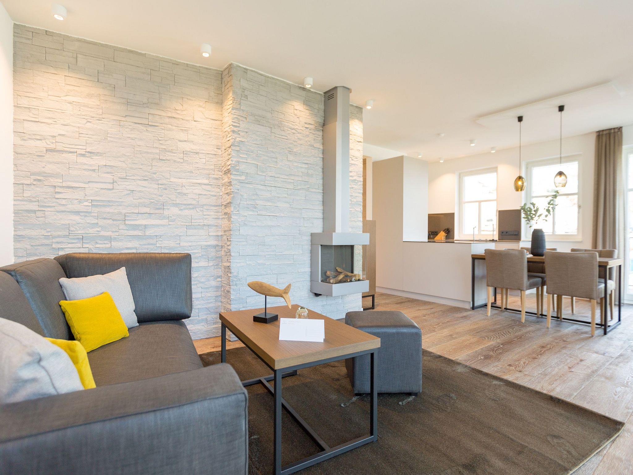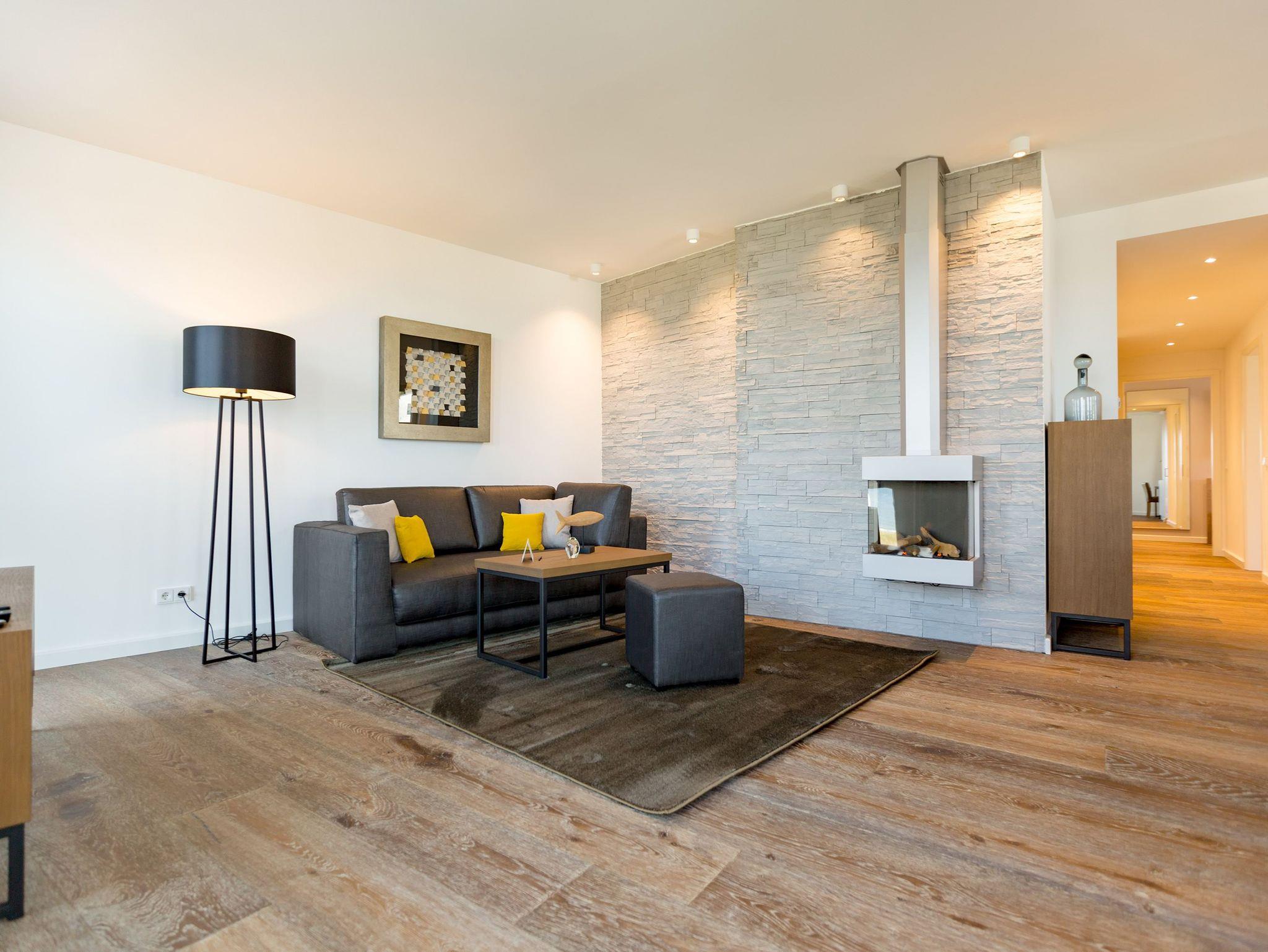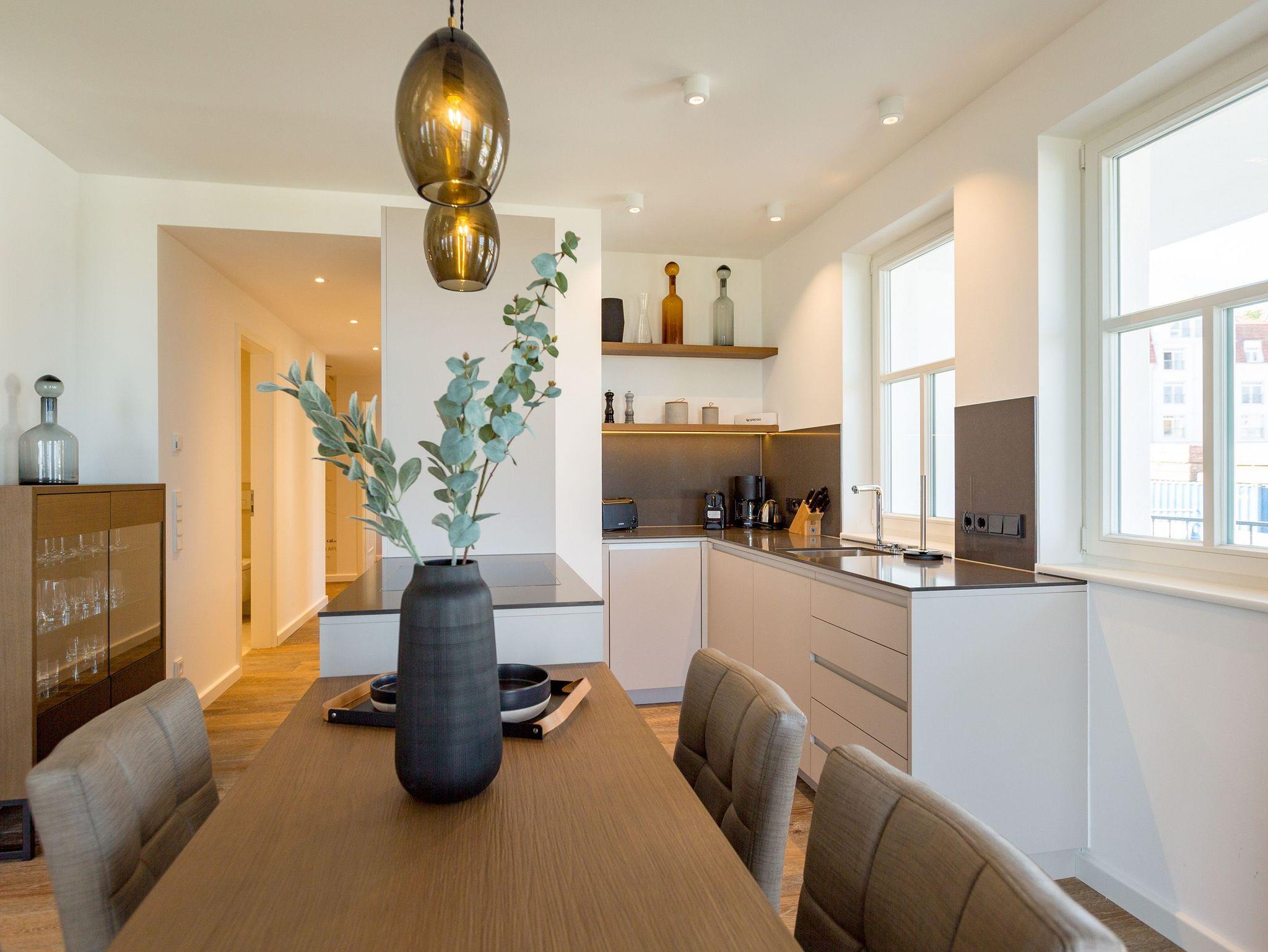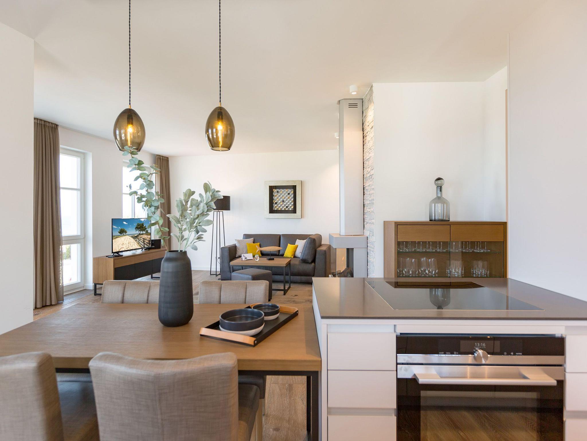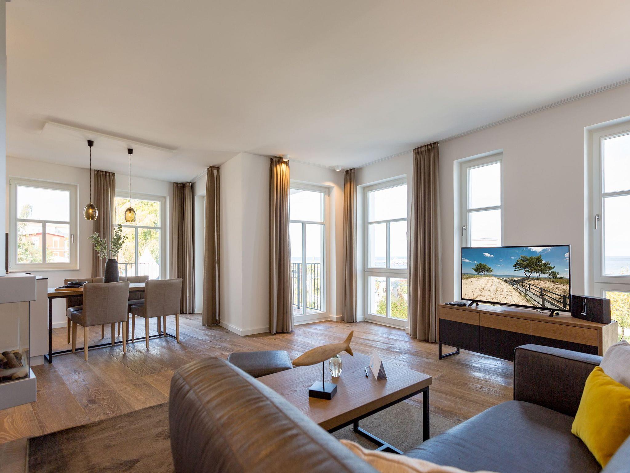 Alles aus einem Guss ? in diesem wunderschönen Drei-Zimmer-Feriendomizil stimmt einfach alles. Panorama-Meerblick, stylisches Wohndesign und Wohnkomfort für bis zu vier Personen, ein Kleinkind bis drei Jahre (im Kinderreisebett) und das geliebte Haustier bietet dieses Appartement im 1. Stock auf 81 Quadratmetern. Hier können und brauchen Sie sich am Blick über das weite Blau der Ostsee gar nicht satt sehen. Ob morgens, wenn die Sonne aus dem Meer aufsteigt und die Wasseroberfläche glitzert als lägen tausende Diamanten darauf oder abends, wenn der Himmel über dem Horizont sich in den zartesten Rosatönen färbt ? in diesem Appartement wird Ihr Urlaub zu einem ganz besonderen Auszeiterlebnis. Denn neben dem Meerblick-Balkon (14 Quadratmeter groß), auf dem Sie auch wunderbar sitzen können, hat es eine erlesene Einrichtung zu bieten. Naturmaterialien wie Holz und Stein, ein harmonisches Farbkonzept und aufeinander abgestimmte Möbel sorgen für eine entspannte Atmosphäre. Der Gas-Kamin schafft an kühlen Tagen kuschelige Flammenspiele. Der große Flat-TV und die bluetooth-Hi-Fi-Anlage gegenüber der gemütlichen Sofa-Sitzgruppe bieten Home-Entertainment vom Feinsten. Viel Raum und Platz haben Sie in dem großen und offenen Wohn-Esszimmer. Genießen Sie gemeinsame Dinner am Essplatz gleich neben der frei stehenden Kochinsel. Die Küche schließt sich nahtlos und ebenso offen an das Wohnzimmer an. Hier finden Sie alles, was Sie zum Kochen, Braten oder Backen brauchen. Hochwertige Markengeräte und erlesenes Geschirr ? die Küche ist vollausgestattet. Zwei Schlafzimmer bieten traumhaften Nächten wundervolle Bequemlichkeit. Boxspringdoppelbetten (jeweils 1,80 m x 2,00 m) sorgen für erholsamen Schlaf. Jedes Schlafzimmer verfügt über einen Flat-TV und einen großen Schrank mit viel Ablagemöglichkeiten. Außerdem verfügt die Wohnung über zwei Badezimmer mit Regendusche, Waschtisch und WC. Wellness-Liebhaber kommen in der Wohnung Nummer 1 ebenfalls auf ihre Kosten. Eine eigene Finnische Sauna heizt Ihnen im Masterbad an ungemütlichen Tagen und Abenden ordentlich ein. Lassen Sie los und entspannen Sie einfach drauf los! Wir haben für Sie die Betten bereits bezogen und Handtücher für Sie bereit gelegt. In der Wohnung befindet sich ein Hauswirtschaftsraum mit einem Waschtrockner. Es gibt einen Safe. Und das WLAN ist kostenfrei. In der modernen Tiefgarage ist für Sie der Stellplatz Nr. 1 im Doppelparker oben (max. Höhe 1,90m, max. Länge 5,10 m, max. Breite 2,50 m, max. Last 2.600 kg) reserviert.