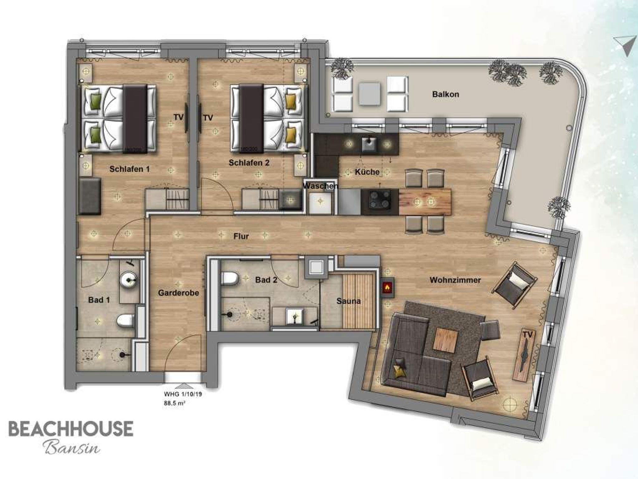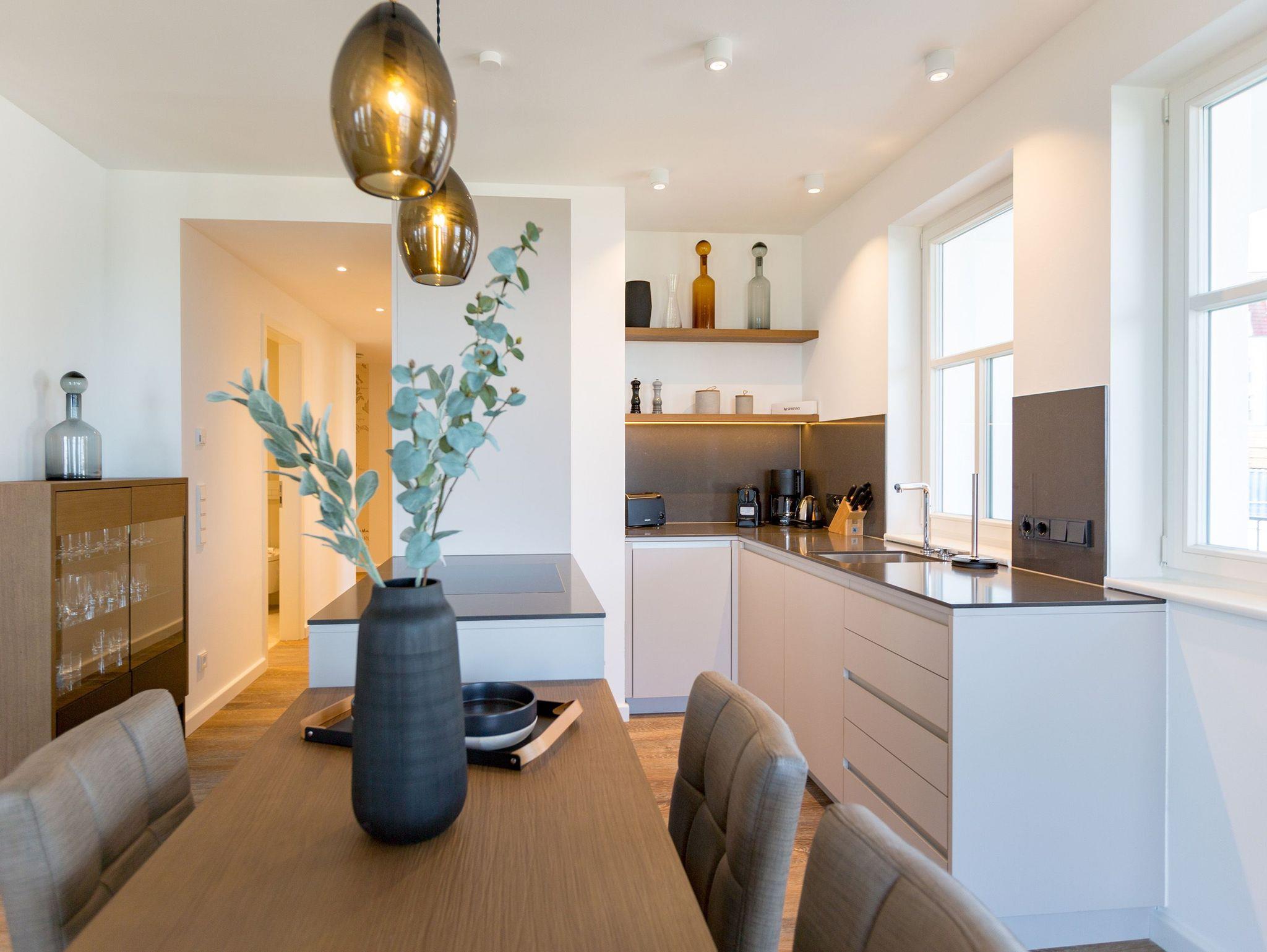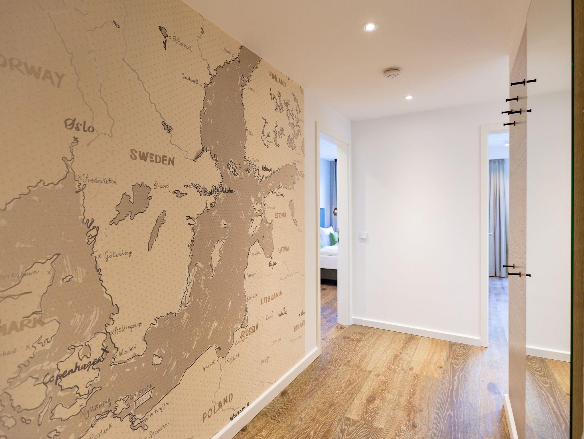 Alles aus einem Guss in diesem wunderschönen Drei-Zimmer-Feriendomizil stimmt einfach alles. Panorama-Meerblick, stylisches Wohndesign und Wohnkomfort für bis zu vier Personen, ein Kleinkind bis drei Jahre (im Kinderreisebett) und das geliebte Haustier bietet dieses Appartement im 1. Stock auf 81 Quadratmetern. Hier können und brauchen Sie sich am Blick über das weite Blau der Ostsee gar nicht satt sehen. Ob morgens, wenn die Sonne aus dem Meer aufsteigt und die Wasseroberfläche glitzert als lägen tausende Diamanten darauf oder abends, wenn der Himmel über dem Horizont sich in den zartesten Rosatönen färbt in diesem Appartement wird Ihr Urlaub zu einem ganz besonderen Auszeiterlebnis. Denn neben dem Meerblick-Balkon (14 Quadratmeter groß), auf dem Sie auch wunderbar sitzen können, hat es eine erlesene Einrichtung zu bieten. Naturmaterialien wie Holz und Stein, ein harmonisches Farbkonzept und aufeinander abgestimmte Möbel sorgen für eine entspannte Atmosphäre. Der Gas-Kamin schafft an kühlen Tagen kuschelige Flammenspiele. Der große Flat-TV und die bluetooth-Hi-Fi-Anlage gegenüber der gemütlichen Sofa-Sitzgruppe bieten Home-Entertainment vom Feinsten. Viel Raum und Platz haben Sie in dem großen und offenen Wohn-Esszimmer. Genießen Sie gemeinsame Dinner am Essplatz gleich neben der frei stehenden Kochinsel. Die Küche schließt sich nahtlos und ebenso offen an das Wohnzimmer an. Hier finden Sie alles, was Sie zum Kochen, Braten oder Backen brauchen. Hochwertige Markengeräte und erlesenes Geschirr die Küche ist vollausgestattet. Zwei Schlafzimmer bieten traumhaften Nächten wundervolle Bequemlichkeit. Boxspringdoppelbetten (jeweils 1,80 m x 2,00 m) sorgen für erholsamen Schlaf. Jedes Schlafzimmer verfügt über einen Flat-TV und einen großen Schrank mit viel Ablagemöglichkeiten. Außerdem verfügt die Wohnung über zwei Badezimmer mit Regendusche, Waschtisch und WC. Wellness-Liebhaber kommen in der Wohnung Nummer 1 ebenfalls auf ihre Kosten. Eine eigene Finnische Sauna heizt Ihnen im Masterbad an ungemütlichen Tagen und Abenden ordentlich ein. Lassen Sie los und entspannen Sie einfach drauf los! Wir haben für Sie die Betten bereits bezogen und Handtücher für Sie bereit gelegt. In der Wohnung befindet sich ein Hauswirtschaftsraum mit einem Waschtrockner. Es gibt einen Safe. Und das WLAN ist kostenfrei. In der modernen Tiefgarage ist für Sie der Stellplatz Nr. 1 im Doppelparker oben (max. Höhe 1,90m, max. Länge 5,10 m, max. Breite 2,50 m, max. Last 2.600 kg) reserviert.