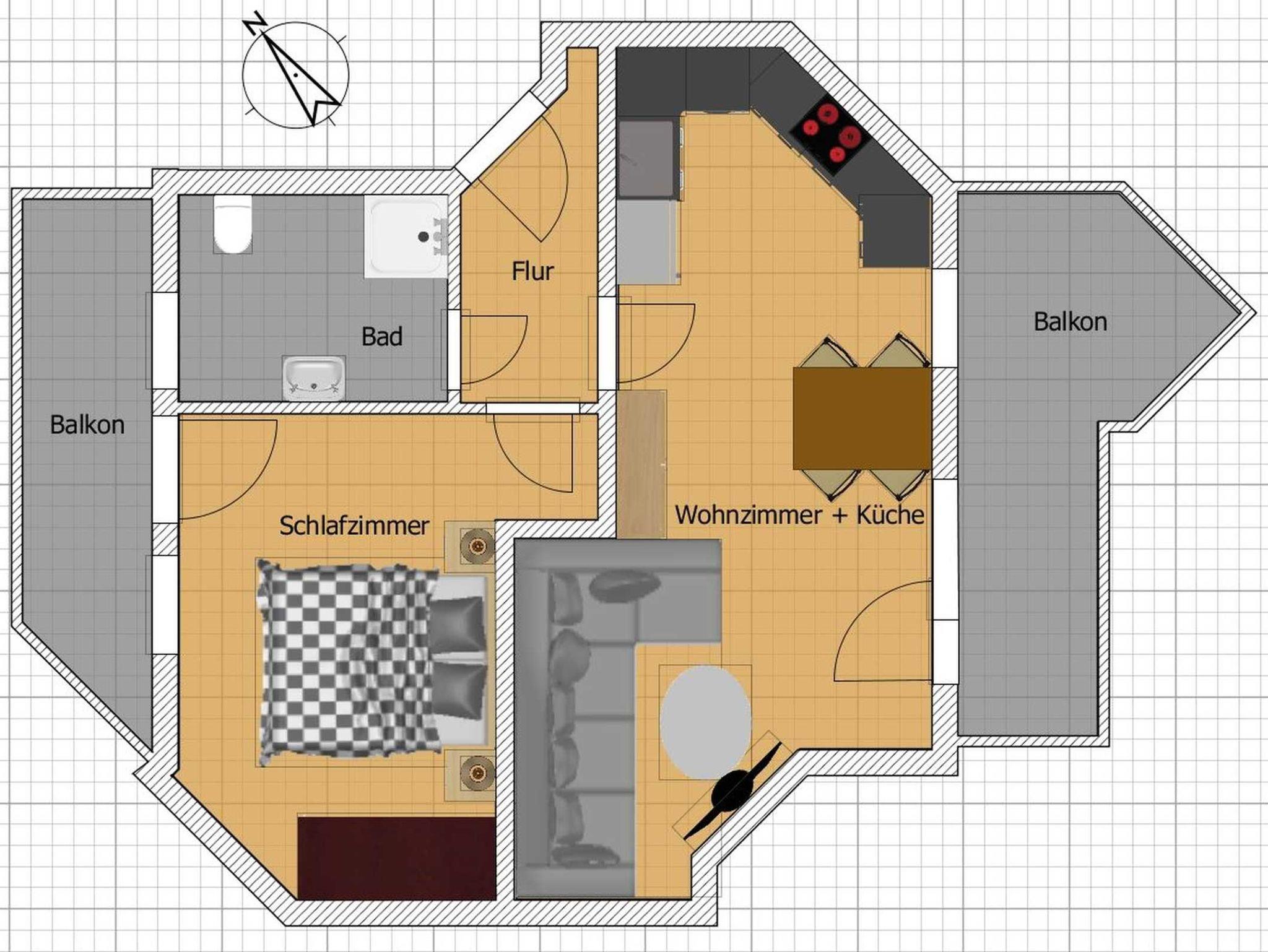 Zu dieser schön gelegenen 2-Zimmer-Ferienwohnung im 1. Obergeschoss der Dünenresidenz gehören zwei Balkone.