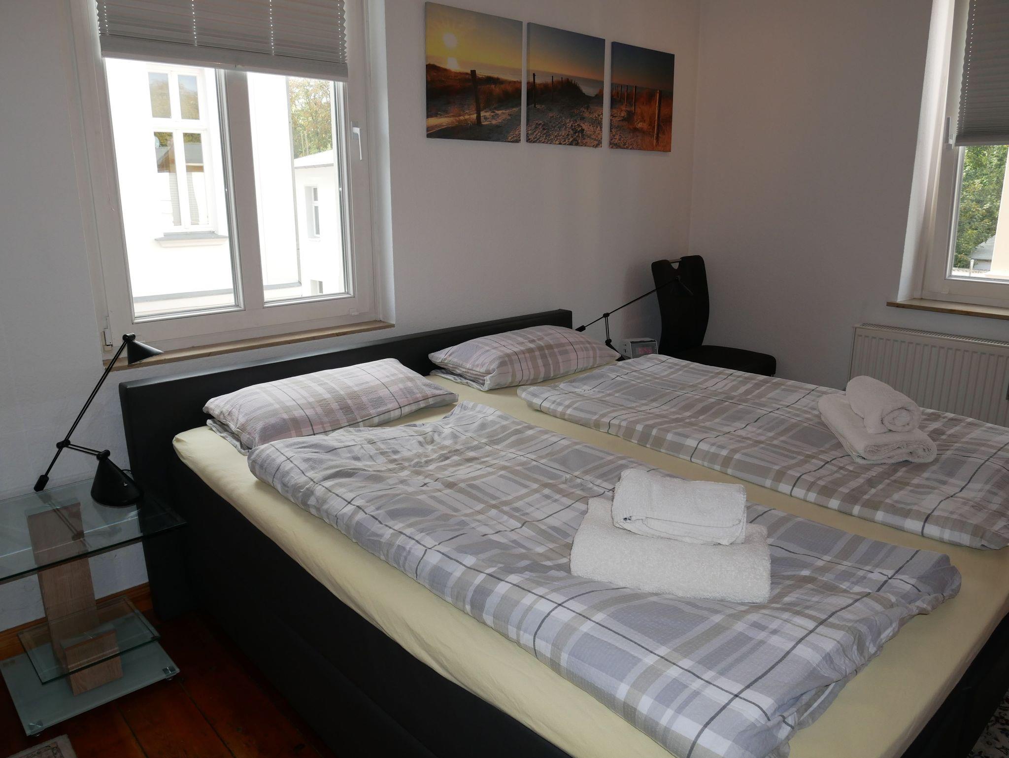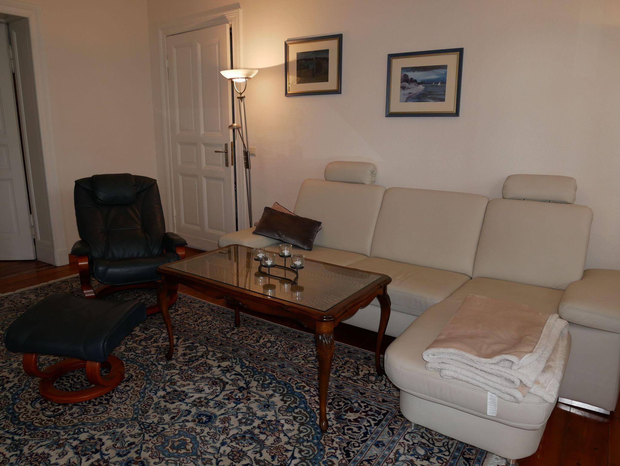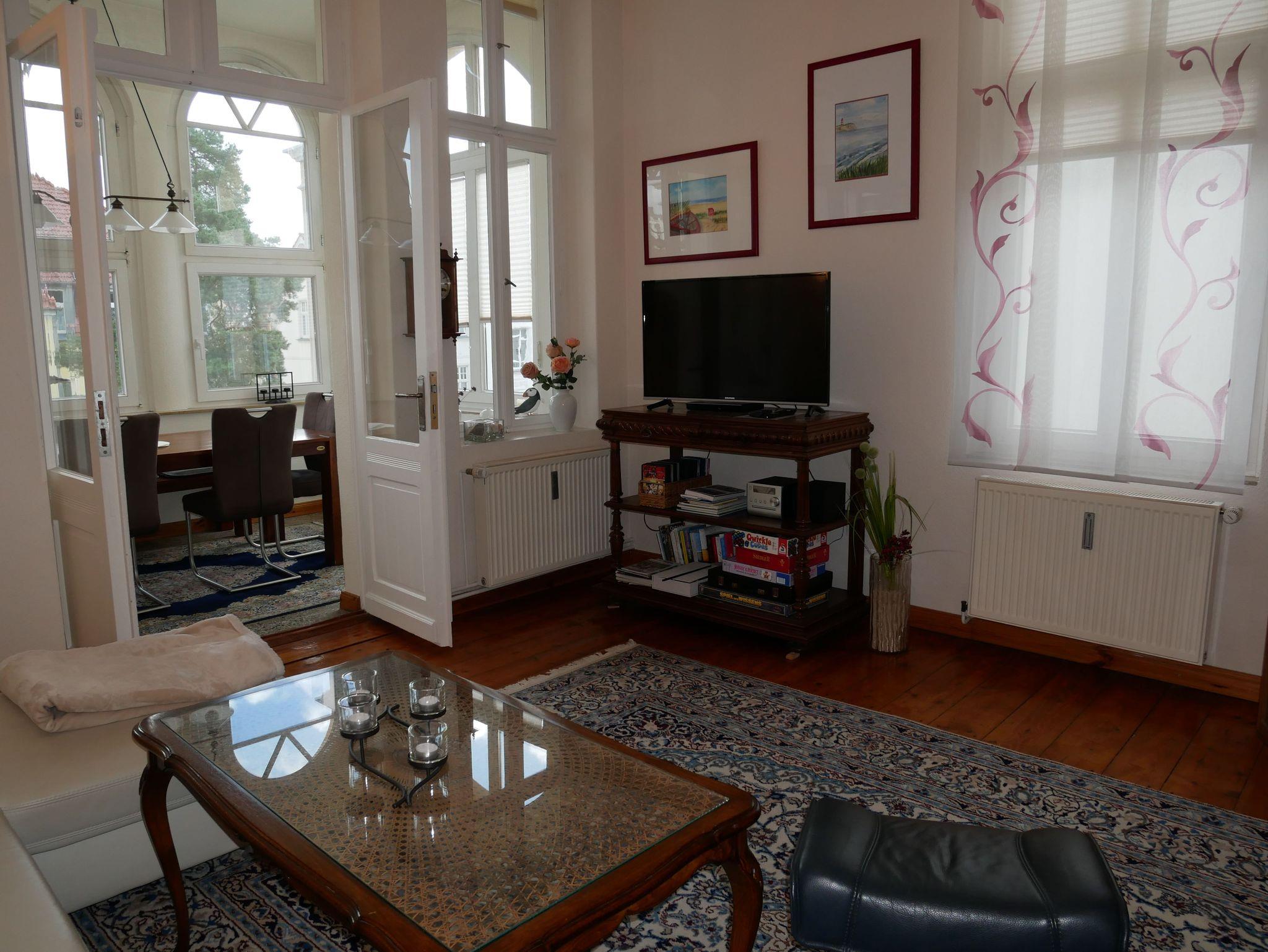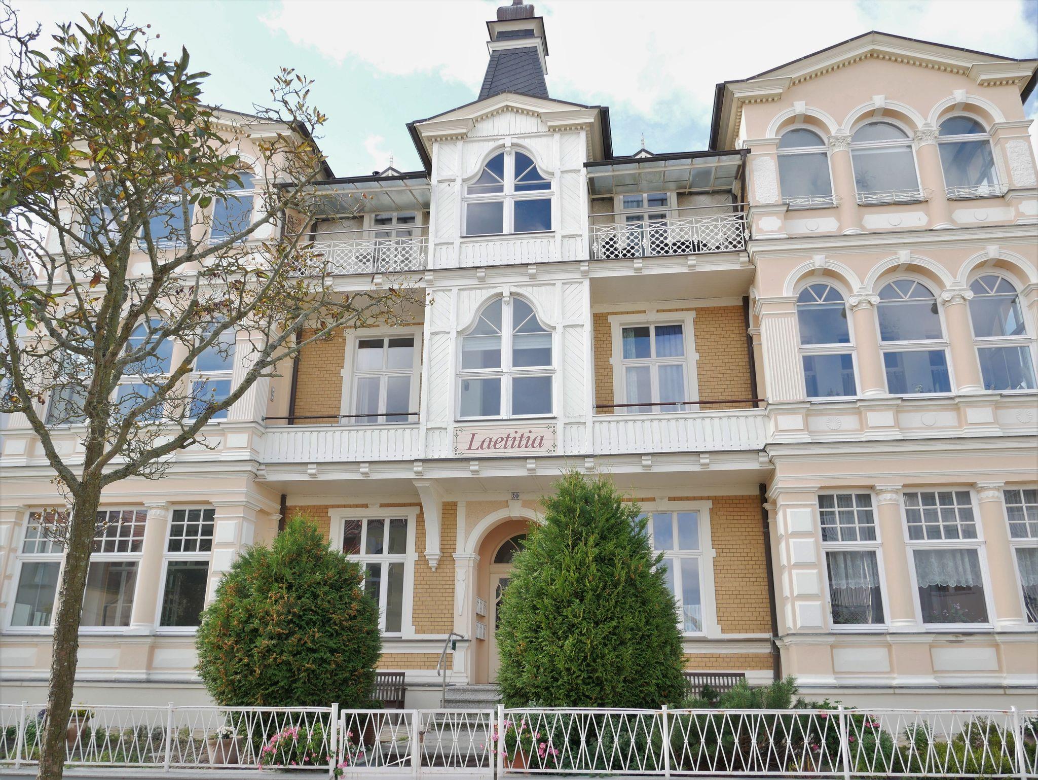 Die komfortable 90qm große Ferienwohnung befindet sim im 1. Obergeschoss der Villa Laetitia und bietet Ihnen sowohl einen kleinen Balkon als auch einen verglasten Wintergarten zur Ostseeseite. Die im klassischen Stil eingerichtete Ferienwohnung verfügt über zwei separate Schlafzimmer mit je einem Doppelbett und einem Kleiderschrank. Das großzügige Wohnzimmer ist mit einer gemütlichen Couch, einem Relaxsessel, Flachbild-TV und Musikanlage sowie DVD-Player ausgestattet. Im hellen Wintergarten befindet sich der große Esstisch. Die separate, moderne Küche ist mit Geschirrspüler, Induktionsherd, Backofen mit integrierter Mikrowelle und Kühlschrank mit Gefrierfach sowie Kaffeemaschine, Wasserkocher und Toaster ausgestattet. Das erste große Badezimmer ist mit einer Badewanne, Dusche, WC, Doppelwaschbecken und einer Waschmaschine ausgestattet.Das zweite Bad befindet sich en suite an einem der beiden Schlafzimmer und verfügt über Dusche und WC. Ein PKW Stellplatz steh Ihnen während des Aufenthaltes kostenfrei zur Verfügung. Die Erstaustattung Bettwäsche und Handtücher ist ebenfalls inkludiert.