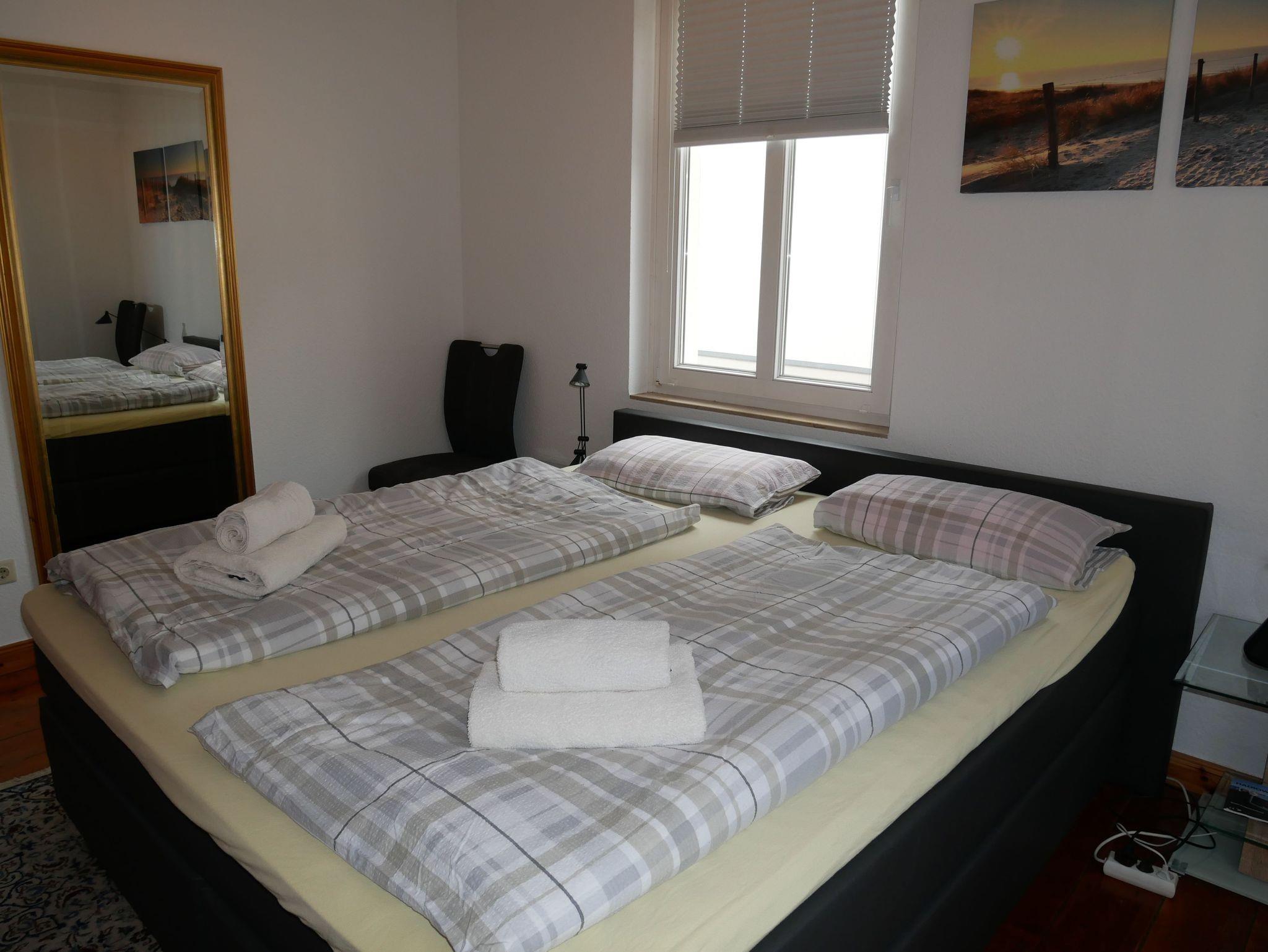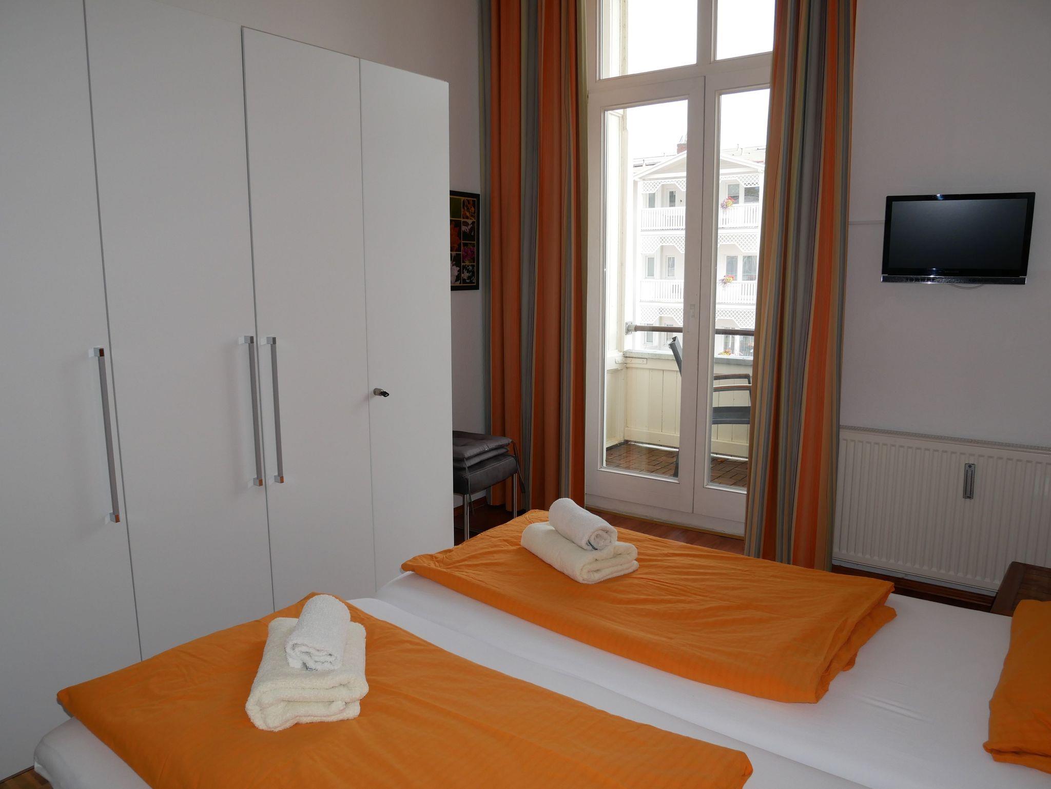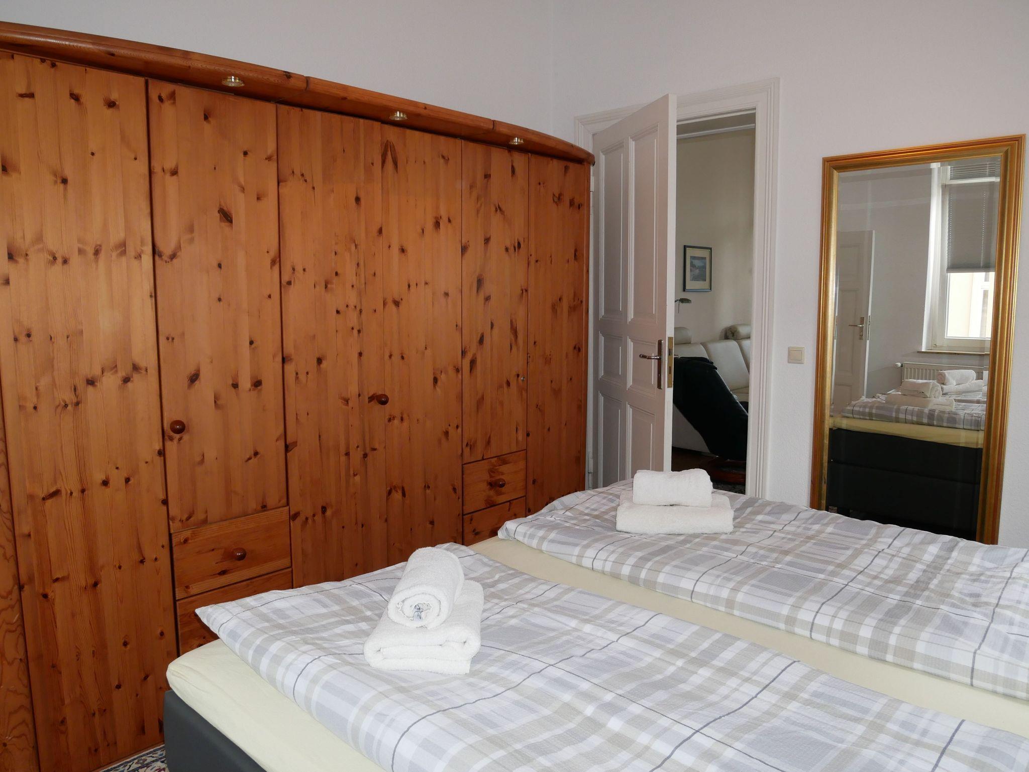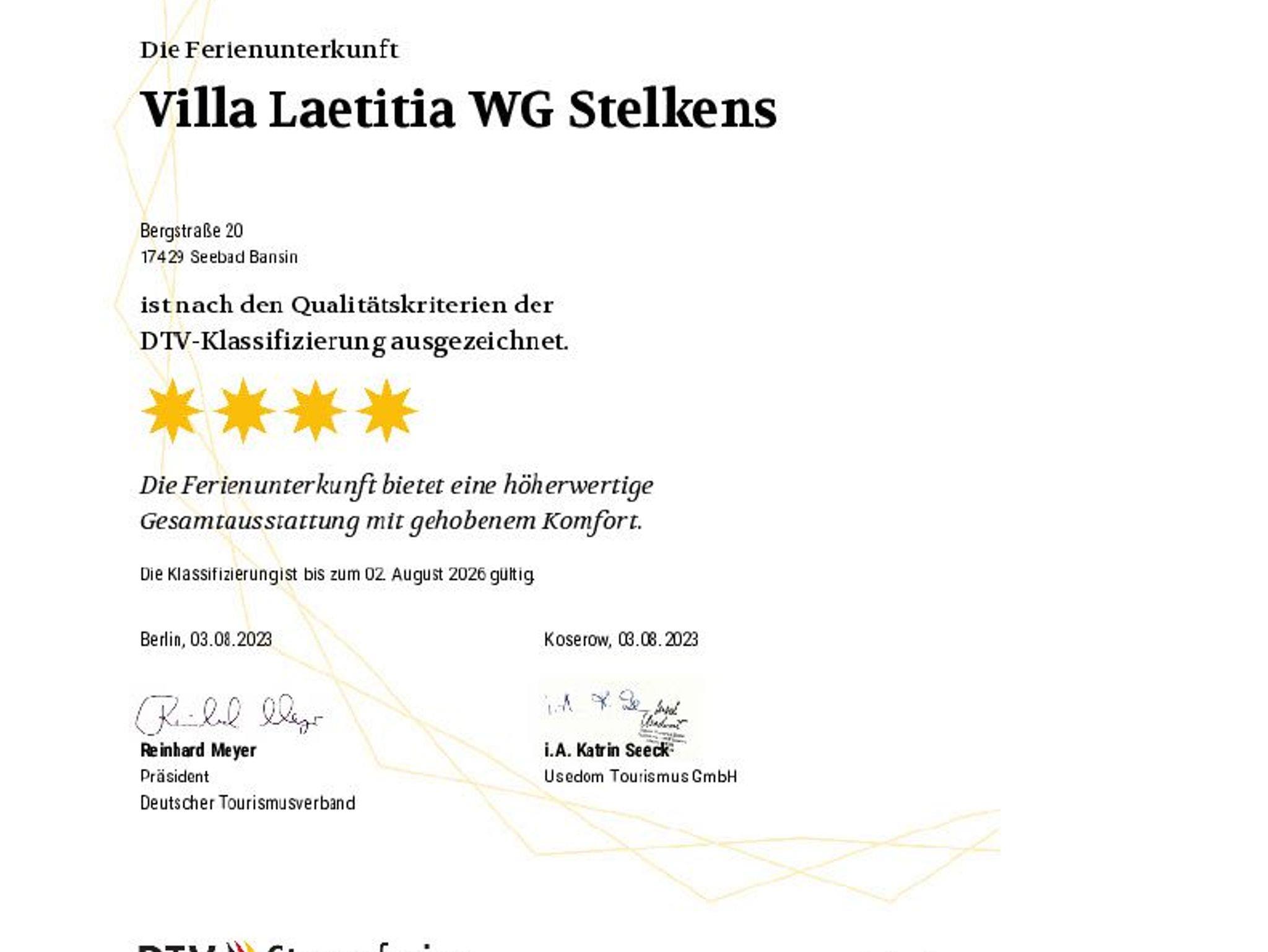 Die komfortable 90qm große Ferienwohnung befindet sim im 1. Obergeschoss der Villa Laetitia und bietet Ihnen sowohl einen kleinen Balkon als auch einen verglasten Wintergarten zur Ostseeseite. Die im klassischen Stil eingerichtete Ferienwohnung verfügt über zwei separate Schlafzimmer mit je einem Doppelbett und einem Kleiderschrank. Das großzügige Wohnzimmer ist mit einer gemütlichen Couch, einem Relaxsessel, Flachbild-TV und Musikanlage sowie DVD-Player ausgestattet. Im hellen Wintergarten befindet sich der große Esstisch. Die separate, moderne Küche ist mit Geschirrspüler, Induktionsherd, Backofen mit integrierter Mikrowelle und Kühlschrank mit Gefrierfach sowie Kaffeemaschine, Wasserkocher und Toaster ausgestattet. Das erste große Badezimmer ist mit einer Badewanne, Dusche, WC, Doppelwaschbecken und einer Waschmaschine ausgestattet.Das zweite Bad befindet sich en suite an einem der beiden Schlafzimmer und verfügt über Dusche und WC. Ein PKW Stellplatz steh Ihnen während des Aufenthaltes kostenfrei zur Verfügung. Die Erstaustattung Bettwäsche und Handtücher ist ebenfalls inkludiert.