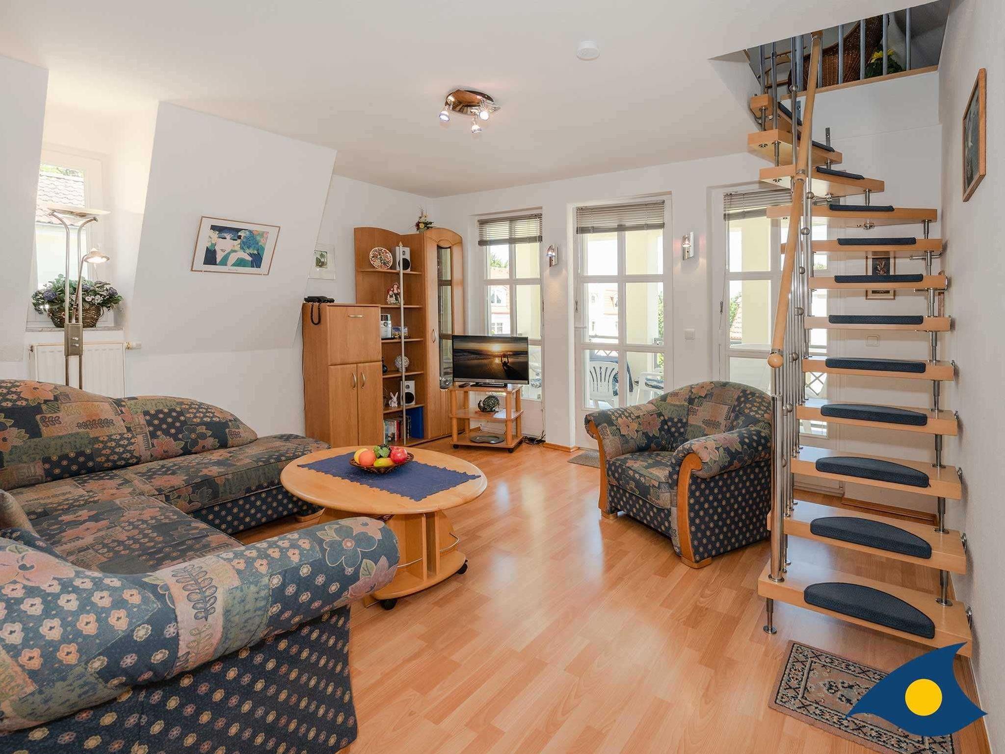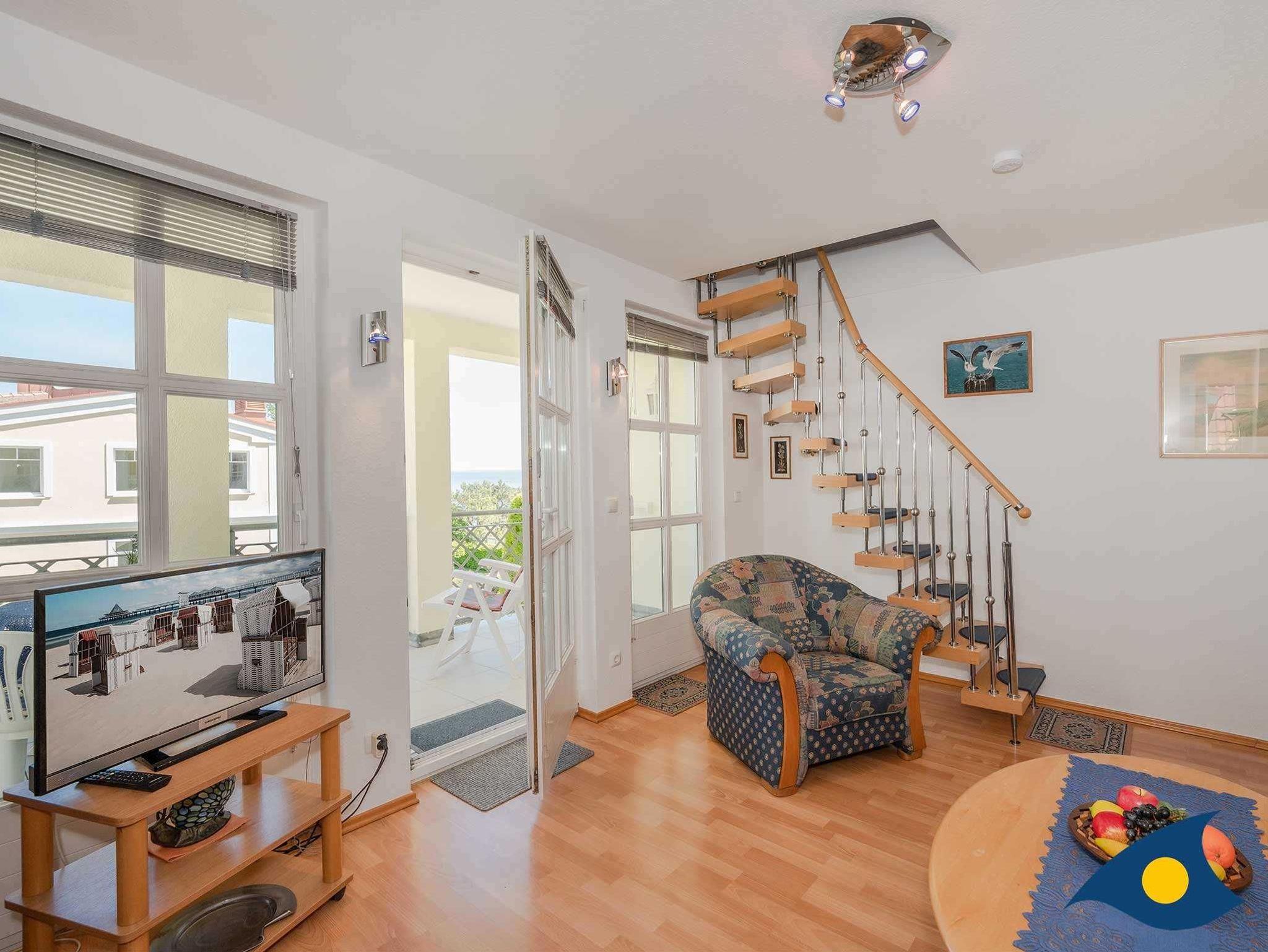 Zu diesem modern und liebevoll eingerichteten Zweiraumappartement gehört ein Balkon, der reizvolle Ausblicke auf das Meer und die nahe Seebrücke bietet. Genießen Sie die fantastische Rundumsicht auf Meer, Strand und Promenade. Im Schlafzimmer, welches sich in der oberen Etage der Maisonettewohnung befindet, steht ein gemütliches Doppelbett zur Verfügung. In das offene Turmzimmer gelangen Sie über eine Treppe. Im Wohnzimmer finden Sie die Schlafcouch für die dritte Person. Außerdem bietet die Wohnung eine separate Küche. Haustiere sind willkommen.