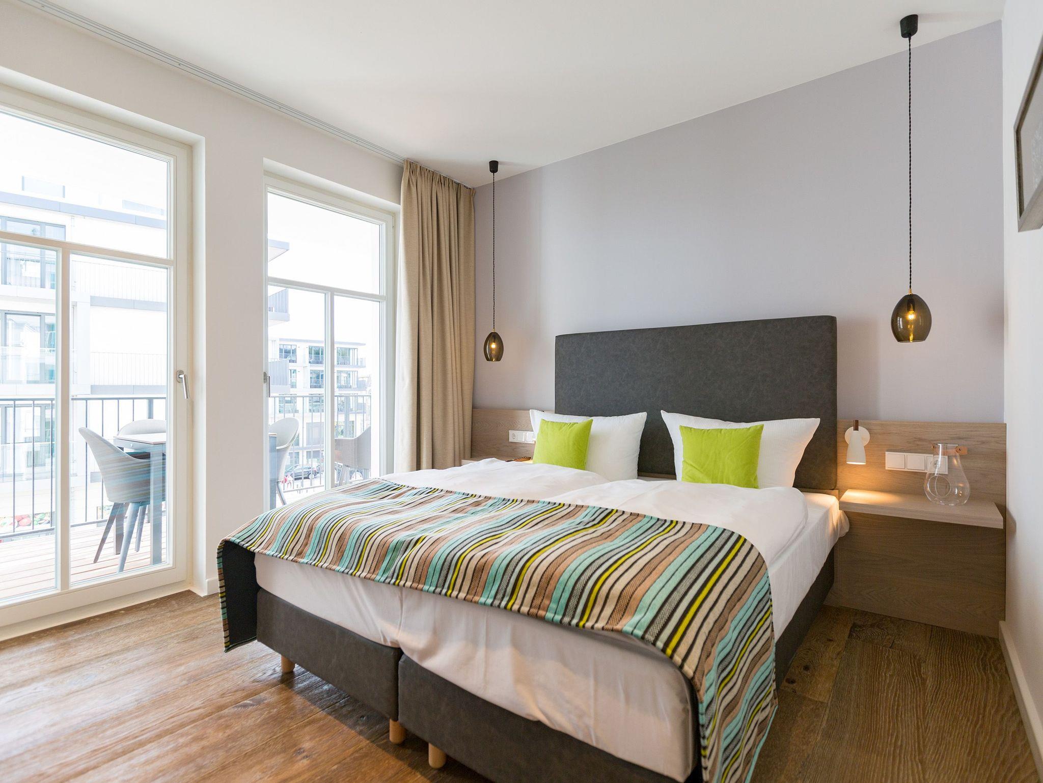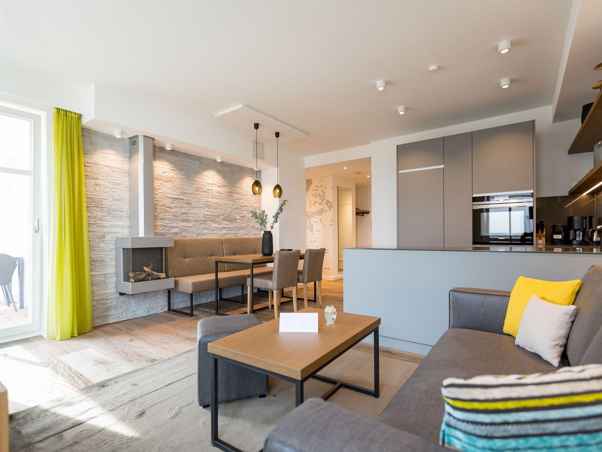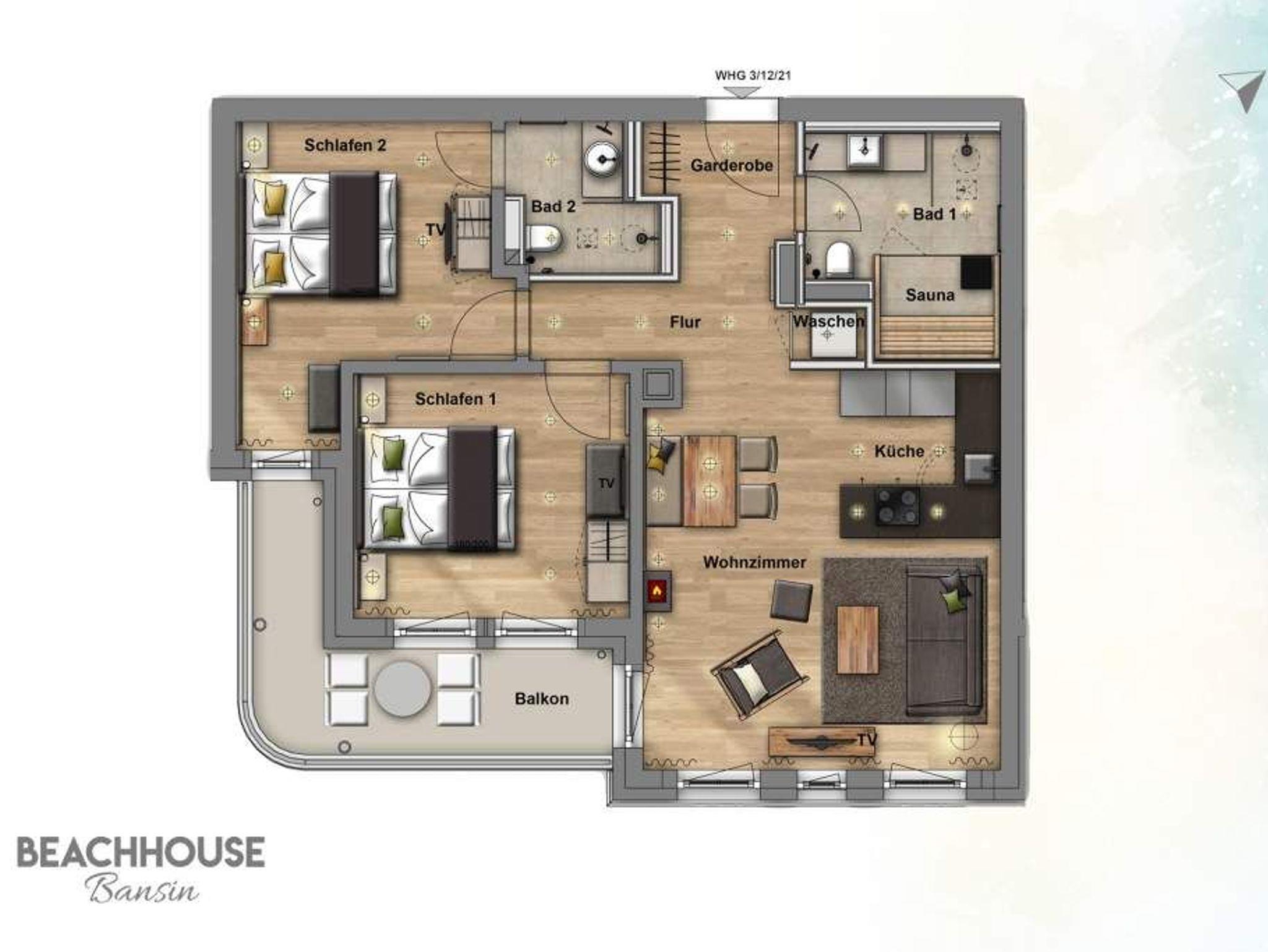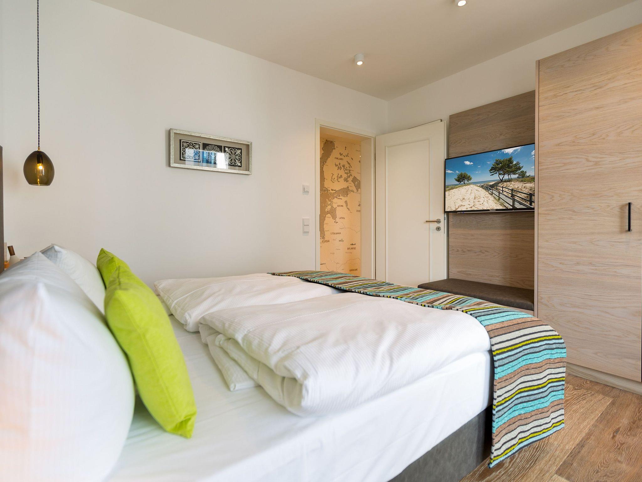 Entspannung ist ein Ort ? In diesem großzügigen und wunderschönen Drei-Zimmer-Appartement im 2. Obergeschoss erwartet Sie und Ihre Familie oder Freunde eine wunderbar entspannende Ostsee-Auszeit in exklusivem Rahmen. Genießen Sie Ihre Zeit mit bis zu vier Personen. Ein Kleinkind (bis drei Jahre im Kinderreisebett) hat auch noch Platz in den 66 Quadratmetern dieses Urlaubsparadieses. Ein helles und elegantes Wohn-Esszimmer wird zum Mittelpunkt. Frische Farben und Naturmaterialien verleihen Ihrem Domizil eine wohnliche Wohlfühlatmosphäre. Die gemütliche Sofa-Sitzgruppe vor dem Gas-Kamin mit Blick auf den großen Flat-TV ist ideal zum Entspannen und eignet sich bestens zum Zusammensitzen. Genauso wie der schöne große Esstisch, an dem alle Platz haben für gemeinsame Essen oder Plauderstunden. Das Essen zubereiten, können Sie in der zum Wohnzimmer hin offenen und voll ausgestatteten Küche. Hochwertige Markengeräte und edles Geschirr machen das Kochen oder Zubereiten feiner Speisen zu einem vergnüglichen Genuss. Ob Herd, Backofen, Kühlschrank oder Kaffeemaschine ? hier fehlt es an nichts. Vom Wohnzimmer aus, aber auch von beiden Schlafzimmern aus, haben Sie einen Zugang zum Süd-Ost-Balkon (9 Quadratmeter). Bei schönem Wetter können Sie von hier aus die Aussicht auf die Ostsee genießen. Die beiden Schlafzimmer verströmen viel Gemütlichkeit. Jeweils ein bequemes Boxspringdoppelbett (1,60 m x 2,00 m), ein großer Schrank und ein Flat-TV gehören zur Ausstattung. Zu einem echten Wellness-Paradies wird die Wohnung durch die eigene Finnische Sauna im Masterbad. Kommen Sie ordentlich ins Schwitzen, wenn Sie Ihnen einheizt. Die beiden Bäder verfügen ansonsten jeweils über eine Regendusche, einen Waschtisch und ein WC. Für eine rundum schöne Auszeit liegen Handtücher für Sie bereit und die Betten sind auch schon bezogen. In einem kleinen Hauswirtschaftsraum steht ein Wasch-Trockner zu Ihrer Verfügung. Das WLAN ist kostenfrei. In der modernen Tiefgarage ist für Sie der Stellplatz Nr. 12 im Doppelparker unten (max. Höhe 1,85 m, max. Länge 5,10 m, max. Breite 2,50 m, max. Last 2.600 kg) reserviert.