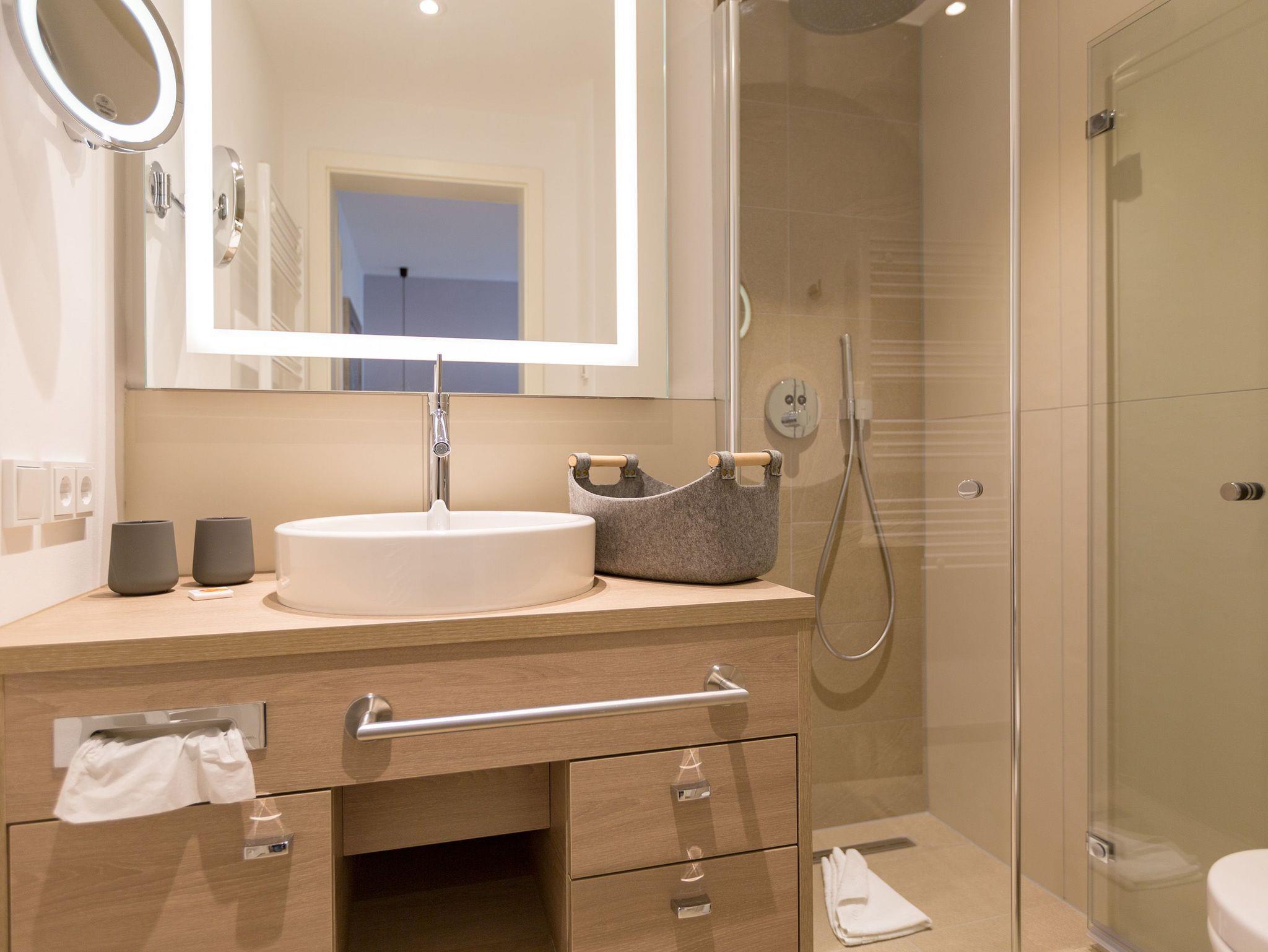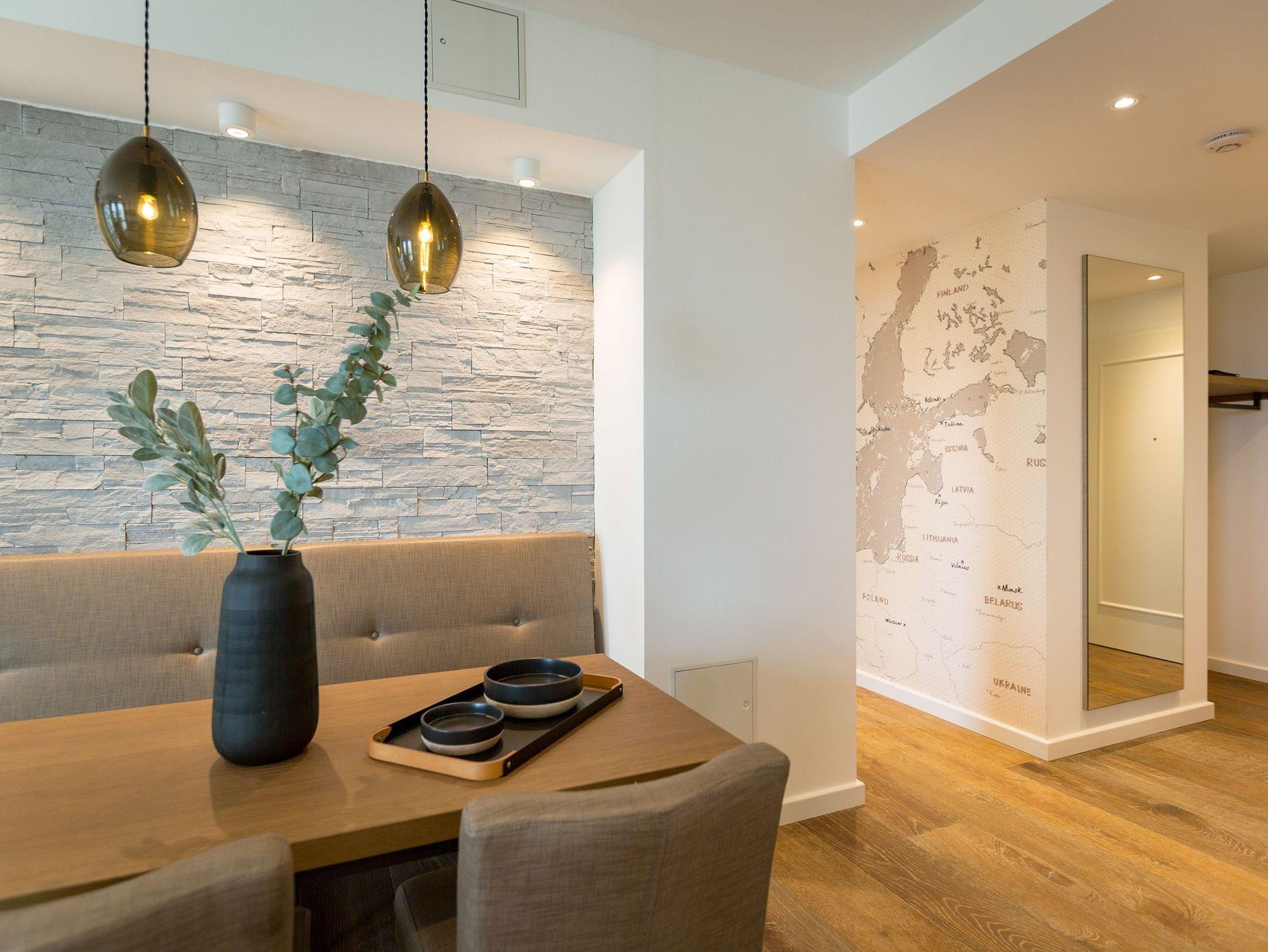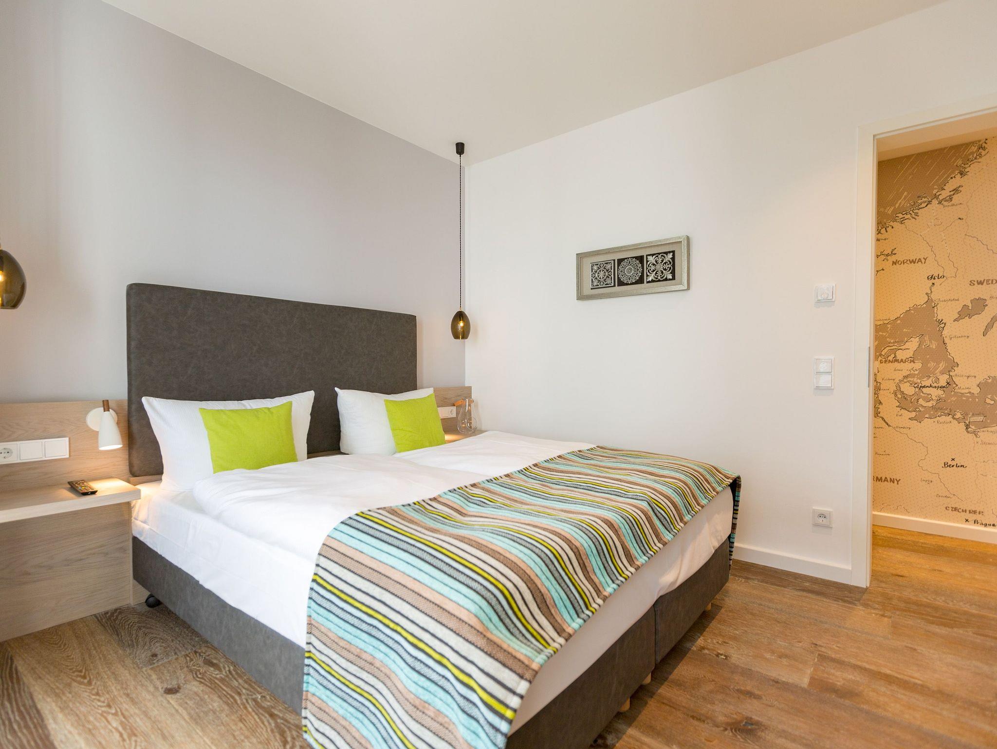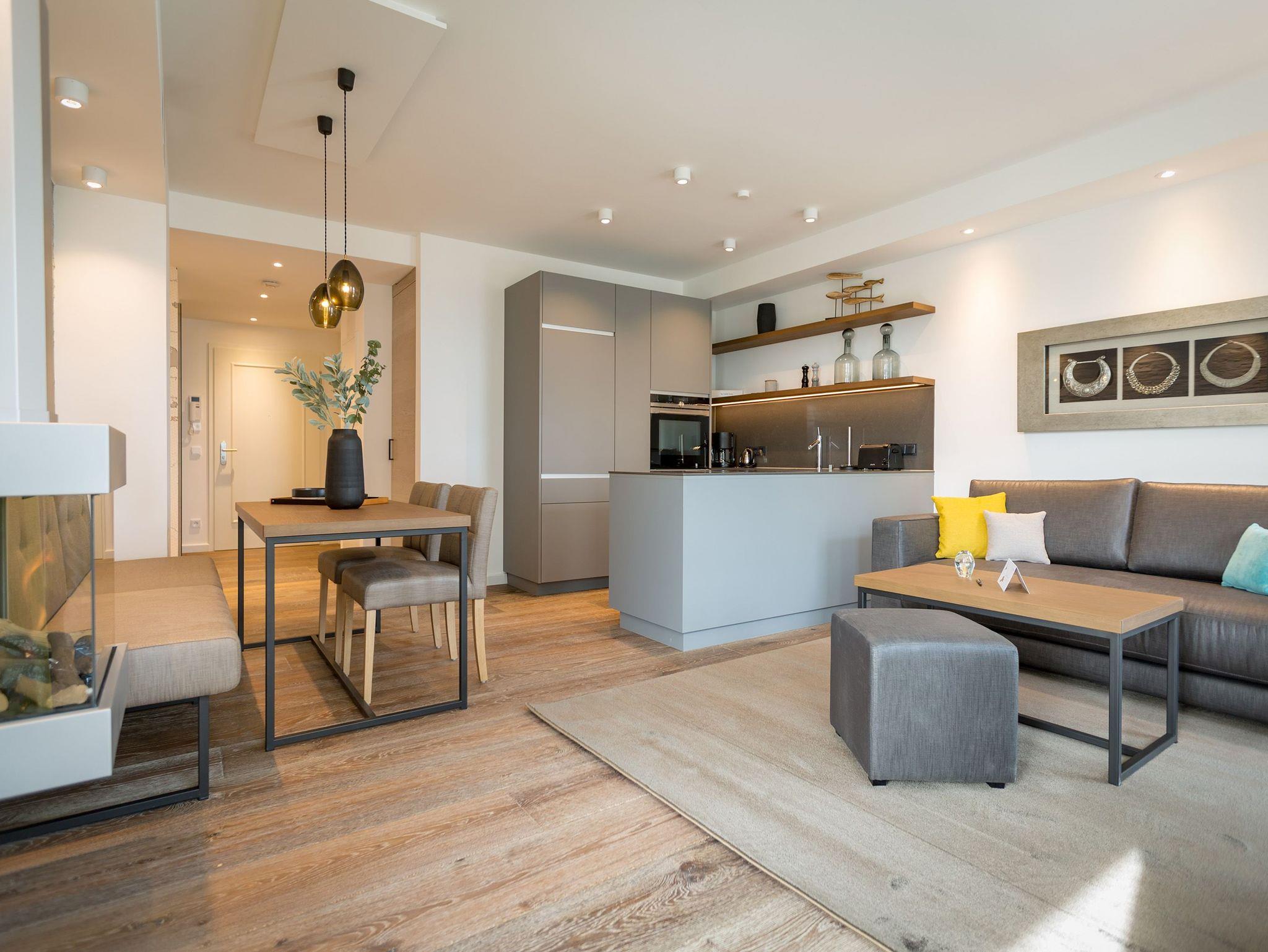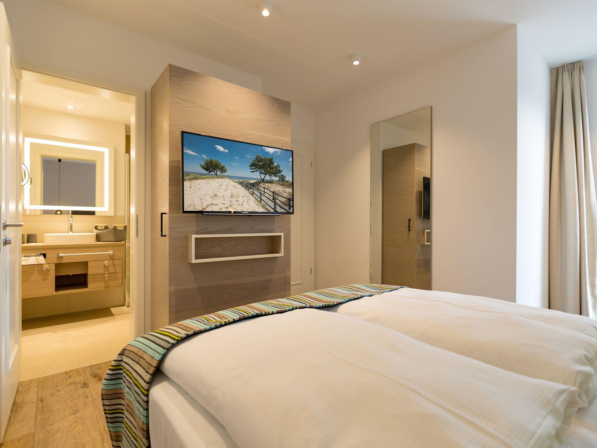 Entspannung ist ein Ort In diesem großzügigen und wunderschönen Drei-Zimmer-Appartement im 2. Obergeschoss erwartet Sie und Ihre Familie oder Freunde eine wunderbar entspannende Ostsee-Auszeit in exklusivem Rahmen. Genießen Sie Ihre Zeit mit bis zu vier Personen. Ein Kleinkind (bis drei Jahre im Kinderreisebett) hat auch noch Platz in den 66 Quadratmetern dieses Urlaubsparadieses. Ein helles und elegantes Wohn-Esszimmer wird zum Mittelpunkt. Frische Farben und Naturmaterialien verleihen Ihrem Domizil eine wohnliche Wohlfühlatmosphäre. Die gemütliche Sofa-Sitzgruppe vor dem Gas-Kamin mit Blick auf den großen Flat-TV ist ideal zum Entspannen und eignet sich bestens zum Zusammensitzen. Genauso wie der schöne große Esstisch, an dem alle Platz haben für gemeinsame Essen oder Plauderstunden. Das Essen zubereiten, können Sie in der zum Wohnzimmer hin offenen und voll ausgestatteten Küche. Hochwertige Markengeräte und edles Geschirr machen das Kochen oder Zubereiten feiner Speisen zu einem vergnüglichen Genuss. Ob Herd, Backofen, Kühlschrank oder Kaffeemaschine hier fehlt es an nichts. Vom Wohnzimmer aus, aber auch von beiden Schlafzimmern aus, haben Sie einen Zugang zum Süd-Ost-Balkon (9 Quadratmeter). Bei schönem Wetter können Sie von hier aus die Aussicht auf die Ostsee genießen. Die beiden Schlafzimmer verströmen viel Gemütlichkeit. Jeweils ein bequemes Boxspringdoppelbett (1,60 m x 2,00 m), ein großer Schrank und ein Flat-TV gehören zur Ausstattung. Zu einem echten Wellness-Paradies wird die Wohnung durch die eigene Finnische Sauna im Masterbad. Kommen Sie ordentlich ins Schwitzen, wenn Sie Ihnen einheizt. Die beiden Bäder verfügen ansonsten jeweils über eine Regendusche, einen Waschtisch und ein WC. Für eine rundum schöne Auszeit liegen Handtücher für Sie bereit und die Betten sind auch schon bezogen. In einem kleinen Hauswirtschaftsraum steht ein Wasch-Trockner zu Ihrer Verfügung. Das WLAN ist kostenfrei. In der modernen Tiefgarage ist für Sie der Stellplatz Nr. 12 im Doppelparker unten (max. Höhe 1,85 m, max. Länge 5,10 m, max. Breite 2,50 m, max. Last 2.600 kg) reserviert.