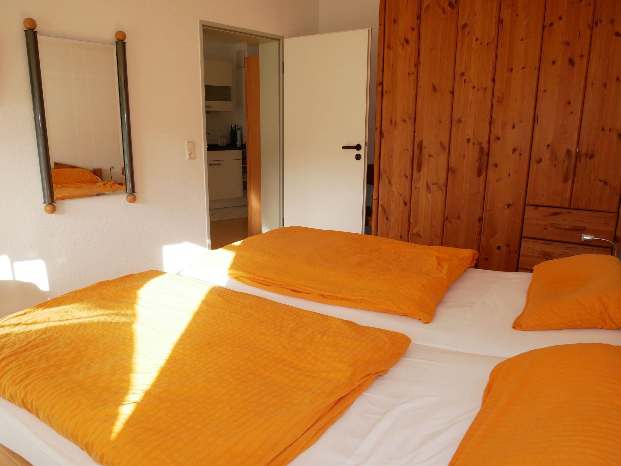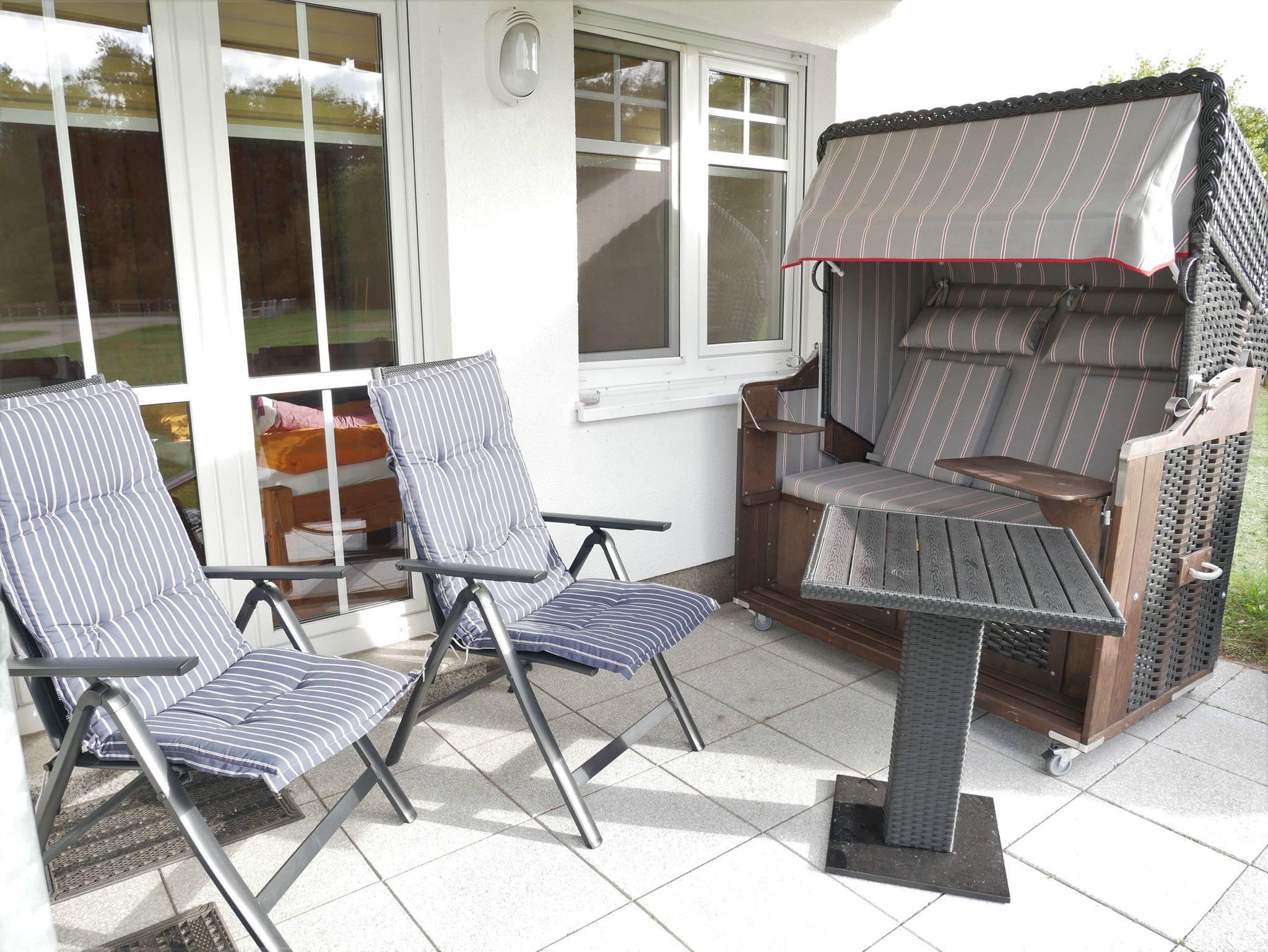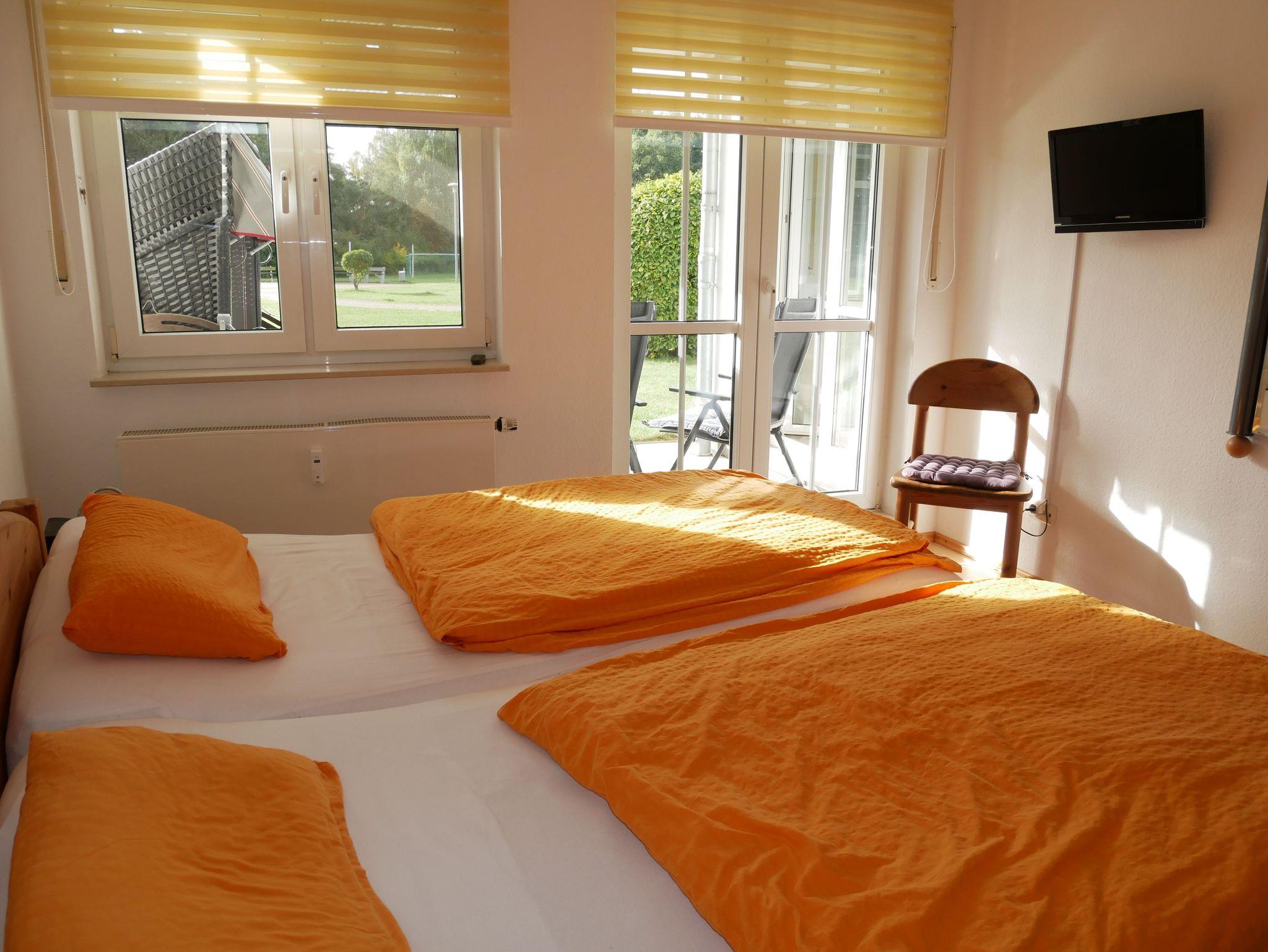 Der großzügige Wohn- Küchenbereich ist mit einer Couch, TV- Flachbild, DVD-Player, Radio, Esstisch und einer voll ausgestatteten Küchenzeile mit Spülmaschine, Induktionsherd, Kühlschrank mit Gefriermöglichkeit, Backofen mit integrierter Mikrowelle, Kaffeemaschine, Wasserkocher und Toaster ausgestattet. Vom Wohnzimmer sowie vom Schlafzimmer aus gelangen Sie auf die möblierte Terrasse zur Südseite. Das Schlafzimmer verfügt über ein Doppelbett und einen Kleiderschrank für Ihre Urlaubsgarderobe. Das Badezimmer ist mit Dusche, WC und Waschtisch ausgestattet.