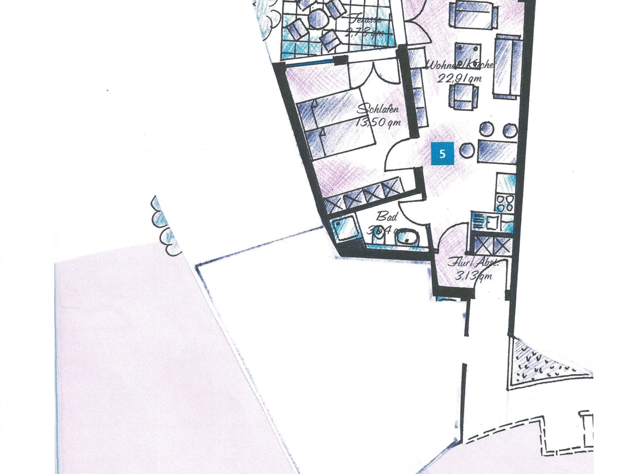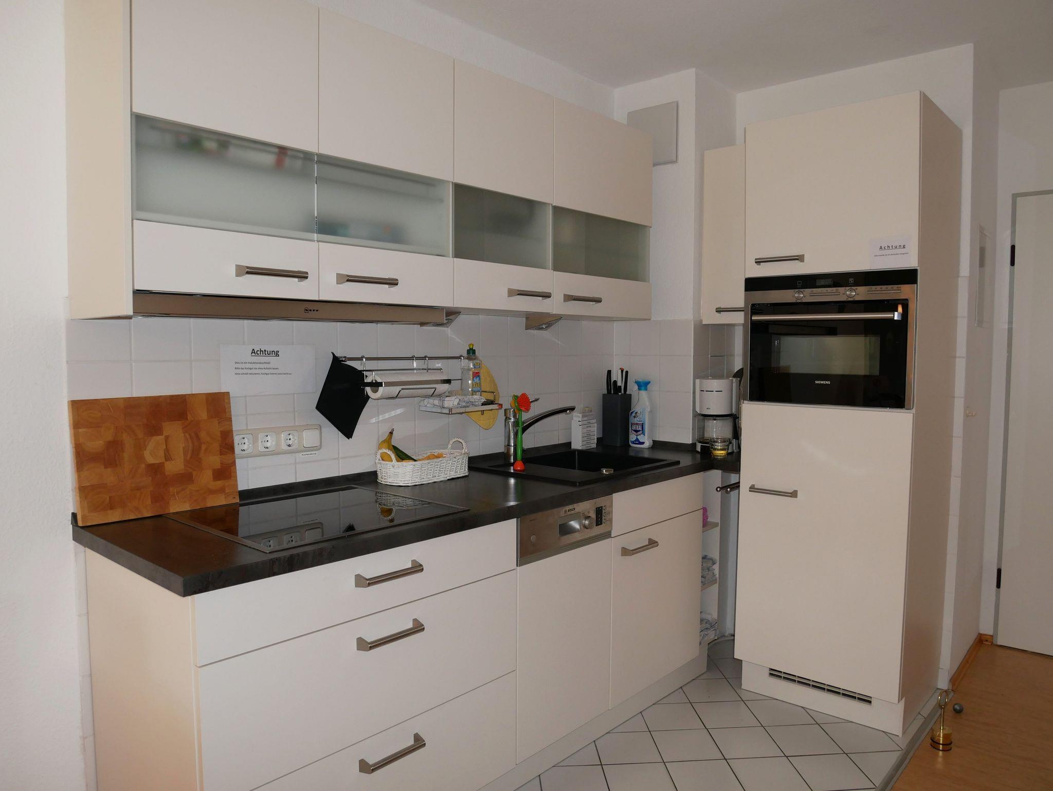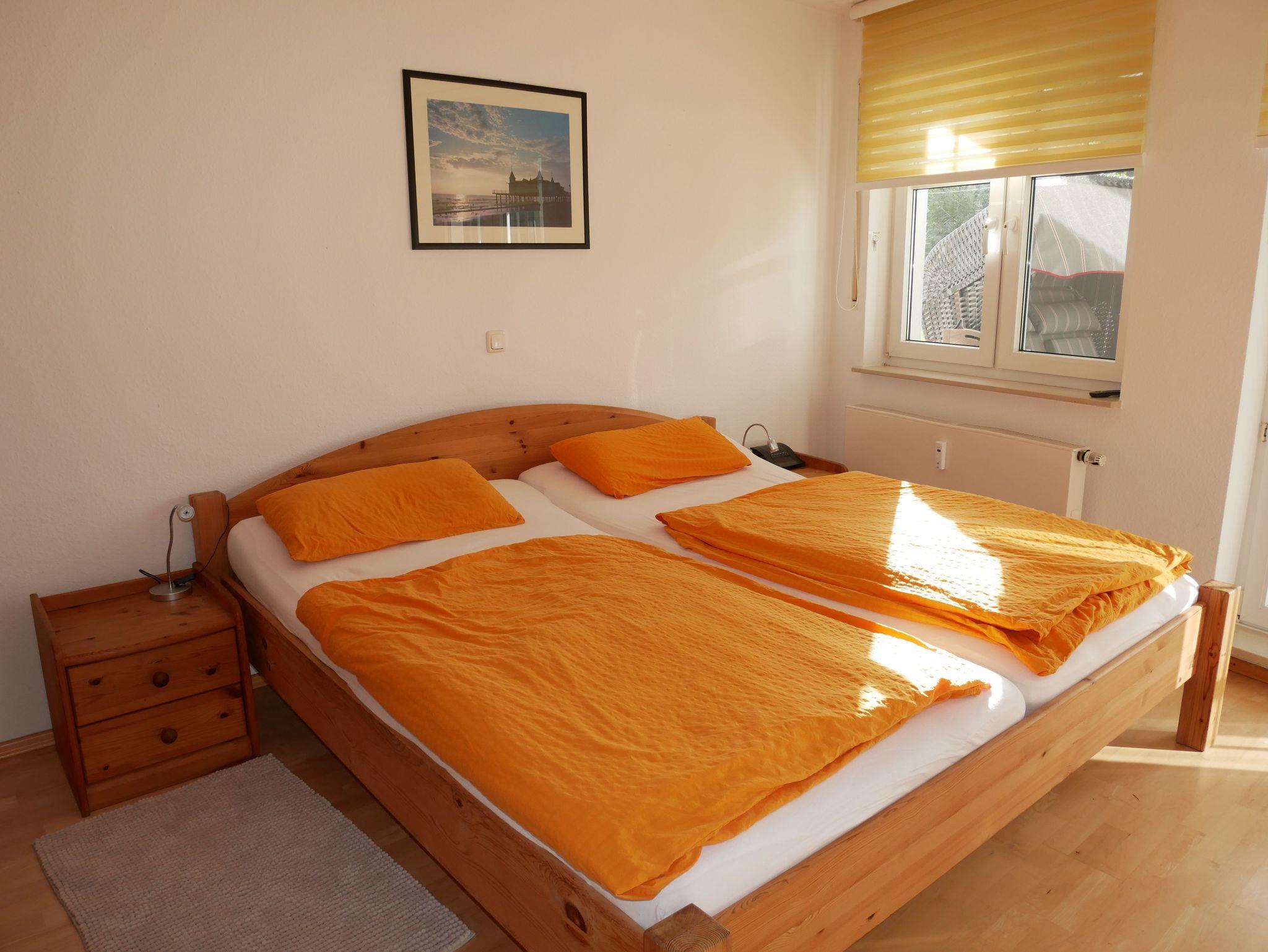 Der großzügige Wohn- Küchenbereich ist mit einer Couch, TV- Flachbild, DVD-Player, Radio, Esstisch und einer voll ausgestatteten Küchenzeile mit Spülmaschine, Induktionsherd, Kühlschrank mit Gefriermöglichkeit, Backofen mit integrierter Mikrowelle, Kaffeemaschine, Wasserkocher und Toaster ausgestattet. Vom Wohnzimmer sowie vom Schlafzimmer aus gelangen Sie auf die möblierte Terrasse zur Südseite. Das Schlafzimmer verfügt über ein Doppelbett und einen Kleiderschrank für Ihre Urlaubsgarderobe. Das Badezimmer ist mit Dusche, WC und Waschtisch ausgestattet.