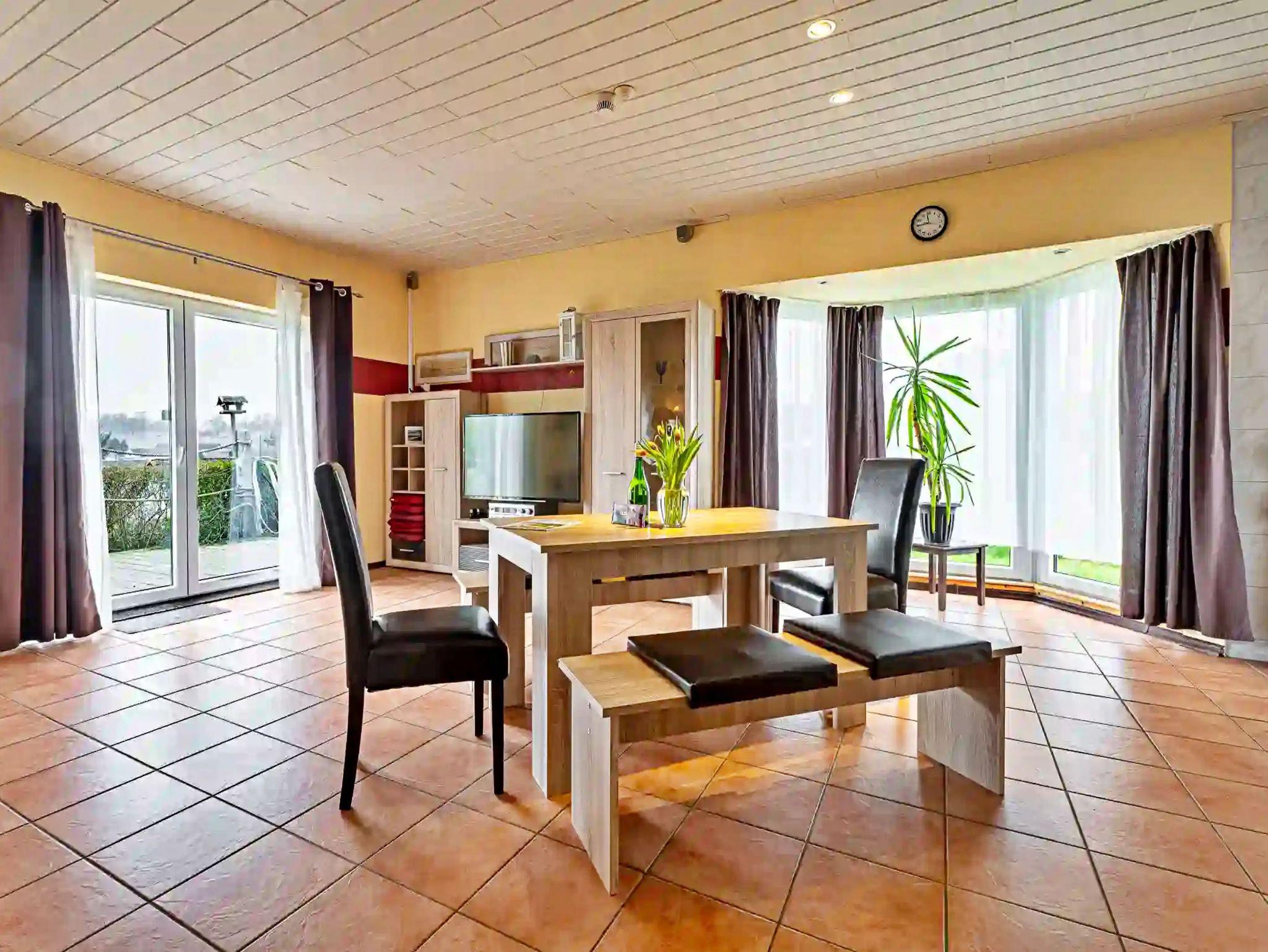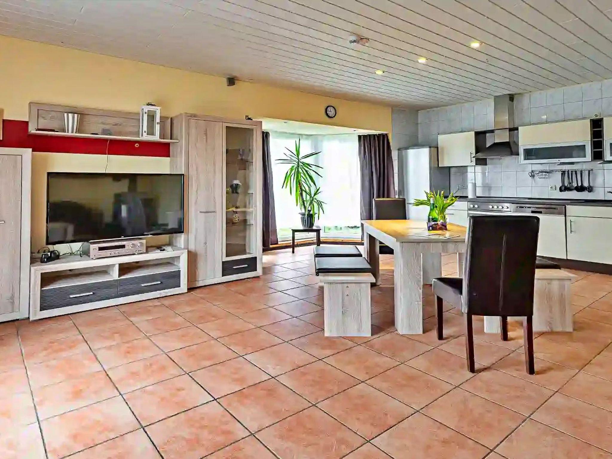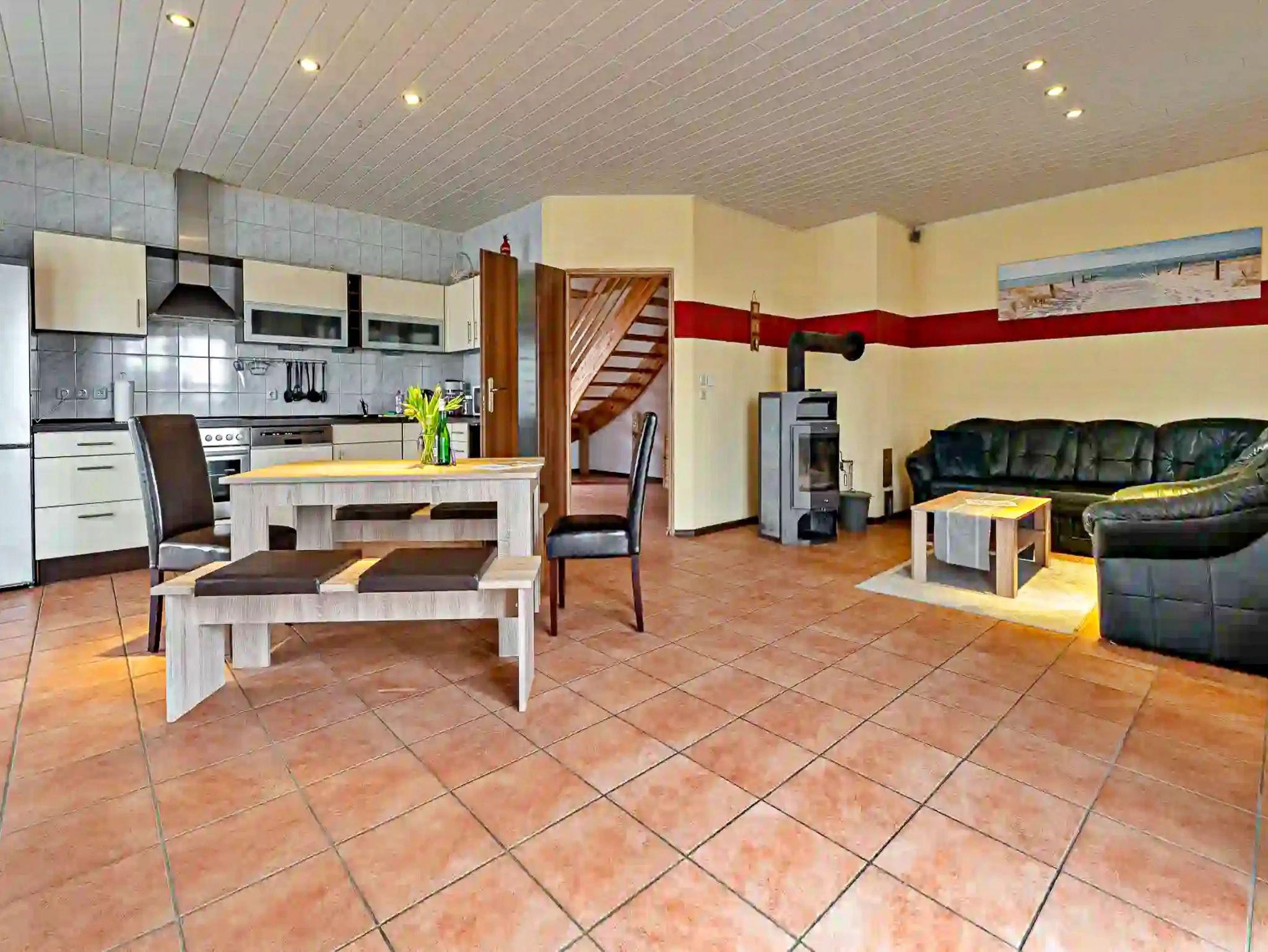 Die 110 qm große Doppelhaushälfte über zwei Etagen verfügt im Erdgeschoss über einen großzügigen Wohnraum mit integrierter Küche sowie Essplatz für 6 Personen. Der Wohn-Essbereich mit seiner komfortablen Wohnlandschaft (Aufbettungsmöglichkeit für eine Person) lädt zum gemeinsamen Verweilen mit der Familie oder Freunden ein. Ein Flachbild-TV sowie ein Kamin bringen auch an kühleren Abenden Gemütlichkeit und Abwechslung in Ihren Urlaub. Die offene Küchenzeile mit einen Ceranherd, Backofen, Kühlschrank mit Tiefkühlfach, Geschirrspülmaschine, Mikrowelle, Kaffeemaschine, Toaster und Wasserkocher lässt beim Zubereiten der Speisen keine Wünsche offen. Im ersten Obergeschoss (Dachschrägen) befinden sich die beiden Schlafzimmer mit jeweils einem Doppelbett und Kleiderschränken mit ausreichend Stauraum. Das Badezimmer ist mit Dusche/WC, Badewanne und Waschmaschine ausgestattet. Ein zusätzliches Gäste-WC sowie als Highlight eine Sauna stehen Ihnen zusätzlich zur Verfügung. Zwei Terrassen direkt am Haus runden den Komfort der Doppelhaushälfte ab. Hier können Sie bei schönstem Wetter schon morgens Ihren Kaffee genießen oder den Abend bei einem Glas Wein ausklingen lassen.
