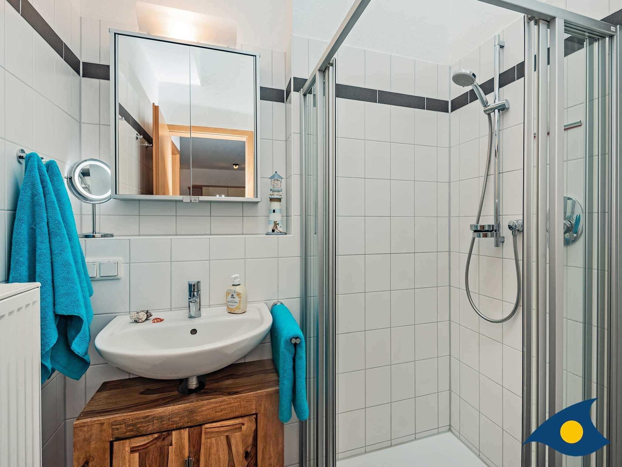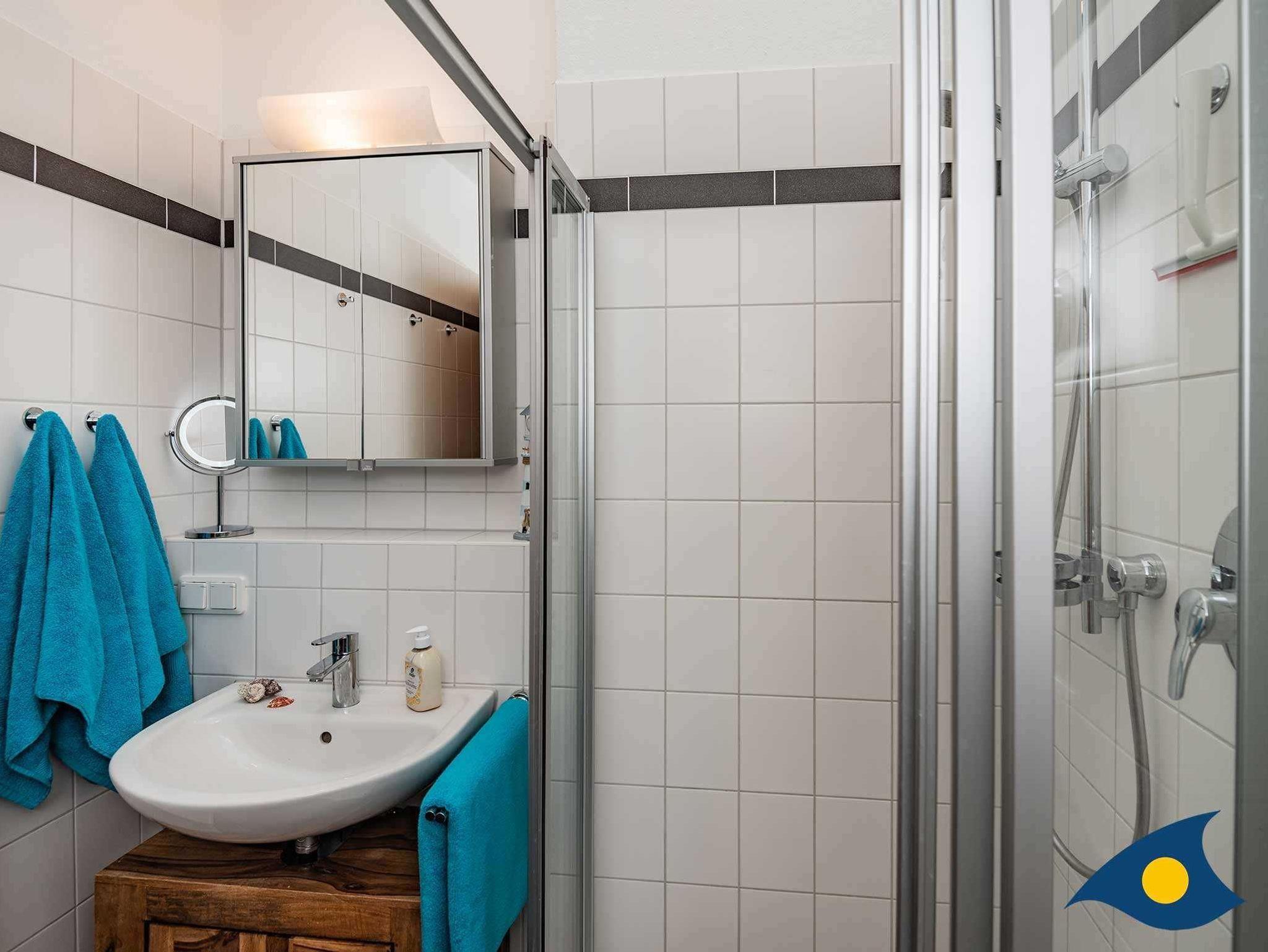 Ein kleines Duschbad mit WC, beleuchtetem Kosmetikspiegel und einem Badradio rundet den Charme dieser Wohnung ab.