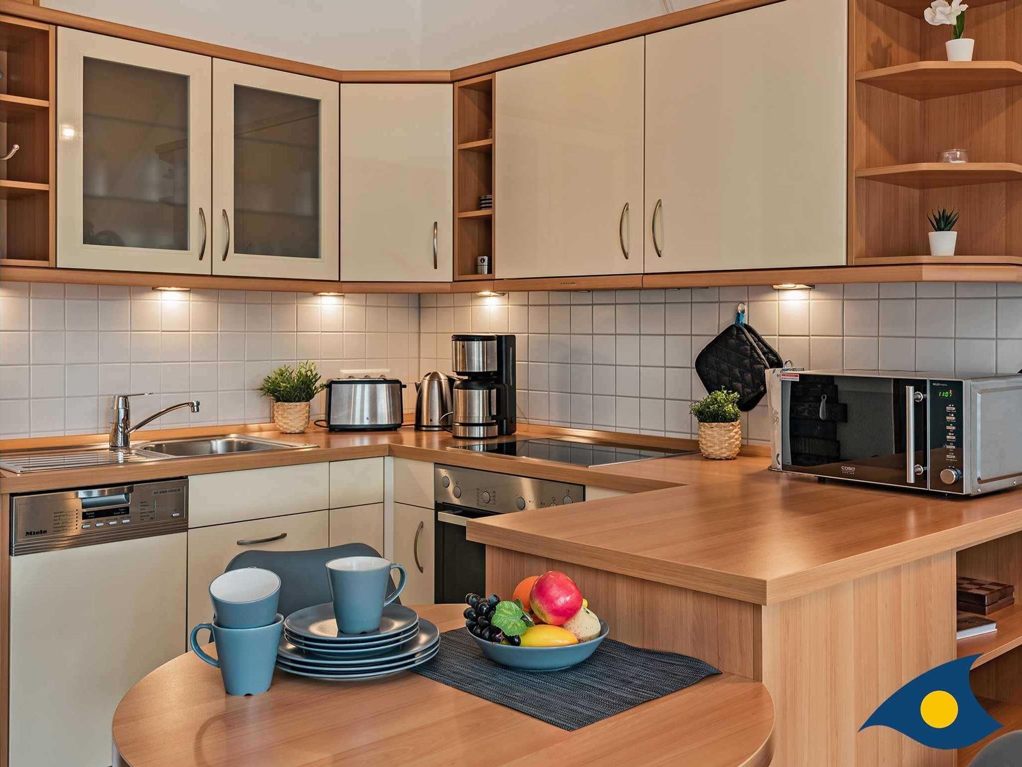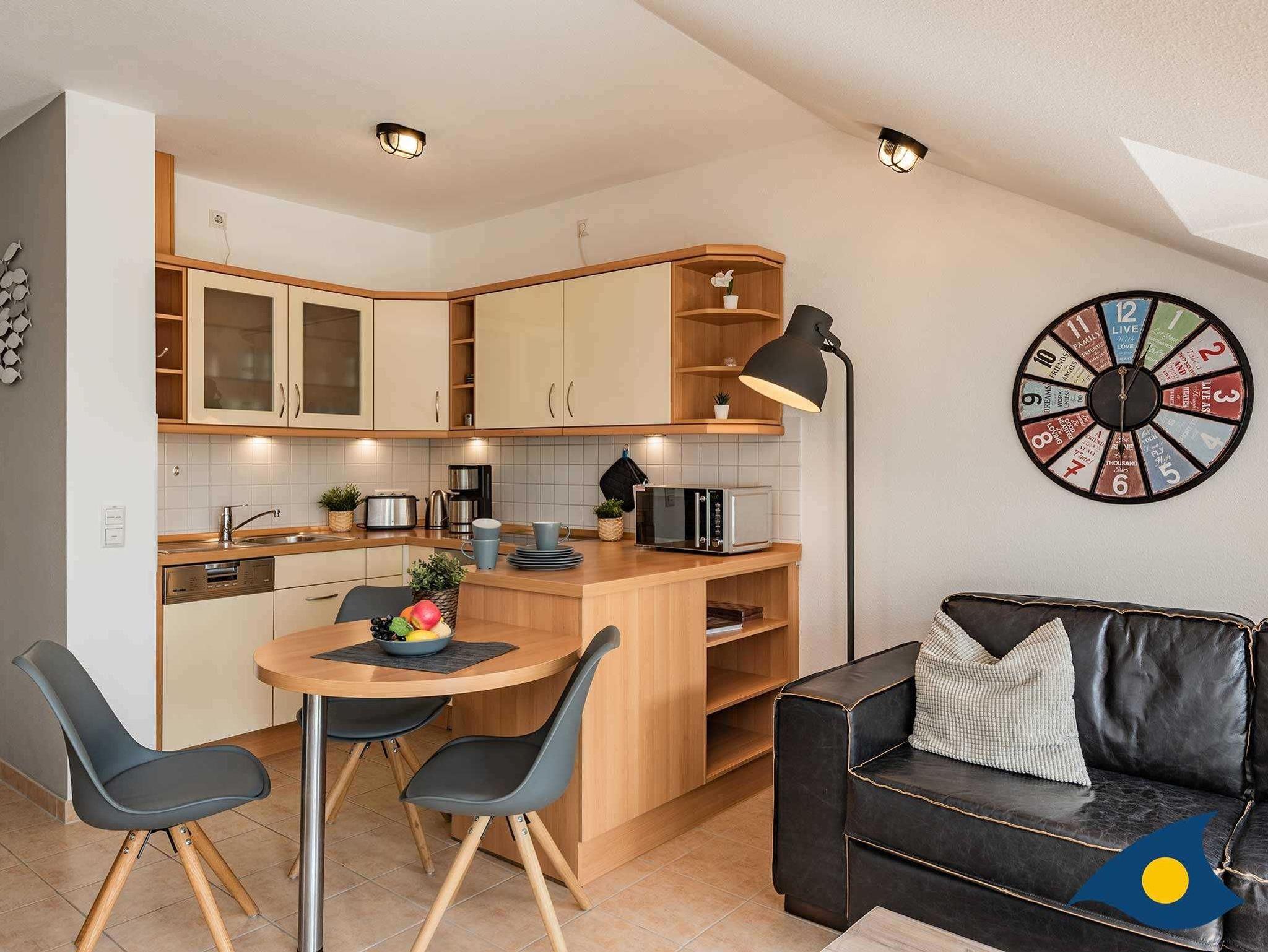 Das gemütliche Wohnzimmer, ausgestattet mit einem großzügigen Einbauschrank inkl. Tresor, verfügt über eine Aufbettungsmöglichkeit auf der Schlafcouch (1,60m x 2,00m) für eine 3. Person und bietet einen direkten Zugang zum sonnigen Balkon mit einem Elektrogrill, auf dem Sie das abendliche Glas Wein oder ein ausgiebiges Frühstück am Morgen genießen können. Ein Elektrokamin verspricht ebenfalls ein gemütliches Ambiente am Abend. Für Film- und Sportfans bietet das Smart - TV den entsprechenden Unterhaltungsfaktor. Zur Stromversorgung von Ihren Smart-Geräten wurden alle Steckdosen mit integrierten USB-Schnittstellen ausgestattet. Die unmittelbar angrenzende, offene und vollumfänglich ausgestattete moderne Küche lädt zum gemeinsamen Kochen ein. Eine Tassimo-Kaffeemaschine serviert den morgendlichen Kaffee oder diesen spontan am Nachmittag.