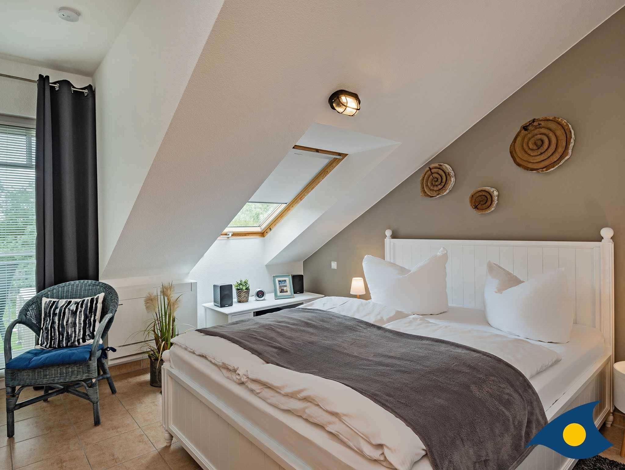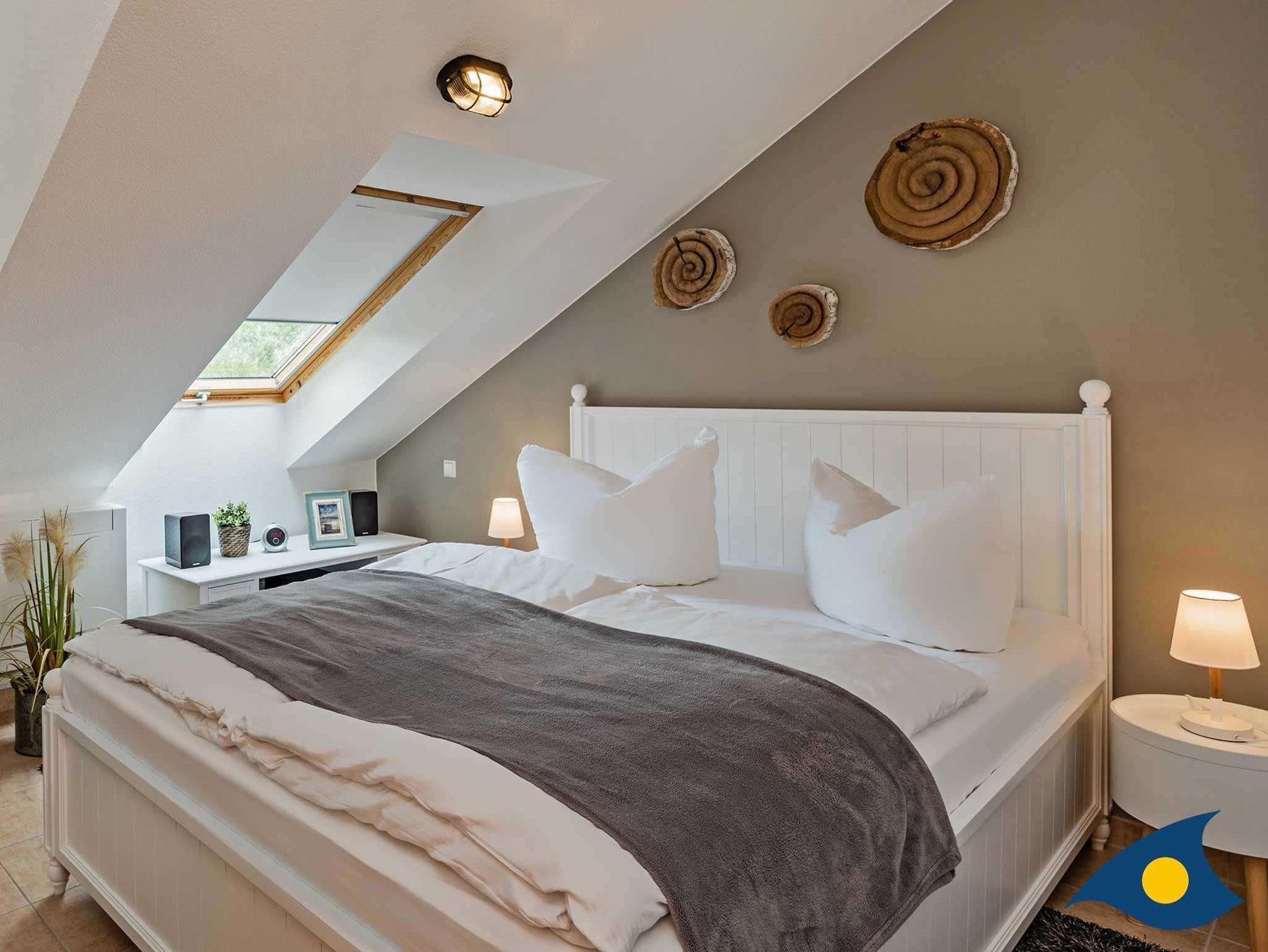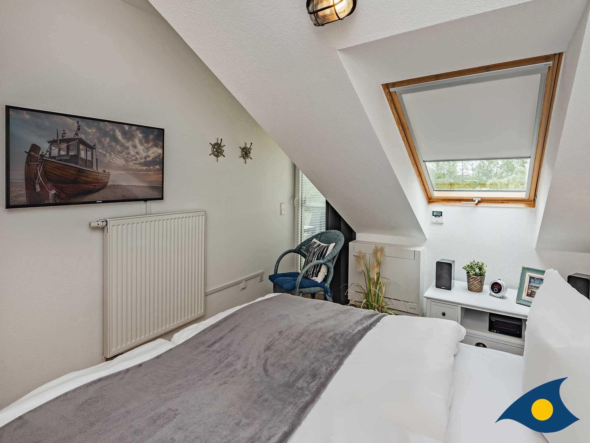 Das Schlafzimmer verfügt über ein bequemes Doppelbett (1,60m x 2,10m), von dem aus Sie ein spannendes Programm im Smart - TV verfolgen können, und ebenfalls einen Zugang zum Balkon. Durch das Dachfenster in der Schräge genießen Sie die ersten Sonnenstrahlen am Morgen. Das Schlafzimmer verfügt zudem über eine Klimaanlage, welche in warmen Sommernächten für erholsamen Schlaf sorgt.