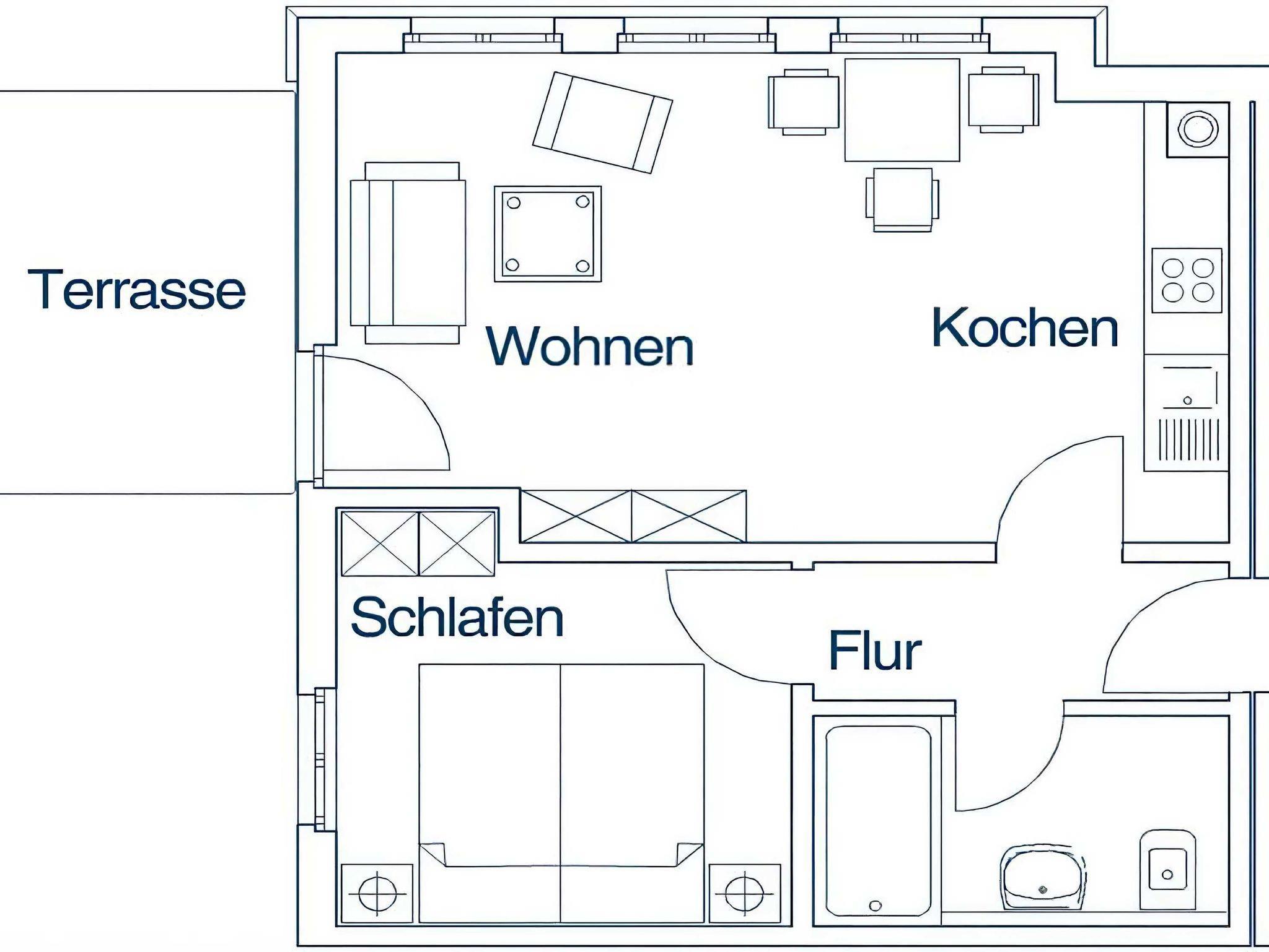 Die offene Wohnküche ist mit einer Mikrowelle, einem Geschirrspüler und allen nötigen Utensilien ausgestattet, um selbst zu kochen. Von der Terrasse aus können Sie den Blick auf die Umgebung genießen. Auch Ihr vierbeiniger Begleiter ist in der Ferienwohnung herzlich willkommen.