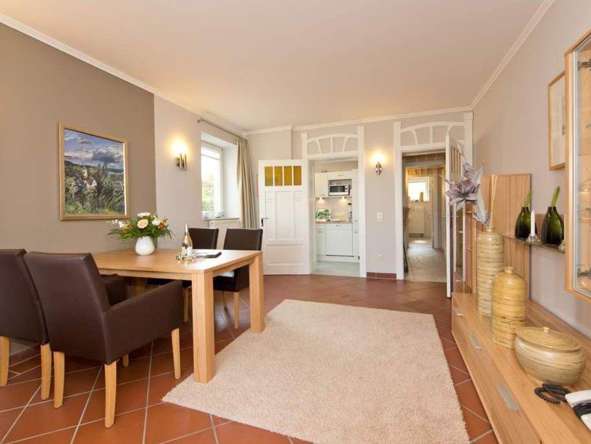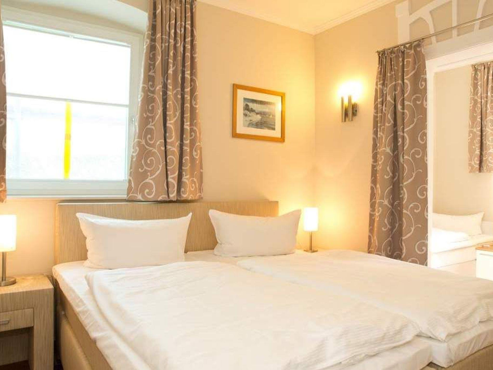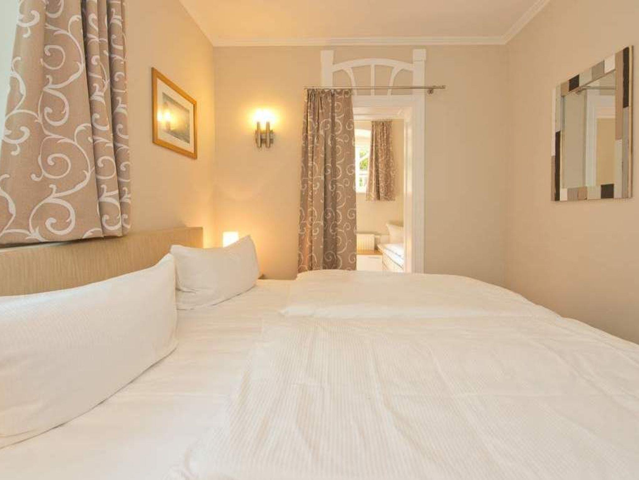 Eine Terrasse mit Strandkorb (ab Pfingsten bis September, je nach Witterung) und Blick auf die Ostsee - die 3-Raum-Ferienwohnung 3 in der Villa befindet sich im Erdgeschoss. Auf großzügigen 70 qm finden Sie hier ein liebevoll arrangiertes Urlaubsdomizil für bis zu 4 Personen. Helle Farben und Stoffe und eine moderne Einrichtung vermitteln ein angenehmes Wohngefühl. Der Wohnbereich ist mit einem Essplatz ausgestattet und geht in eine offene Veranda mit Sitzgruppe und Flat-TV über. Die separate Küche ist komplett ausgestattet. Ergänzt wird die Wohnung durch ein Schlafzimmer mit bequemem Boxspringdoppelbett (1,80 m x 2,00 m). Von hier aus hat man Zugang (mit Sichtschutzvorhang abzutrennen) zum zweiten Schlafbereich mit 2 Einzelbetten (2x 0,80m x 1,80m - ideal für Kinder). Ein großes Bad mit zwei Waschbecken, WC und Dusche ergänzt die Wohnung. Für Ihren Komfort sind die Betten bei der Anreise bezogen und Handtücher liegen bereit. Ein Pkw-Stellplatz steht in einer Garage in der hinteren Bergstraße zur Verfügung.