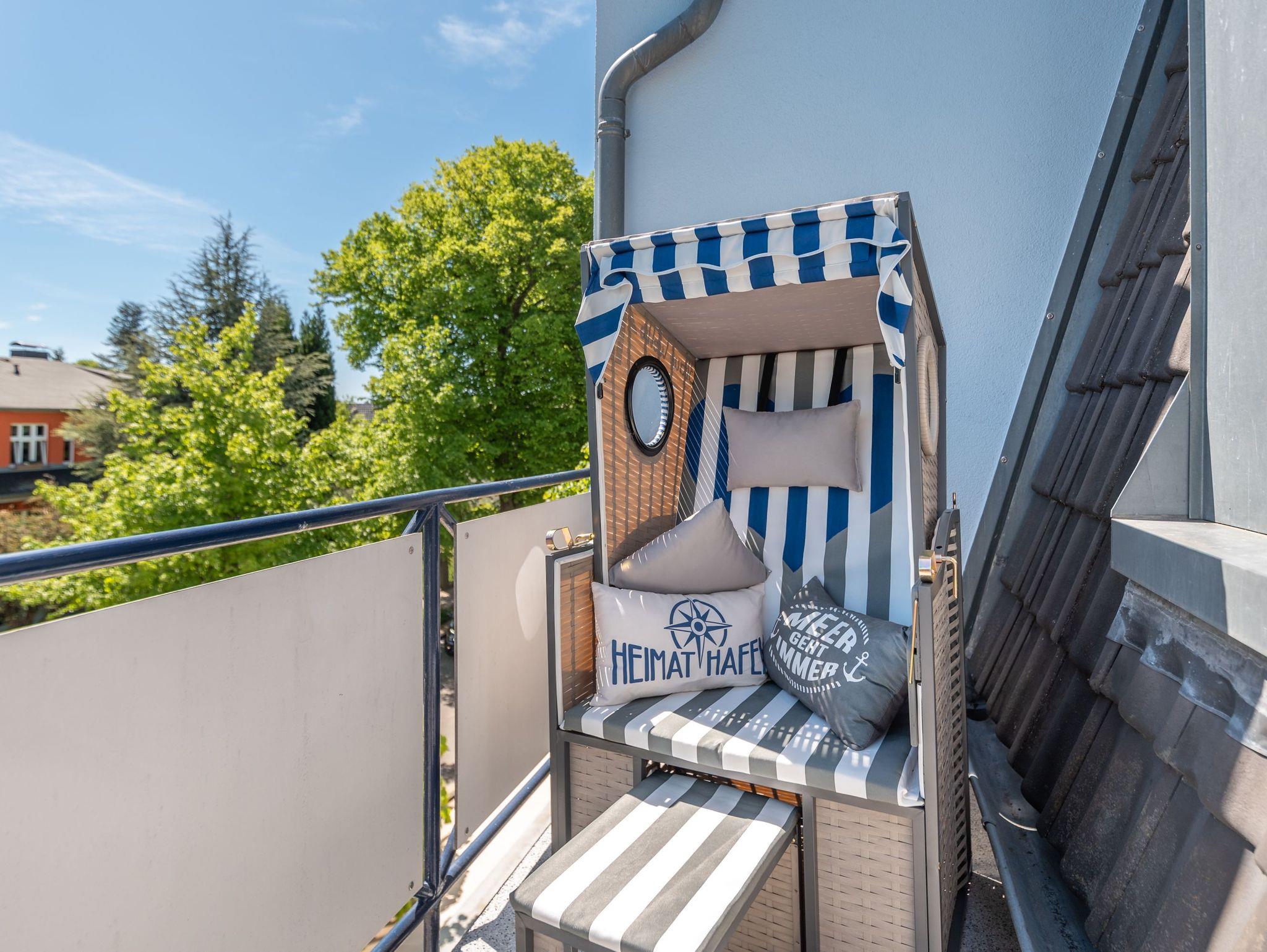 • großer Balkon mit Einsitzer-Strandkorb, Sitzmöbeln und Sonnenschutz