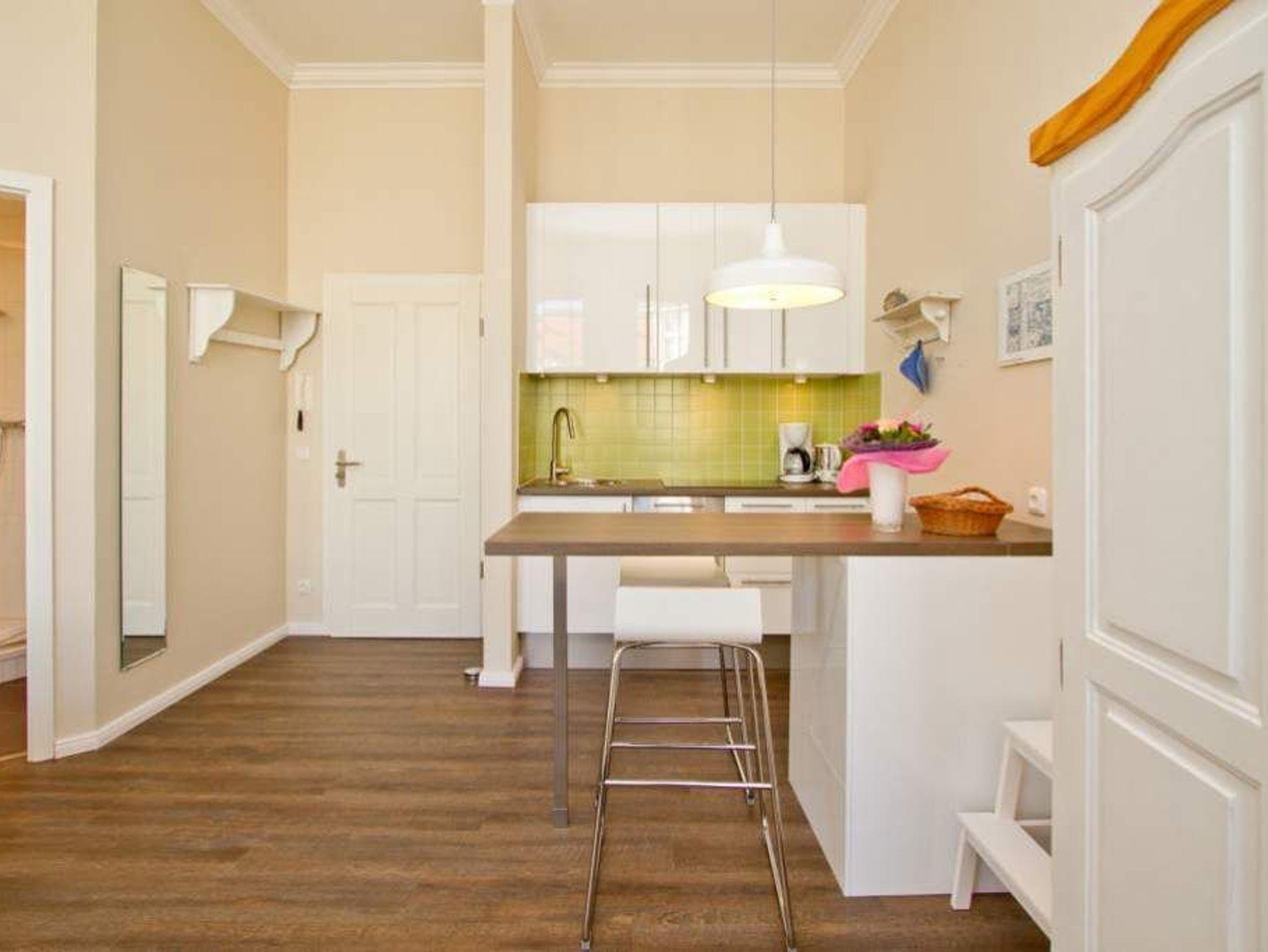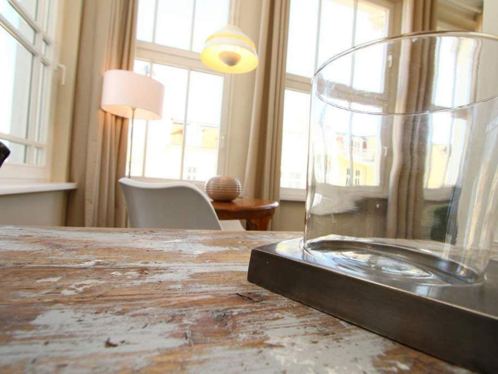 Individueller Charme und persönlicher Stil zeichnen die Wohnung Saphir im 1. Obergeschoss der Villa Anna aus. Das großzügig geschnittene, offen gestaltete Apartment (36 m²) bietet ein stilvolles Zuhause auf Zeit für 2 Personen. Helle Räume, geschmackvolles Interieur und hochwertige Ausstattung schaffen ein entspanntes Urlaubsambiente. Frühstücken können Sie entweder am Bistro-Tresen oder in der kleinen Essecke mit Blick auf die Ostsee. Der LCD-Fernseher lässt sich dank Schwenkarm wahlweise auf den Wohn- oder Schlafbereich ausrichten. Die moderne Küche mit Cerankochfeld, Kühlschrank und Geschirrspüler sowie das Duschbad lassen keine Wünsche offen. Ein Highlight ist die gemütliche Veranda mit breiter Glasfront und Sofa mit Récamiere ? der perfekte Platz für entspannte Stunden mit Panoramaausblick. Für Ihren Komfort sind die Betten bei Anreise bezogen, Handtücher liegen als Erstausstattung bereit. Ein Pkw-Stellplatz befindet sich auf dem Grundstück.