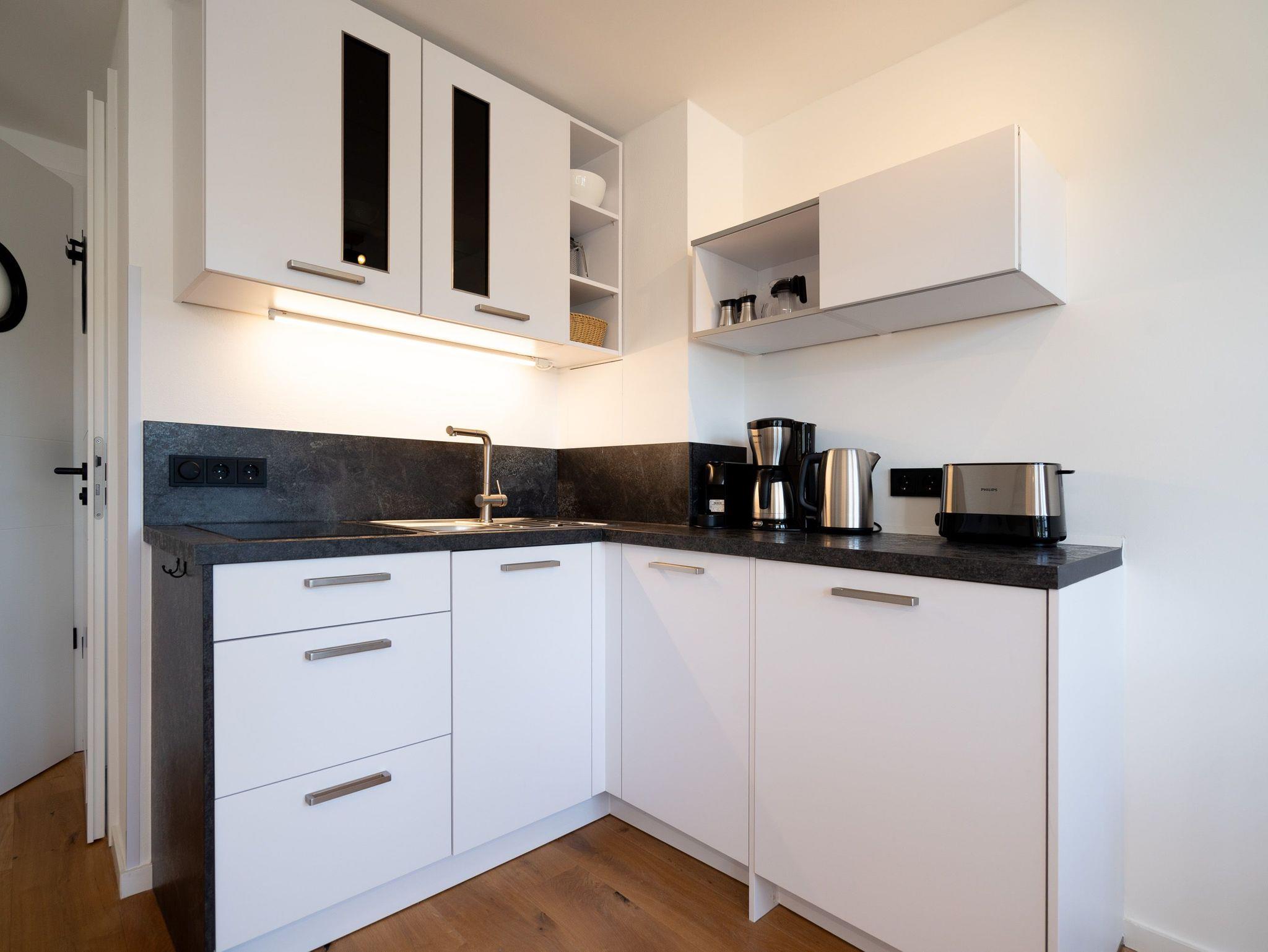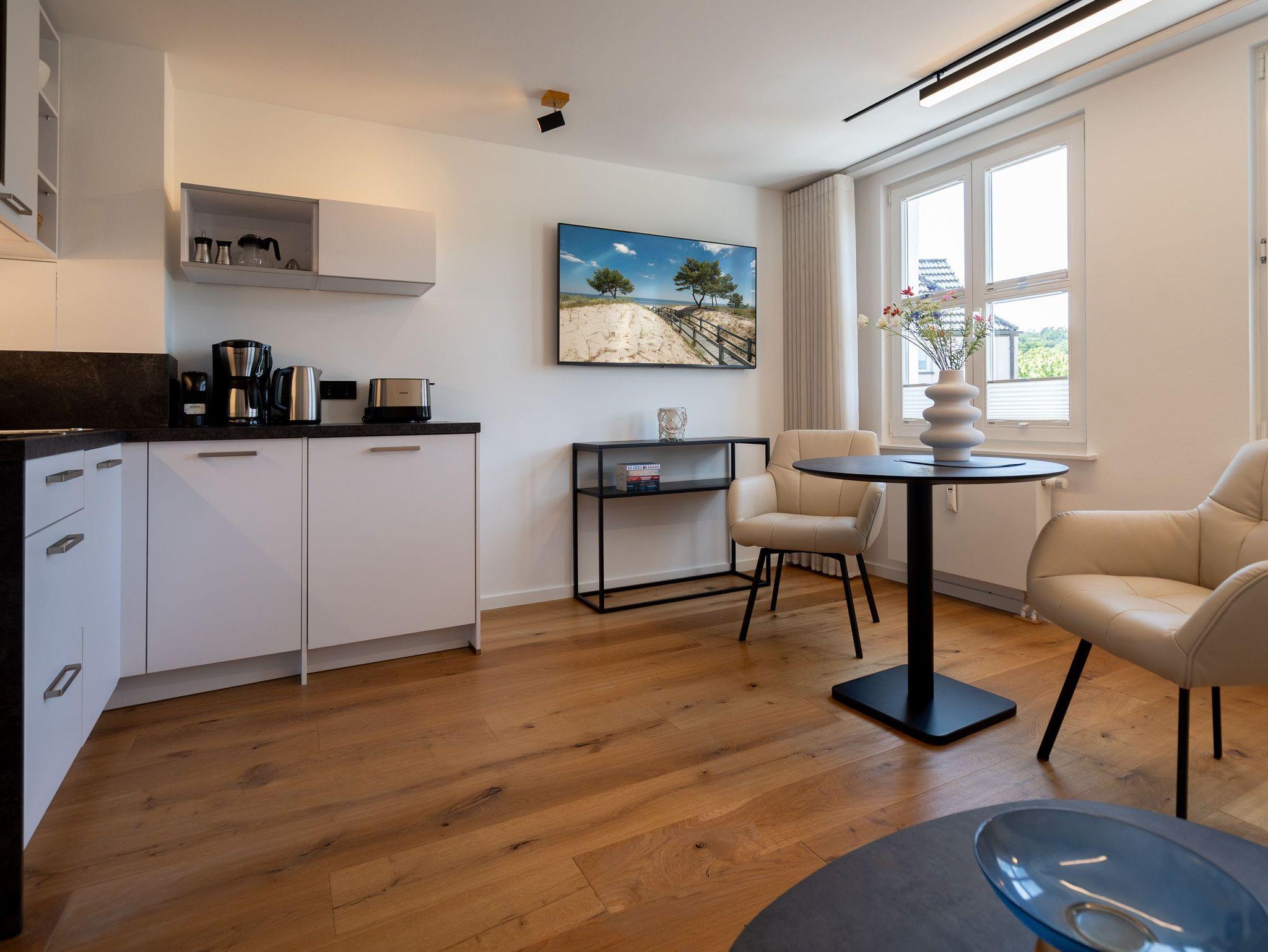 2-Raum-Appartement mit Elektrokamin ? Wohlfühlambiente unterm Dach. Das 2-Raum-Appartement Nr.?9 im Dachgeschoss der Villa Elisabeth bietet auf 32?m² eine stilvolle Rückzugsmöglichkeit für zwei Personen ? mit liebevollen Details, durchdachter Ausstattung und einem Hauch Gemütlichkeit, der schon beim Reinkommen spürbar wird. Im offenen, hellen Wohnbereich finden Sie eine moderne Küchenecke mit 4-Platten-Cerankochfeld, Spülmaschine, Kühlschrank mit Gefrierfach und Nespresso-Kapselmaschine ? ideal für den selbstgemachten Urlaubskaffee oder das kleine Abendessen zu zweit. Der Essplatz bietet Raum für gemeinsame Mahlzeiten, während Sofa, 55-Zoll-Flat-TV und ein stimmungsvoller Elektrokamin mit Fernbedienung für entspannte Abende sorgen ? ganz ohne Holz, Rauch oder Aufwand. Im separaten Schlafzimmer sorgt ein bequemes Boxspringbett (1,60?m x 1,95?m) für erholsamen Schlaf. Der Kleiderschrank bietet ausreichend Platz für Ihre Garderobe. Das Tageslicht-Bad ist mit einer Dusche (0,85m x 0,70m), Waschtisch und WC ausgestattet ? kompakt, hell und funktional. Ihr Fahrzeug parkt wettergeschützt unter dem Carport auf dem Hof ? Stellplatz Nr.?9 gehört exklusiv zu Ihrer Wohnung. WLAN steht selbstverständlich kostenfrei zur Verfügung. Ein gemütlicher Rückzugsort mit besonderem Charme ? perfekt für erholsame Tage an der Ostsee.