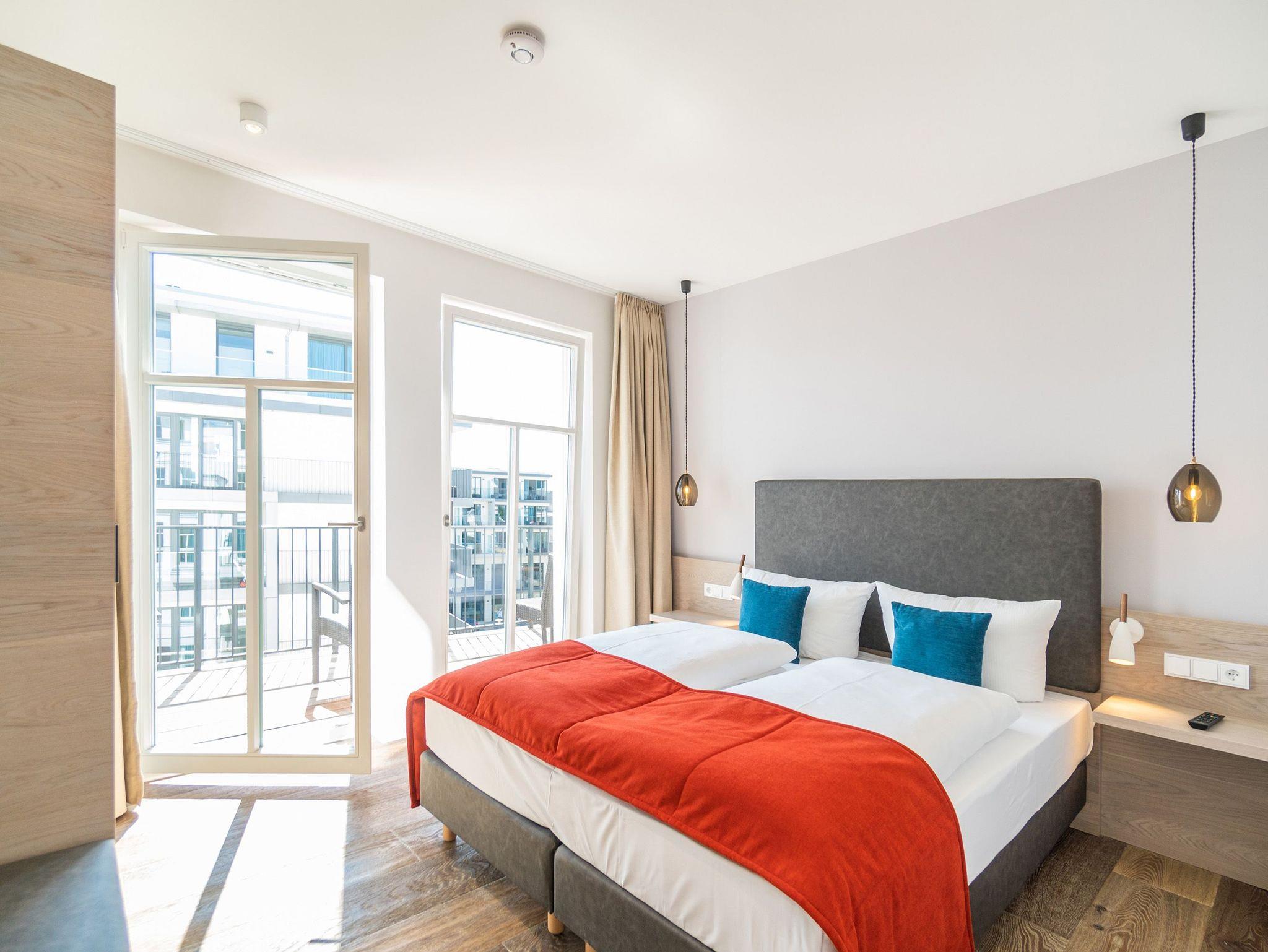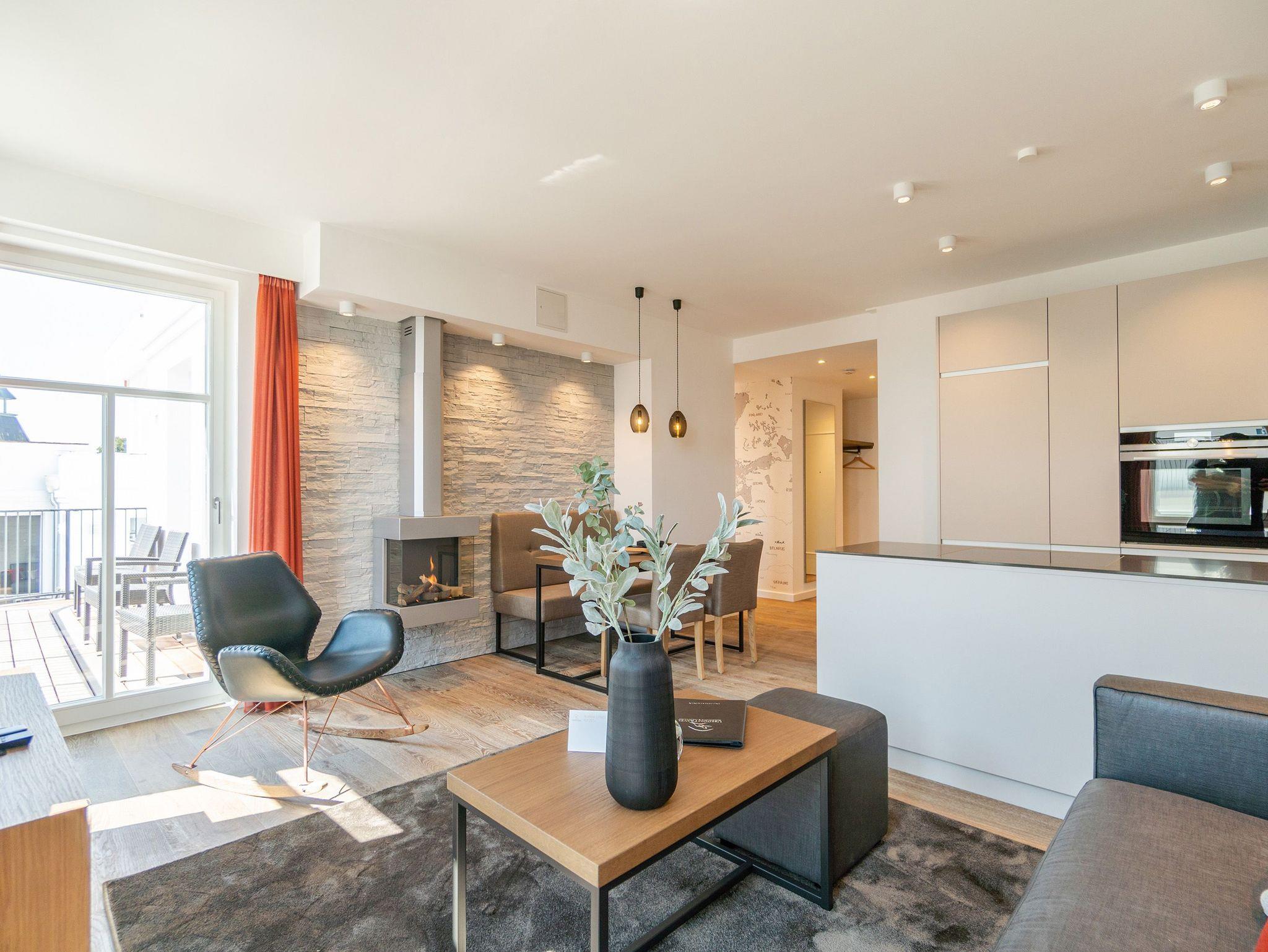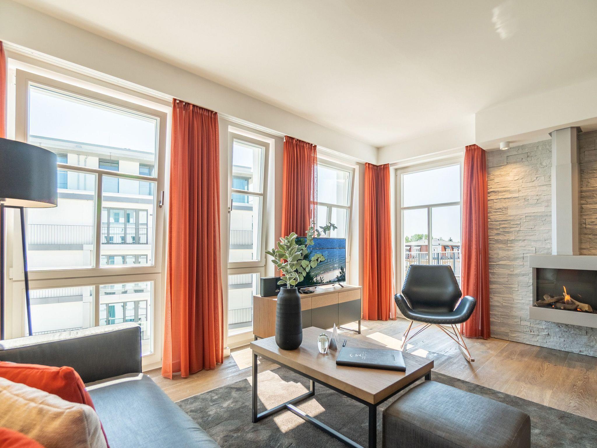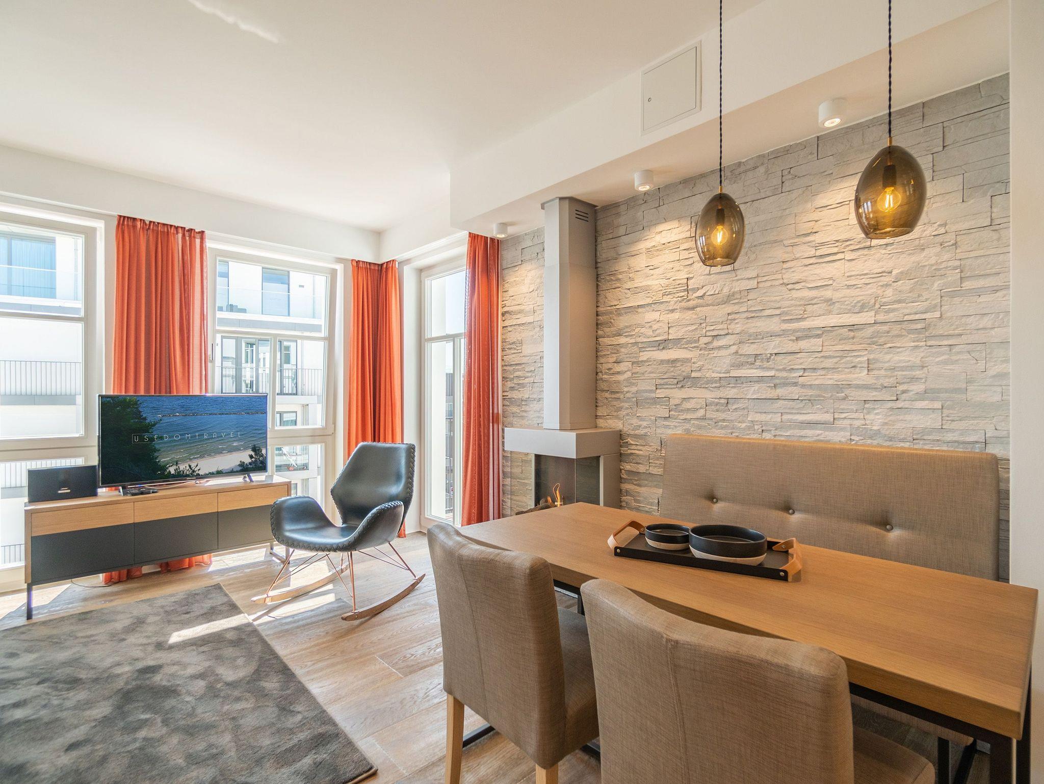 Von der Sonne verwöhnt wird dieses wunderschöne, 66 Quadratmeter große Appartement im 3. Obergeschoss. Schon direkt nach dem Aufstehen können Sie auf dem Balkon nicht nur die Morgensonne, sondern auch den Blick auf die glitzernde Ostsee genießen. Schöner kann der Urlaubstag doch nicht beginnen. Hell und sonnendurchflutet sind auch die drei Räume Ihres Urlaubsdomizils. Exklusivität und modernes Wohndesign treffen hier auf Leichtigkeit und Behaglichkeit. Ausgesuchte Design-Möbel, ein Bose-Soundsystem, das über das Handy bedienbar keine Klangwünsche offen lässt, ein Gas-Kamin, der auf Knopfdruck eine wohlige Kuschelatmosphäre verbreitet die Liste an besonderen Annehmlichkeiten, die dieses Appartement zu bieten hat, ist lang. Das offene Wohn-Esszimmer verfügt über einen riesigen Flat-TV, eine gemütliche Sofa-Sitzgruppe mit Schaukelstuhl, einen schönen, großen Esstisch und eine voll ausgestattete Küche. In dieser werden begeisterte Kochherzen höher schlagen. Denn hochwertige Markengeräte, edles Geschirr von ASA, eine von drei Seiten zugängige Kochinsel alles in modernem und zeitlos schlichtem Design warten nur darauf, dass sie damit ihre kreativen Gaumenfreuden in die Tat umsetzen. Die beiden Schlafzimmer sind mit bequemen Boxspringdoppelbetten (1,60 x 2,00), ablagefreudigen Schränken, Flat-TV und einem Zugang zum umlaufenden Süd-Ost-Balkon ausgestattet. Lassen Sie sich einfach fallen. Den Rest erledigt die wunderbare Wohlfühlatmosphäre. In zwei Bädern können sich Auszeithungrige frisch machen. Beide Badezimmer besitzen geräumige Regen-Duschen, einen großzügigen Waschtisch und ein WC. Wellness-Highlight des Masterbades ist eine Panoramasauna, die eine ganz private Entspannungsauszeit an kühlen Tagen oder Abenden erlaubt. In der Wohnung gibt es einen kleinen Abstellraum mit einem Waschtrockner. Bei uns wird Rundum-sorglos groß geschrieben. Darum sind bei Ihrer Anreise die Betten bezogen und Handtücher liegen für Sie bereit. Zudem ist das WLAN in der Wohnung kostenfrei. In der hochmodernen Tiefgarage ist für Sie der Pkw-Stellplatz Nr. 21 reserviert.