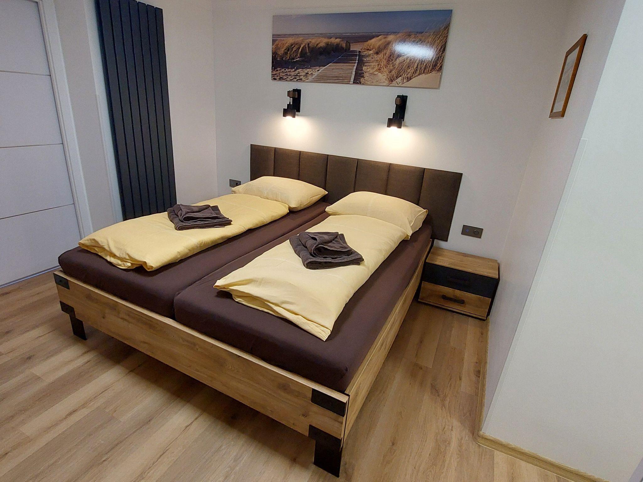 Ihr Ferienunterkunft verfügt über ein Schlafzimmer, Wohnzimmer, Pantryküche und ein Badezimmer. Das Schlafzimmer bietet ein Doppelbett von zwei Einzelbetten a 0,80m x 1,90m. Ein weiteres Einzelbett (0,80m x 1,90m) steht im Wohnbereich zur Verfügung. Ihre mitgebrachte Kleidung können Sie in den Kleiderschrank legen. Nehmen Sie an dem Esstisch mit vier Stühlen Platz. Die Küche ist mit Herd, Kaffeemaschine, Kühlschrank, Toaster und Wasserkocher ausgestattet. Im Wohnzimmer erwartet Sie ein Sat.-TV. Das Badezimmer begrüßt Sie mit einer Dusche, Toilette und einem Waschbecken. Bettwäsche und Handtücher sind im Mietpreis enthalten. Es besteht Zentralheizung. Nutzen Sie gerne die gemeinschaftliche Münzwaschmaschine oder den Münztrockner.