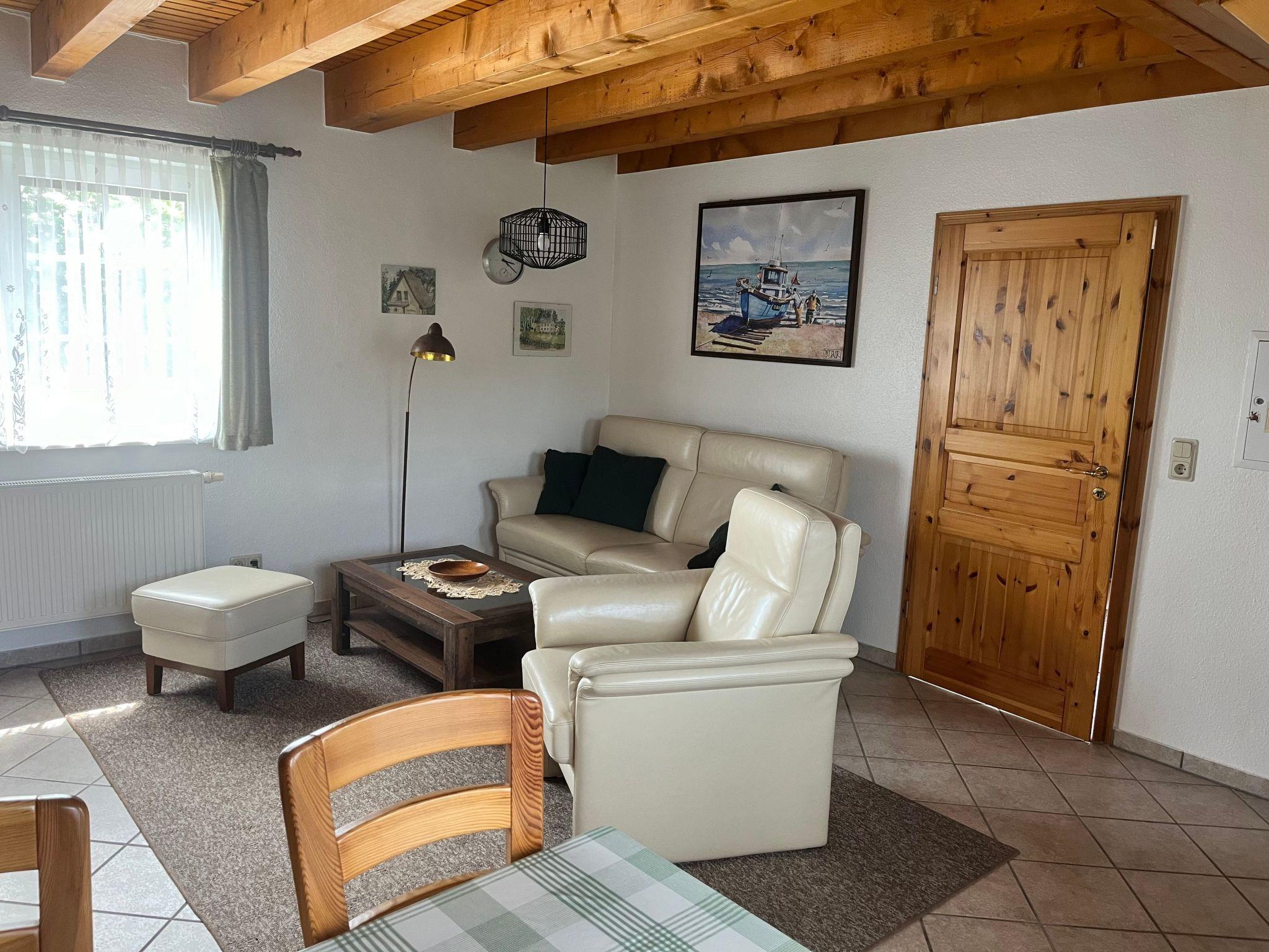 Auf zwei Etagen befinden sich hier das große Wohnzimmer mit Essecke, Küche, ein Bad, zwei sep.Schlafzimmer, sowie ein zweites WC in der oberen Etage. Die Küche ist komplett ausgestattet. Dem FH ist eine Terrasse in Südausrichtung vorgelagert. EIN PKW-Stellplatz steht Ihnen direkt vor dem Haus zur Verfügung. Die Erstausstattung mit Bettwäsche und Handtücher sind im Preis inbegriffen, weitere Wäschewünsche gegen Gebühr. WLAN ist auf dem Grundstück verfügbar, Qualität ist schwankend. Beachten SIe bitte, dass es nur EINEN PKW-Stellplatz pro Haus gibt.