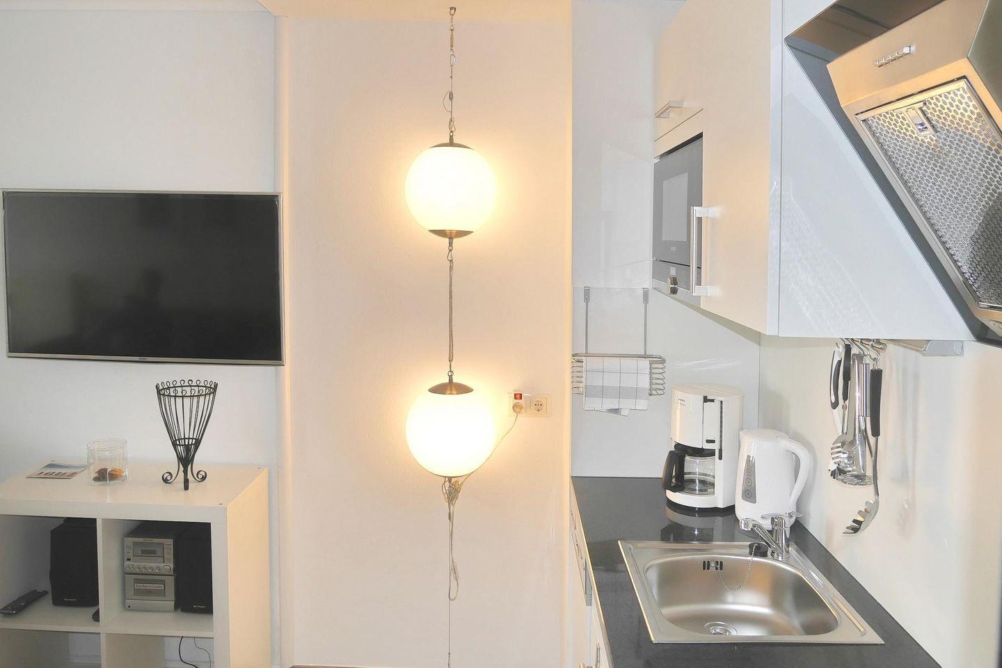 Das Apartment verfügt über kostenfreies WLAN und eine voll ausgestattete offene Küche mit Wasserkocher, Kaffeemaschine, Toaster, Ceranherd, Backofen, Geschirrspüler, Mikrowelle und Tiefkühlfach. Ein Wohnbereich mit HiFi-Anlage und Flachbild-TV vervollständigen die Ausstattung des Apartments.