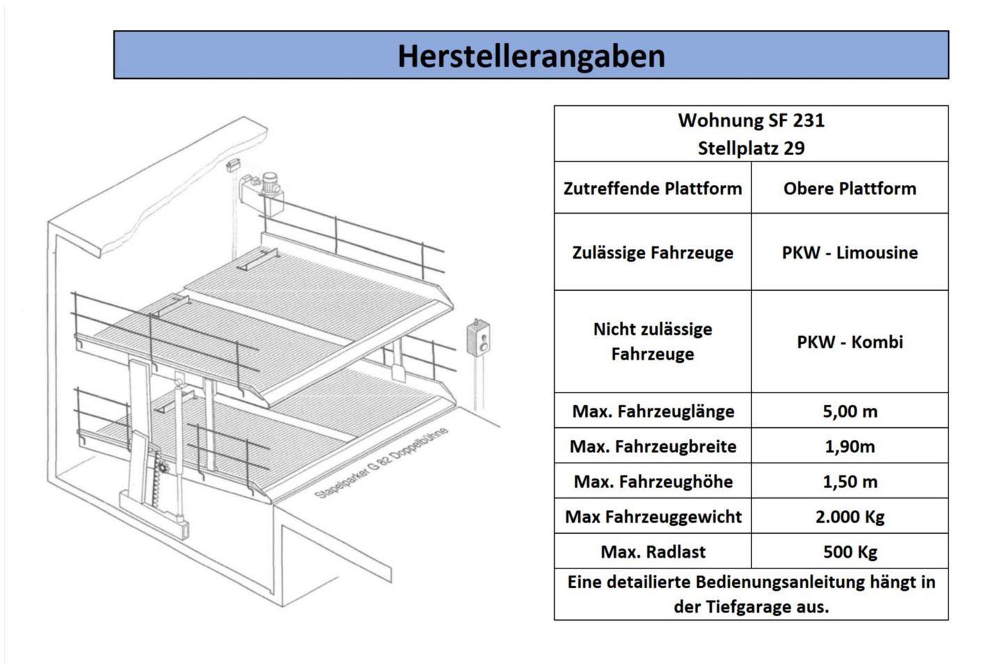 Ihr könnt einen PKW-Stellplatz in der hauseigenen Tiefgarage mit Doppelparksystem gegen Aufpreis hinzubuchen. Bitte gleicht die Maße eures PKW mit den Herstellerdaten sorgfältig im Vorfeld ab (siehe „Bildergalerie“). Alternativ kann euch die Gästebetreuung einen Stellplatz in der Tiefgarage Seepark, ca. 900 m entfernt, unter der Telefonnummer 038378-465020 reservieren (gegen Entgelt und nach Verfügbarkeit).