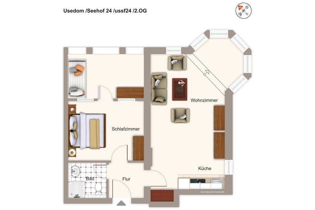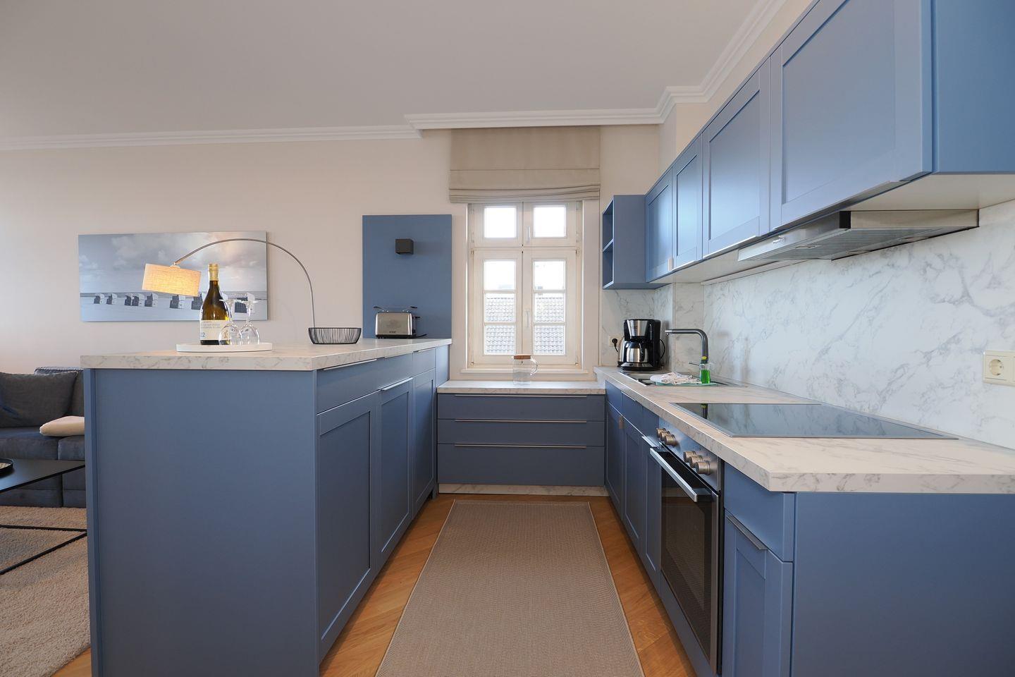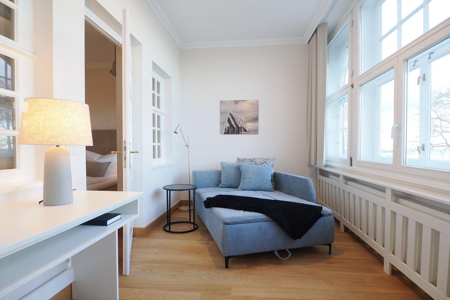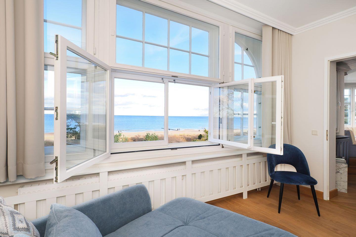 Das Apartment mit 2 Zimmern, 56 qm und einem Erker mit schönem Ostseeblick bietet Platz für 4 Personen – in stilvollem Wohnambiente und in einzigartiger Strandlage.