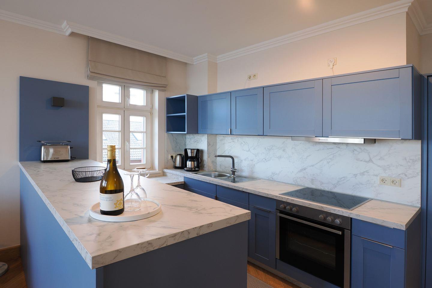 Die Ausstattung wird ergänzt durch eine voll ausgestattete offene Küche mit Wasserkocher, Kaffeemaschine, Toaster, Backofen, Geschirrspüler, Mikrowelle und Tiefkühlfach.